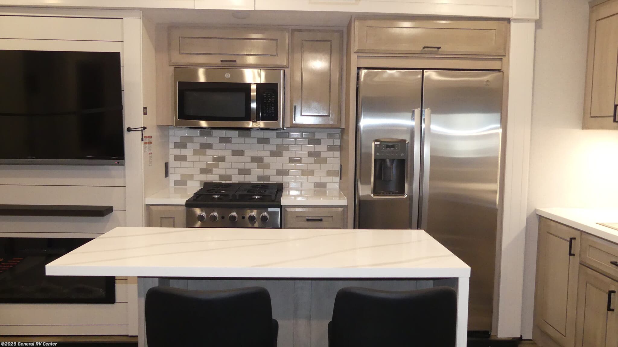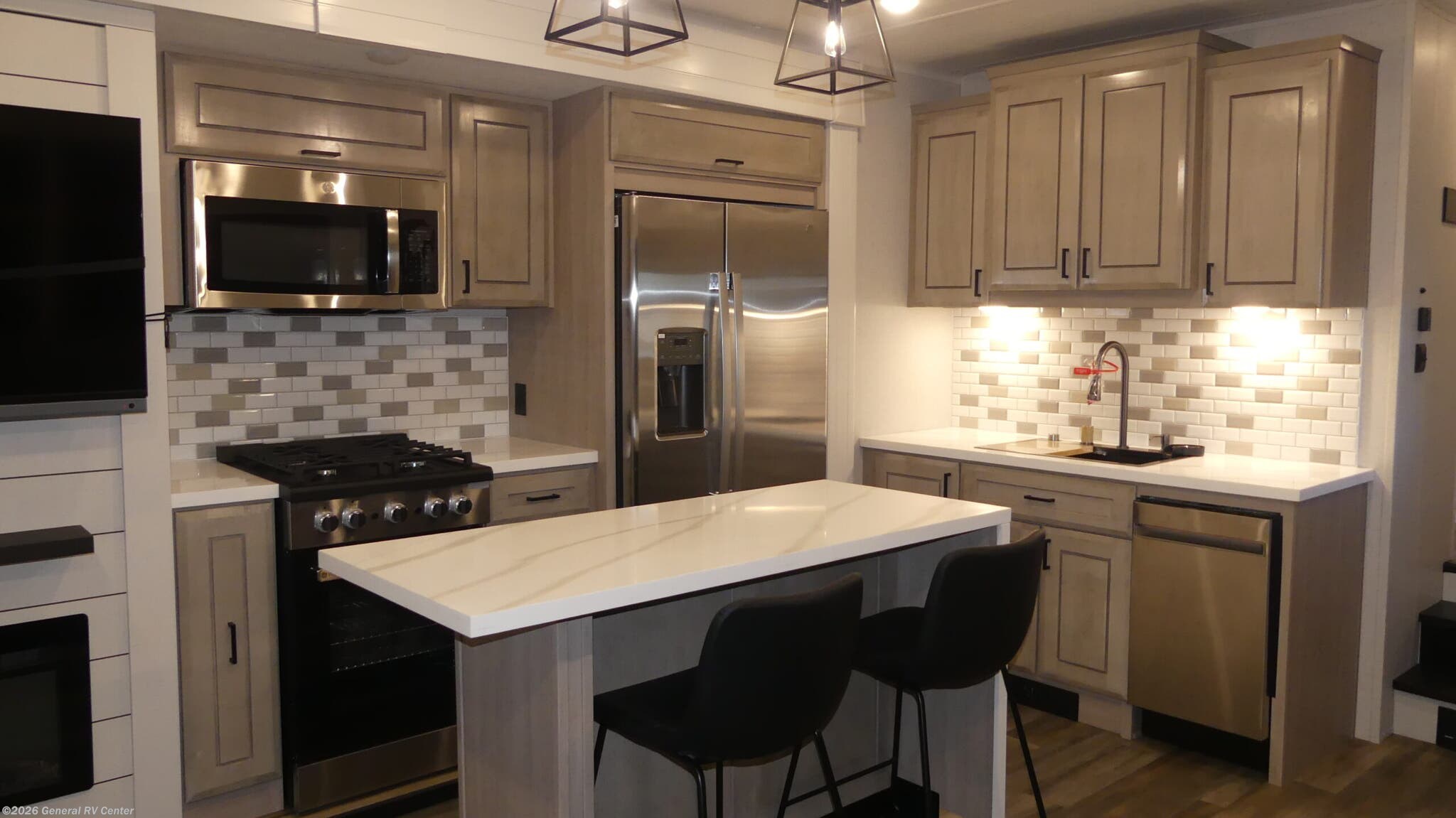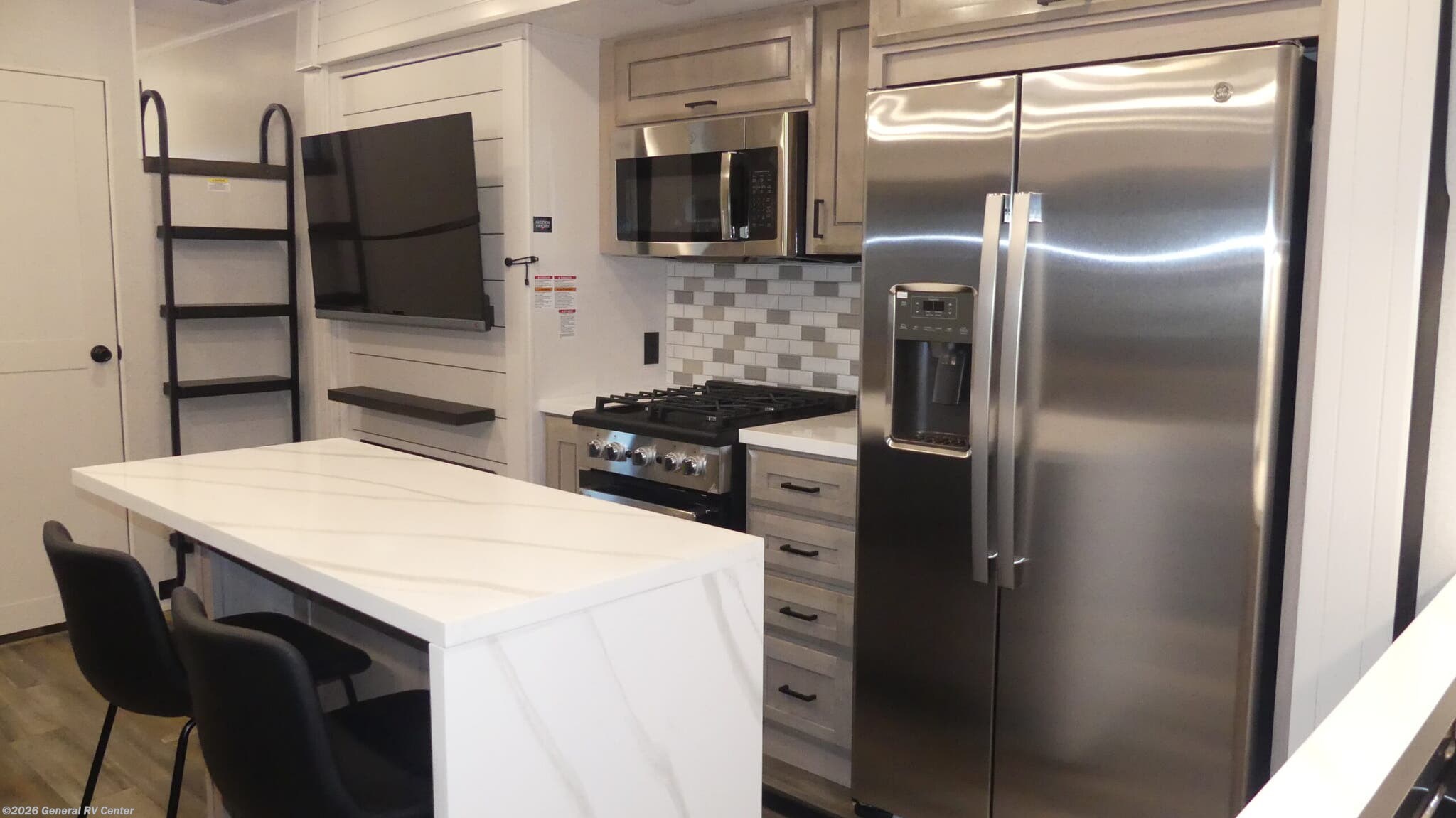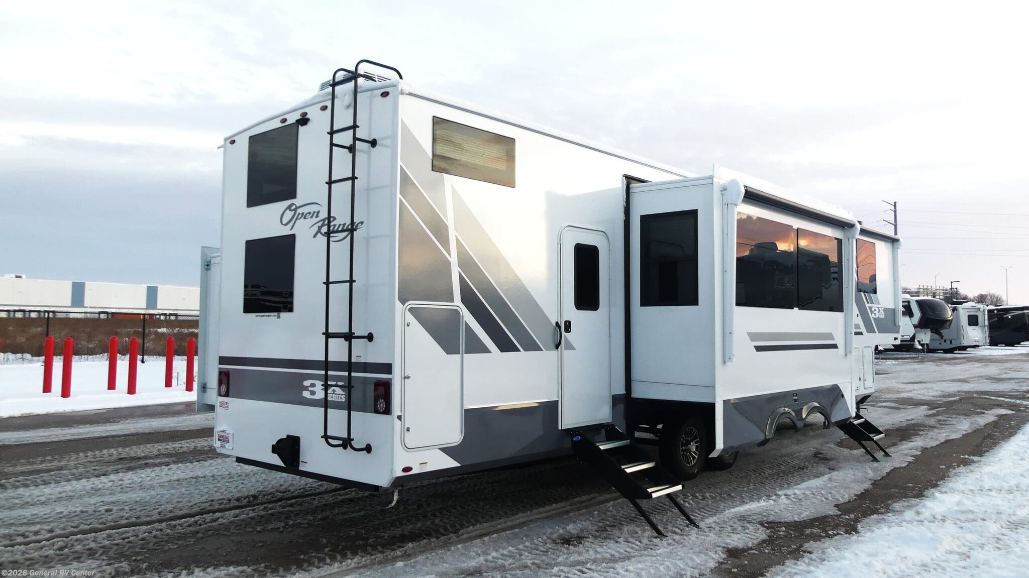 **Open Range RV Open Range 3X fifth wheel 390TBS highlights: ** * Four Slide Outs * Two Master Bedrooms * Two Power Awnings * Loft * Dual Entry Doors * Outdoor Kitchen If you enjoy luxury camping or you're looking for a residential fifth wheel to go full-time in, this Open Range 3X is the one! The middle kitchen and living room is made open by the dual opposing slides, and your crew can get comfortable on the mega lounge with two tables. The chef of your group will love cooking on GE free-standing four burner range, or they can use the GE residential microwave to heat up leftovers. The standard dishwasher and central vacuum make cleanup a breeze. A waterfall island with four chairs will provide a place to dine and the hidden pantry behind the swing-out entertainment center can hold snacks galore. There is also a fireplace and smart HDTV to make movie nights cozy. The front master bedroom includes a slide out king bed with a power tilt, two dressers, a large front closet, and a 32" TV to watch shows in bed. You even have your own entrance into the full bath, plus washer and dryer prep. The rear master bedroom is just as accommodating with a queen bed slide out, a wardrobe and a dresser, plus a second full bath with its own exterior entry door. And the loft above the rear bedroom provides even more sleeping space. With any Open Range 3X fifth wheel by Open Range RV, you will enjoy residential luxuries and an exceptional build. The TuffShell construction includes vacuum bonded laminated fiberglass and welded aluminum frames for added strength, and the PVC roofing membrane is ultra durable. You can plan to camp year around or go full-time since there is a mandatory Four Season Package that includes a heated and enclosed underbelly, a 40K BTU high-performance furnace, double insulated baggage doors, and more. The residential features continue on with the mandatory Executive Package with the TravelLINK Smart RV system, Keyed-Alike entry and baggage doors, painted fiberglass front cap with LED lighting, and three 15,000 BTU A/C units with quiet residential return air. Inside, you'll enjoy GE kitchen appliances, sleek square windows with integrated blinds, ceramic subway tile backsplash, a glass shower door, and the list of amenities goes on!