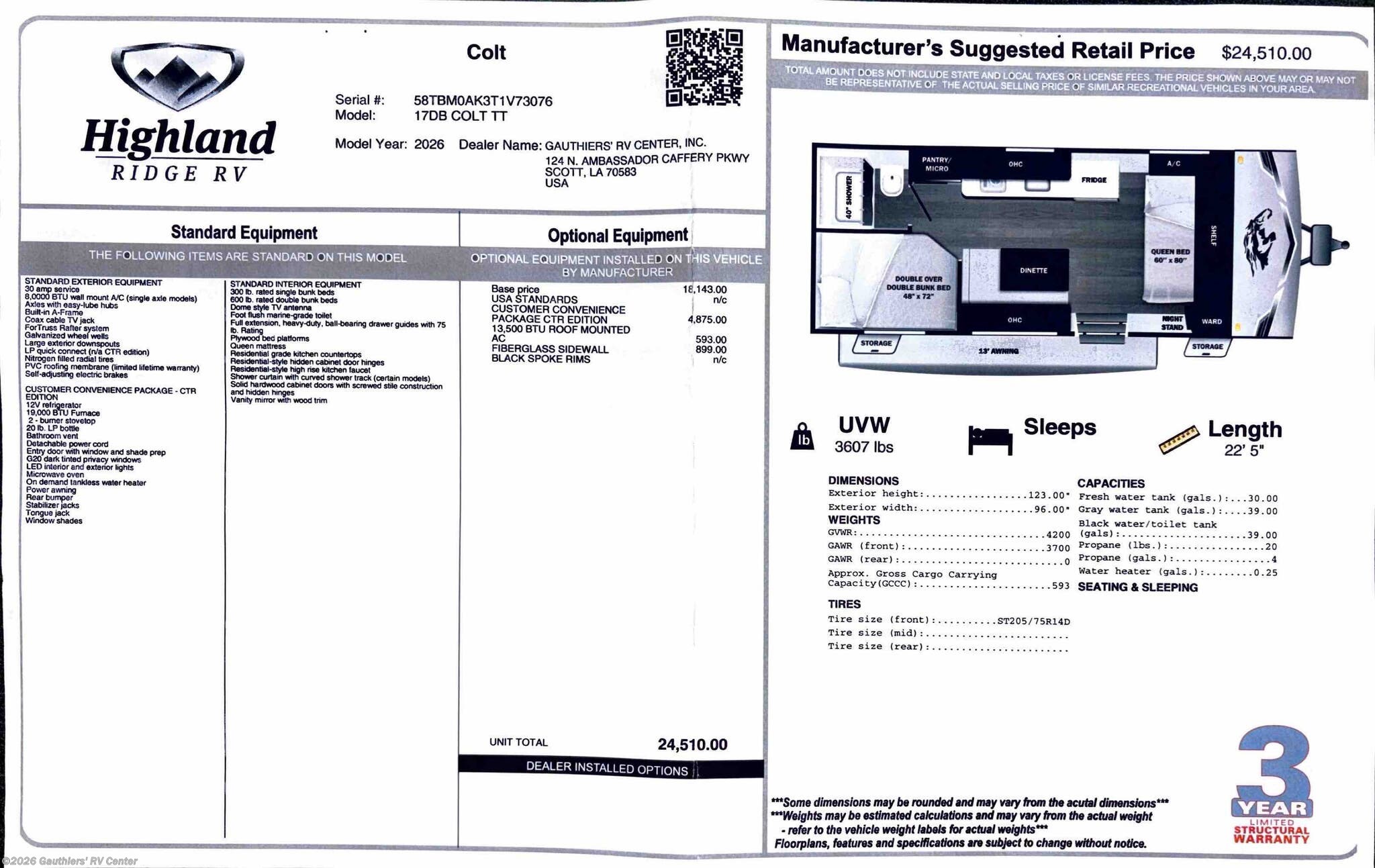 2026 Highland Ridge Open Range Colt CTR Edition 17DB Specifications
