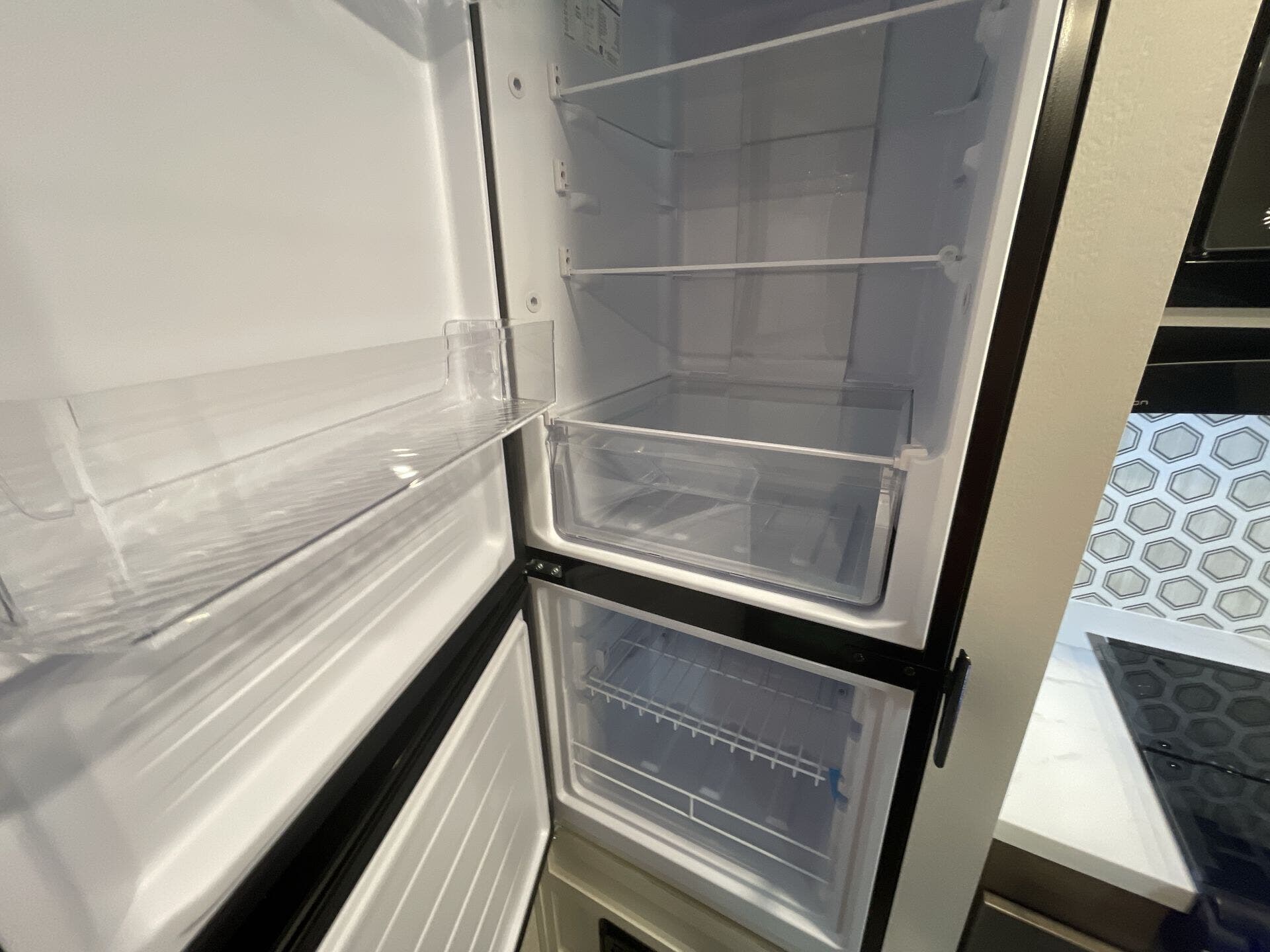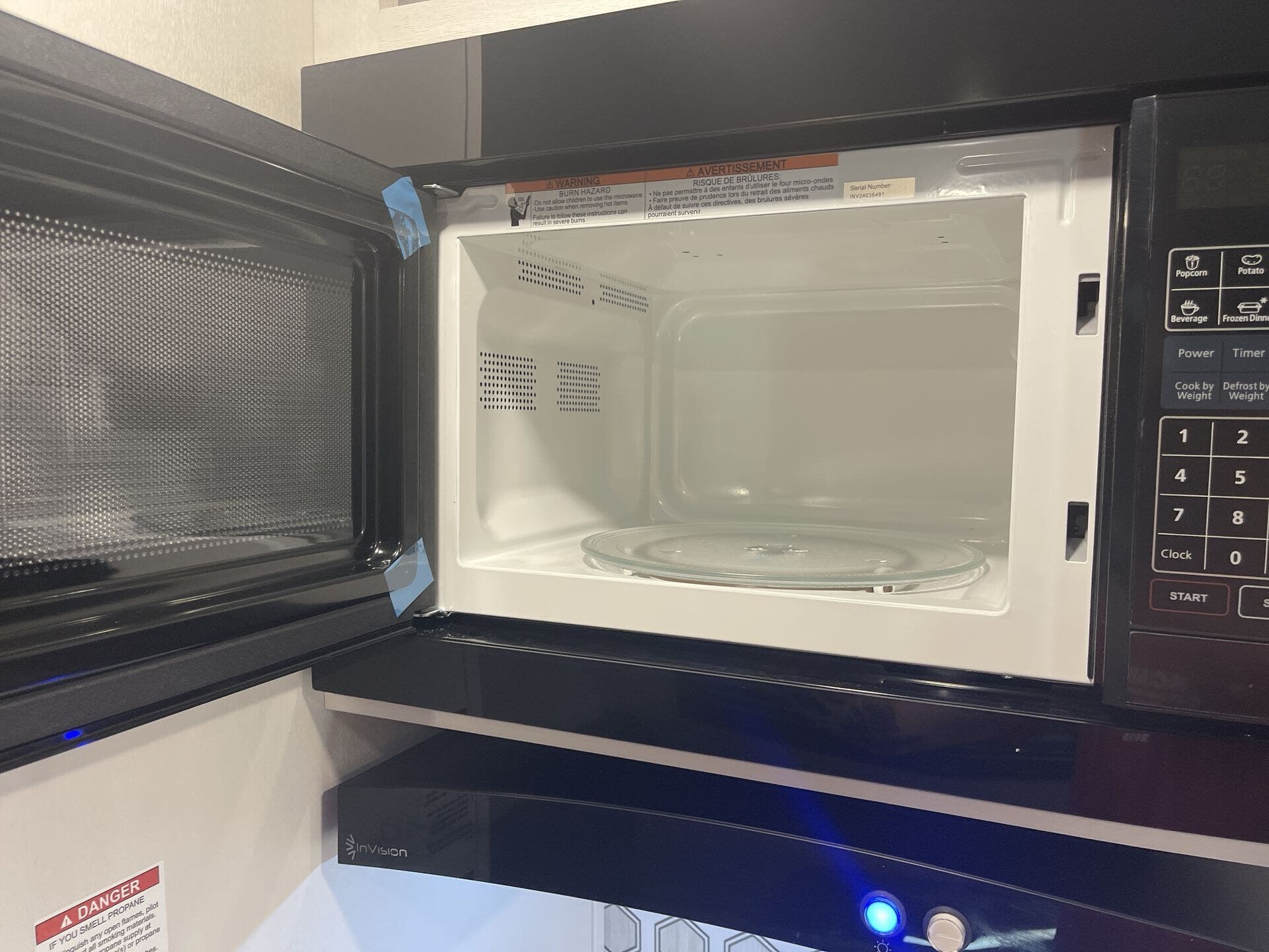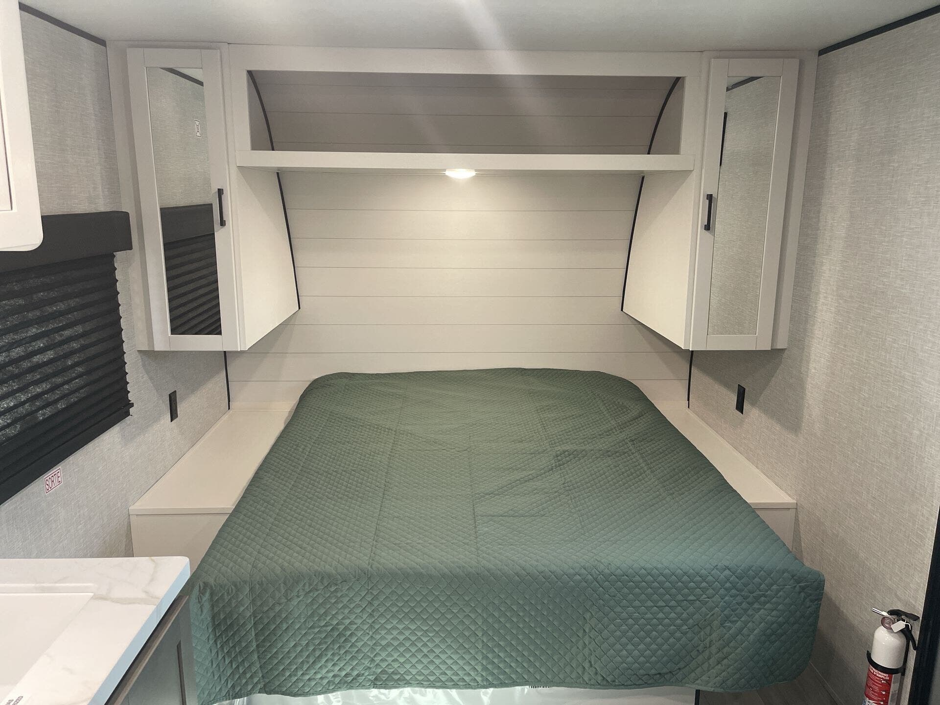 - Essential amenities including microwave, refrigerator, stove top burner, air conditioning, shower, and safety detectors (CO, LP, smoke)