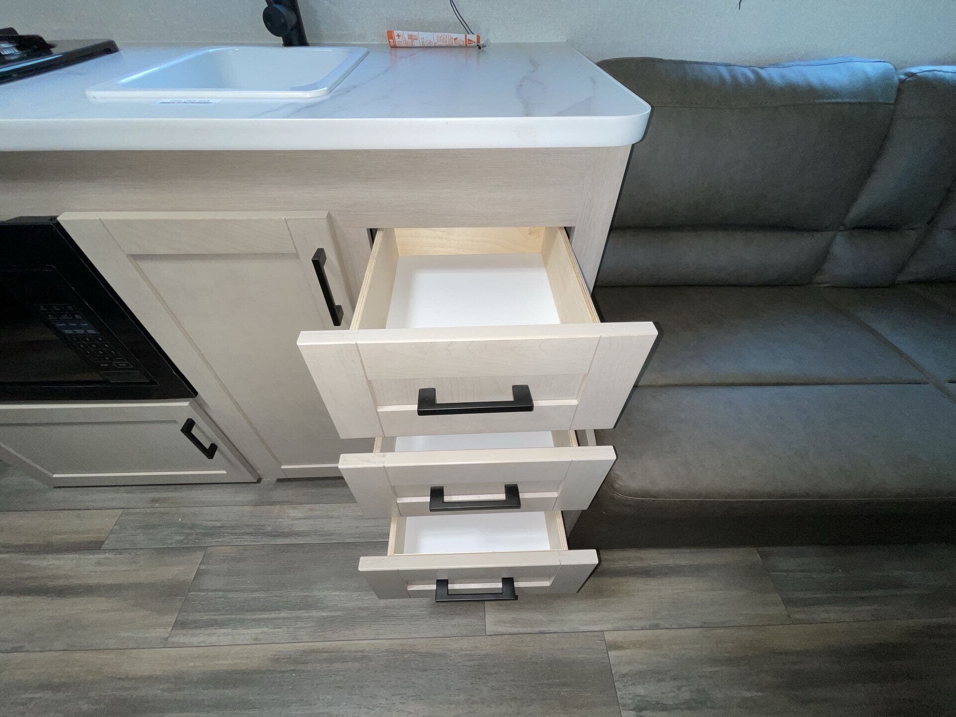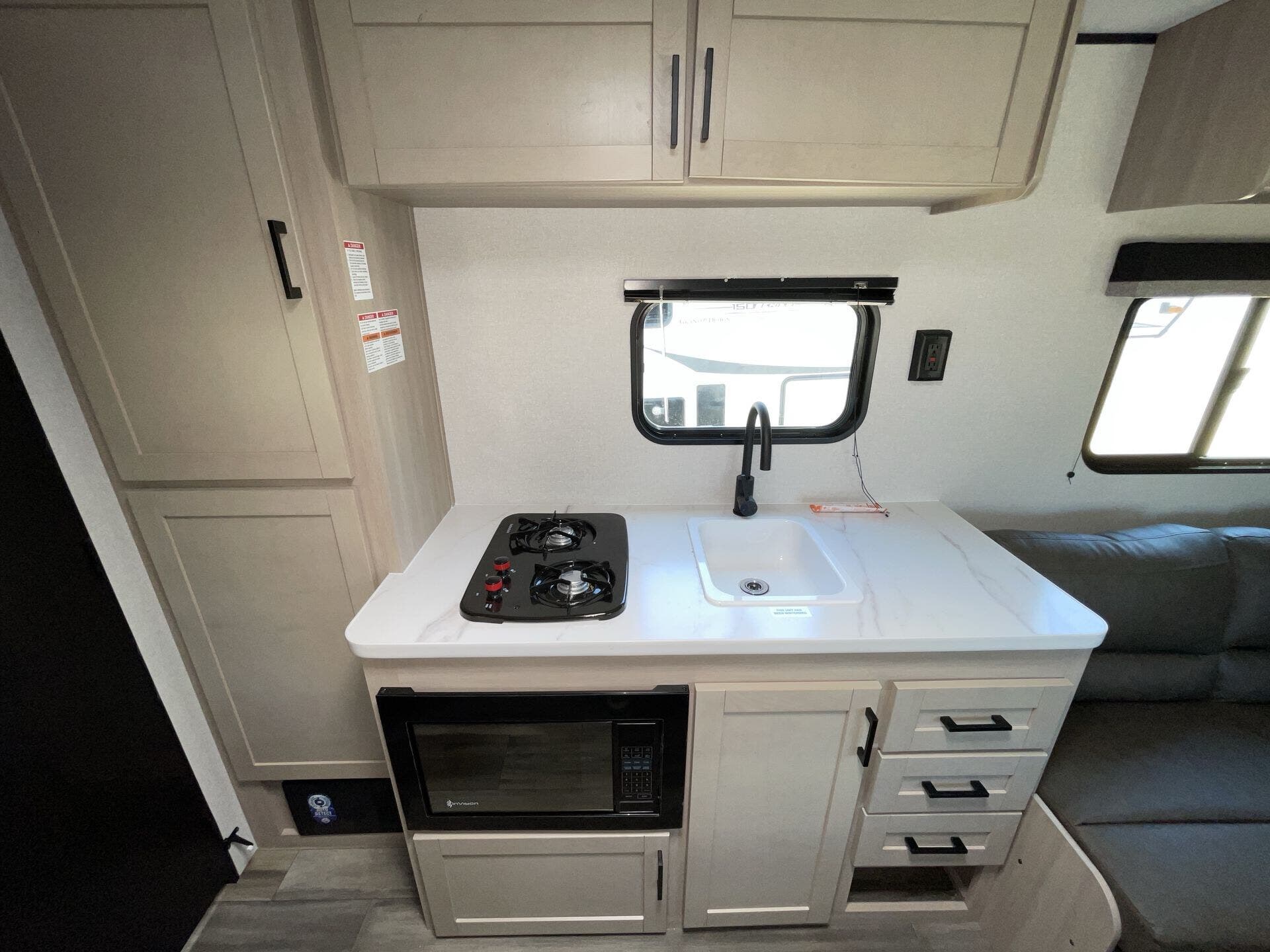 - Furnace, air conditioning, water heater, microwave, refrigerator, and stove top burner for everyday living on the road