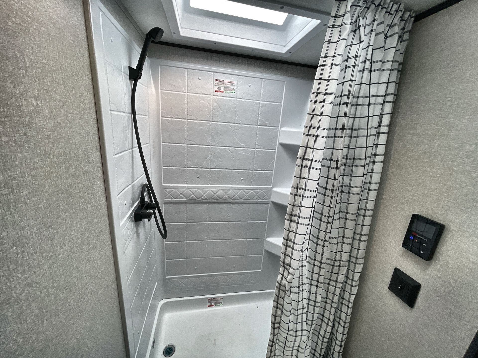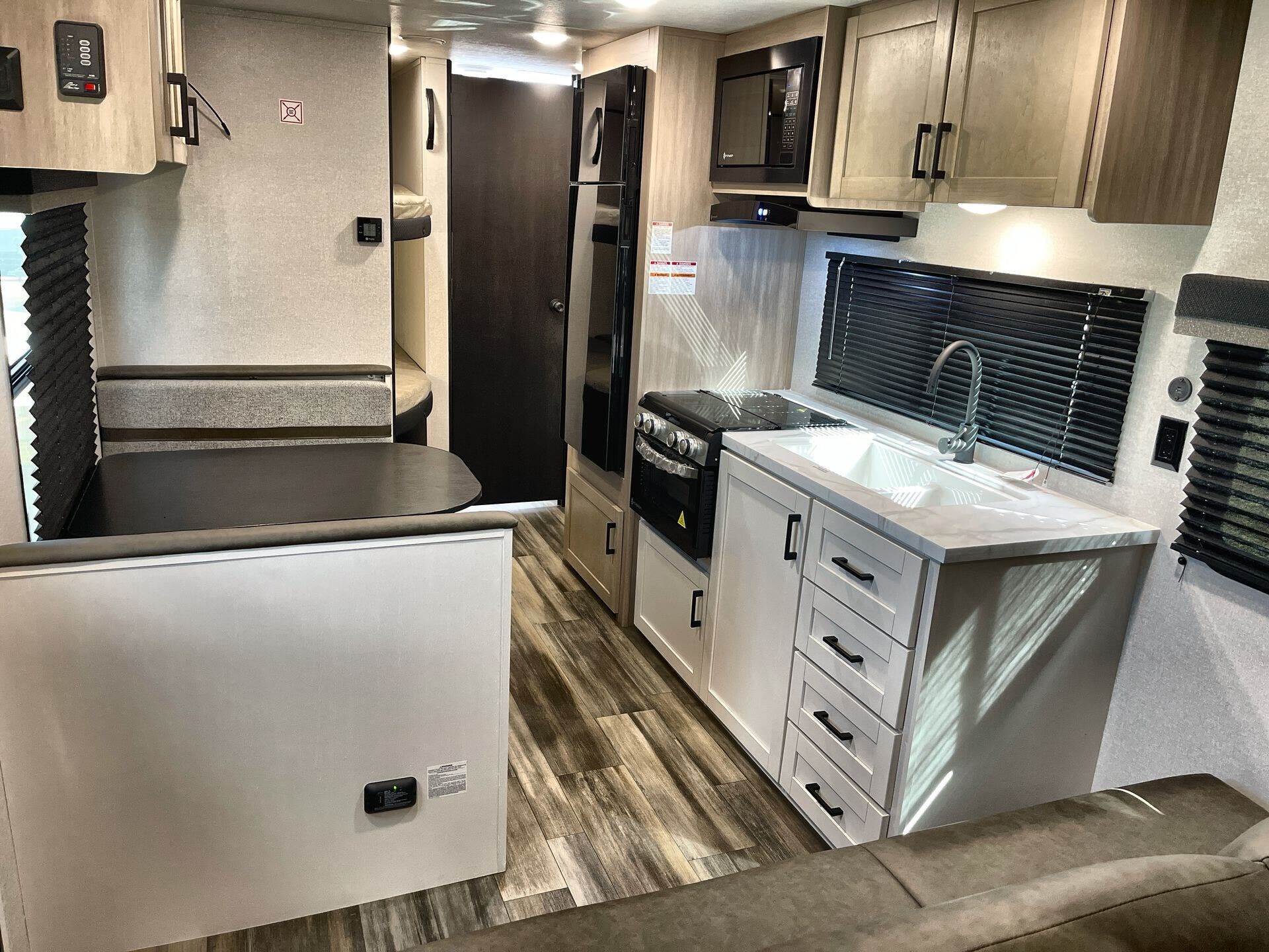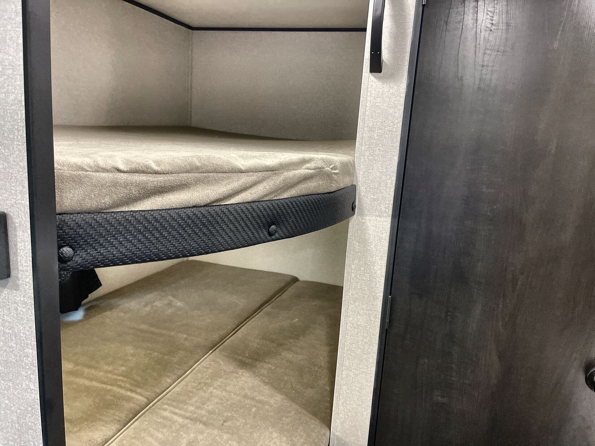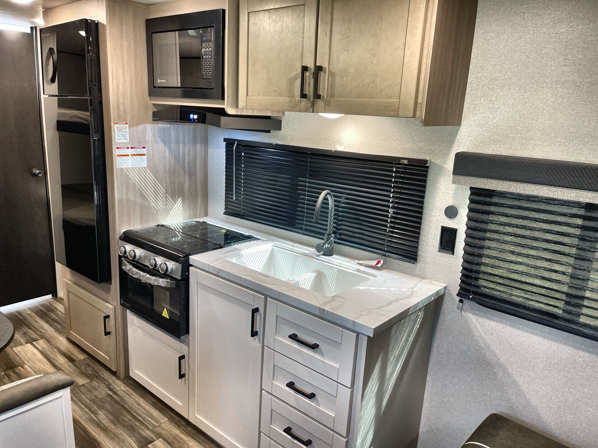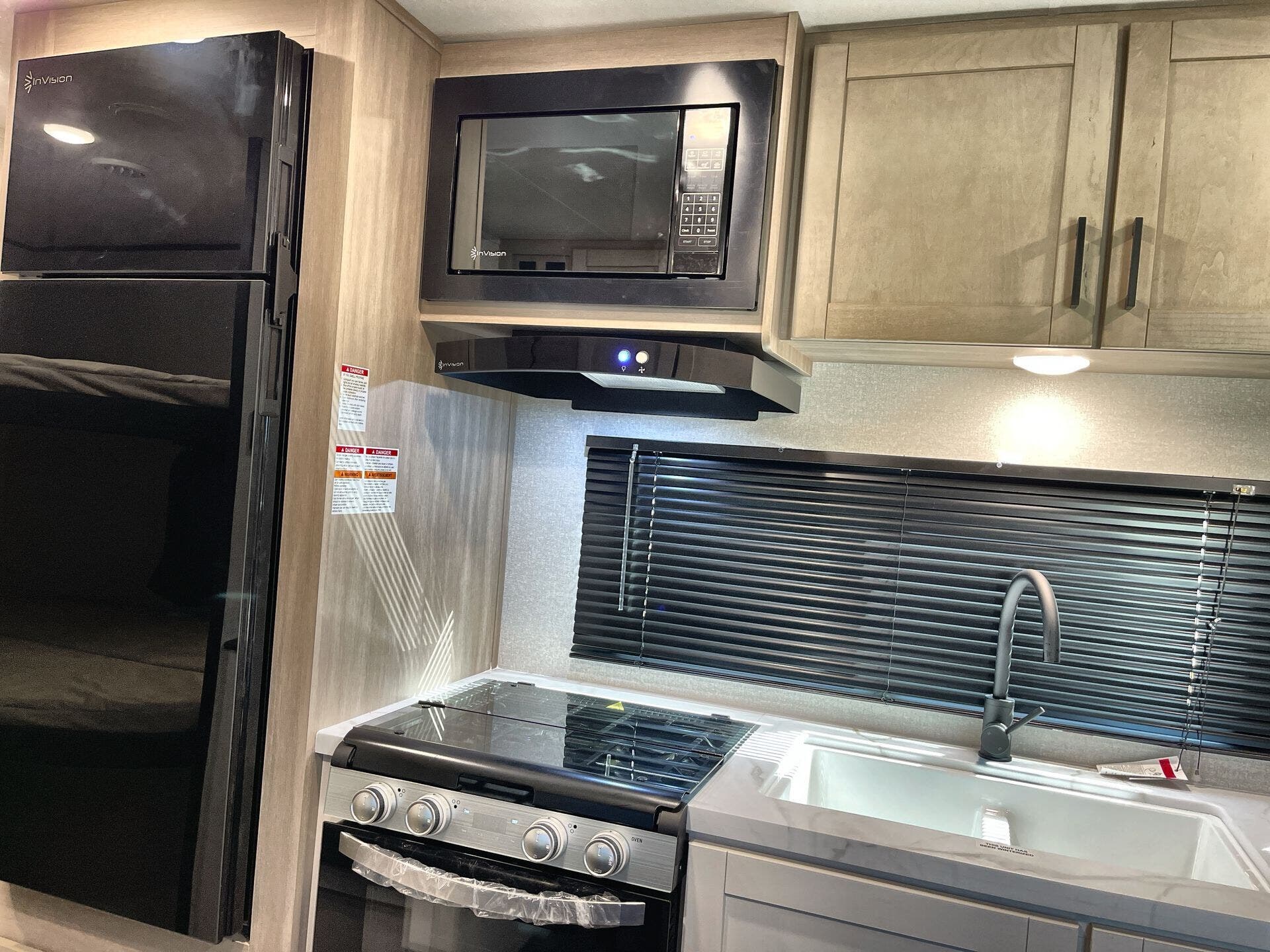 Inside, families will appreciate the bunk beds for kids and guests, a queen bed in the front bedroom, a dedicated shower, and a full bathroom with a toilet. The living area features theater seating for relaxing movie nights, while the mid-kitchen layout provides convenient access to a microwave, refrigerator, stove top burner, and water heater. A medicine cabinet and other storage compartments help keep the space organized on longer trips. This RV prioritizes comfort without sacrificing functionality, making meal prep and daily routines simple on the road.