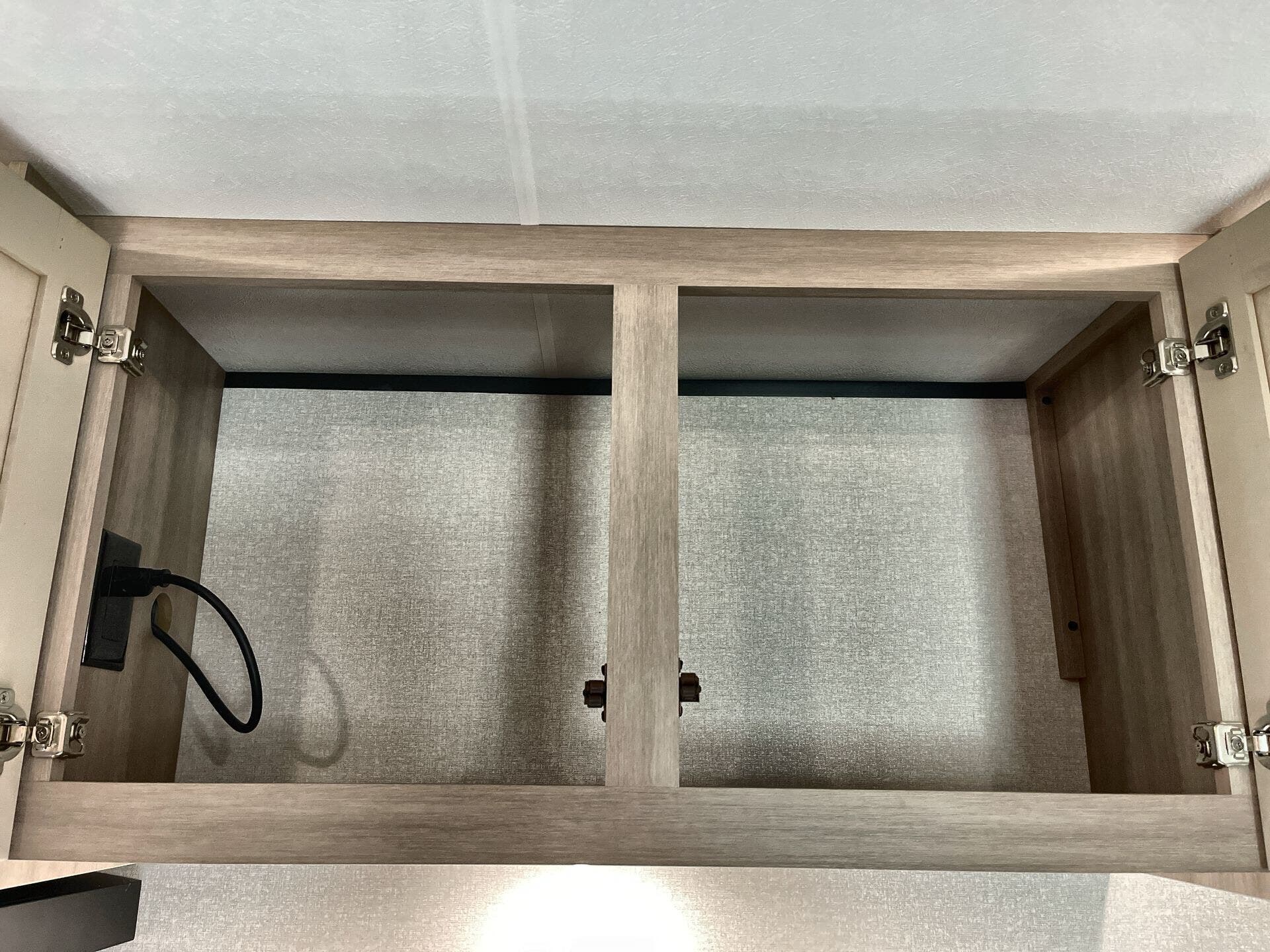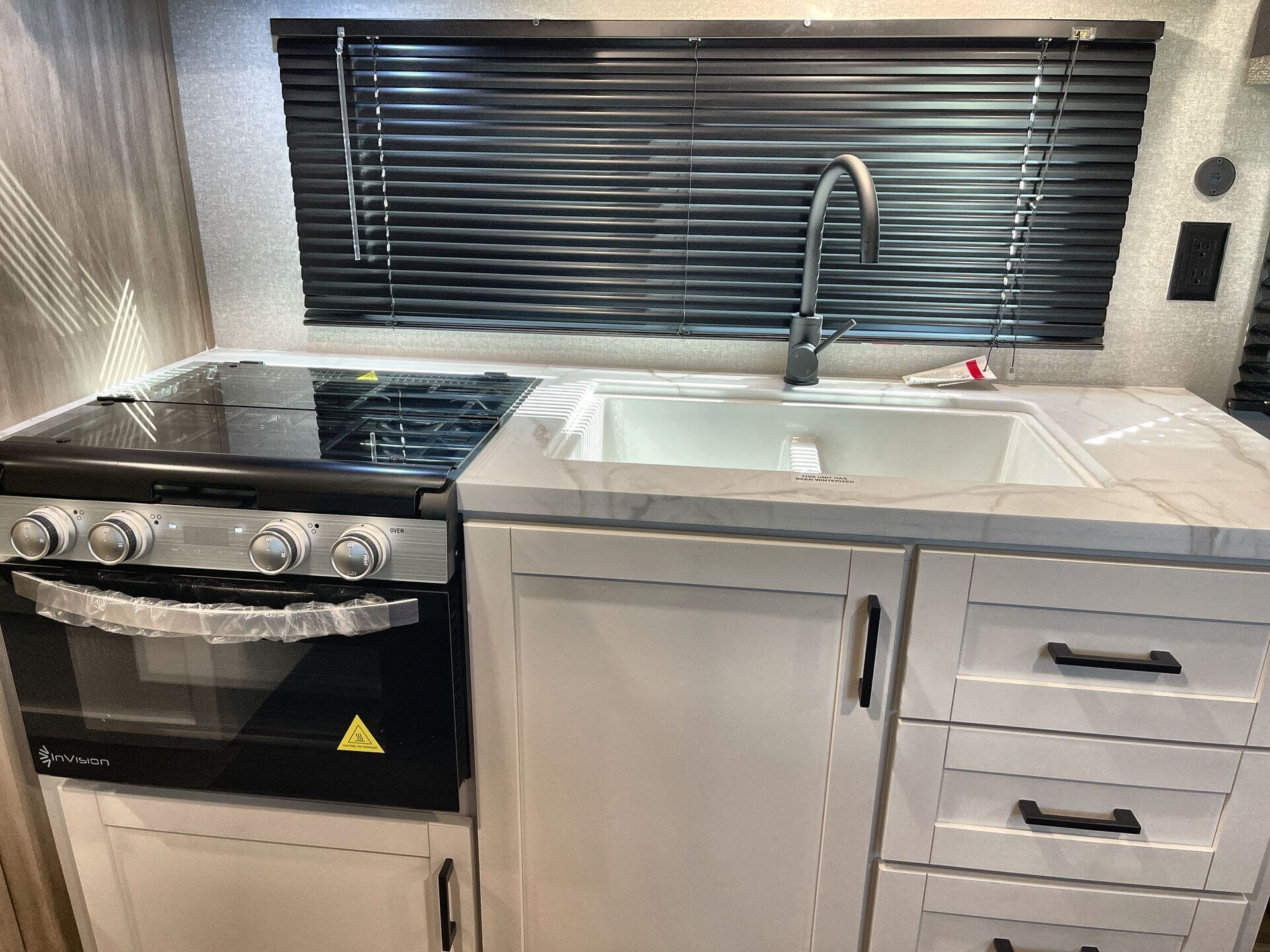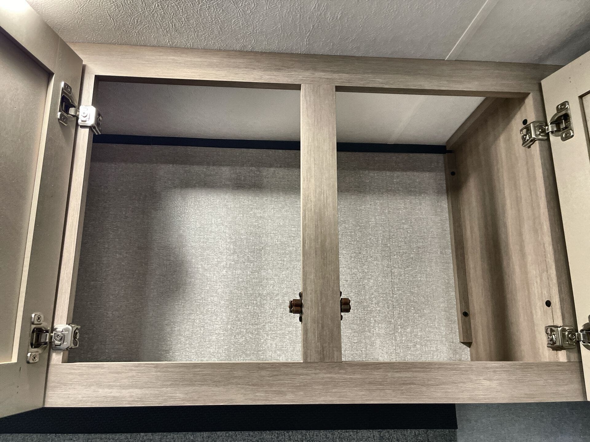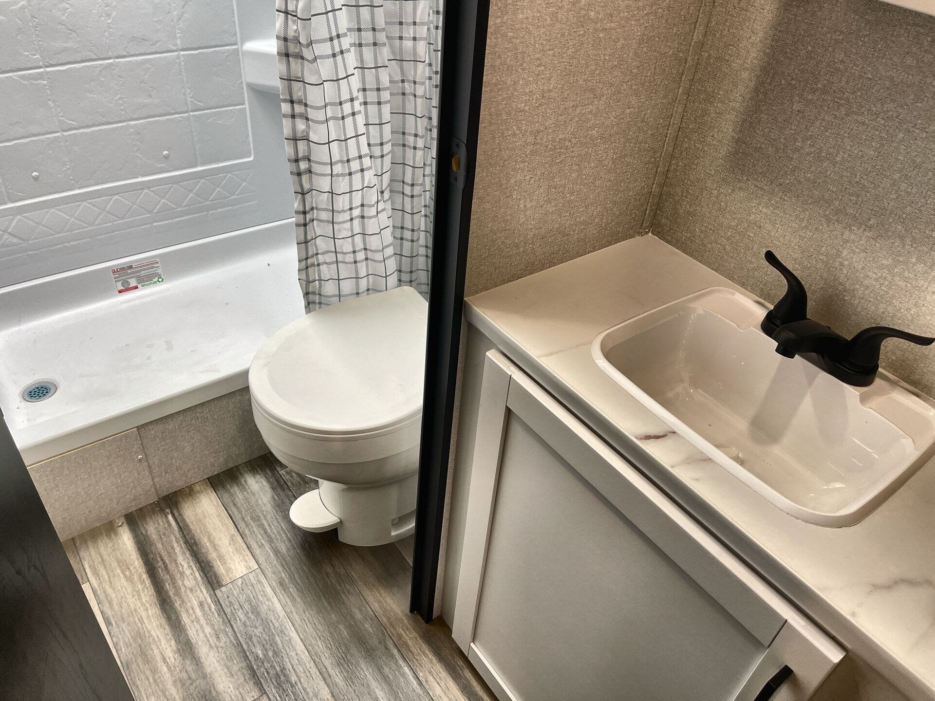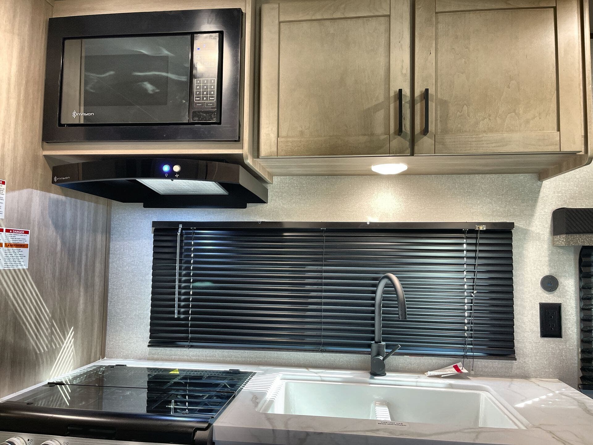 Inside, families will appreciate the bunk beds for kids and guests, a queen bed in the front bedroom, a dedicated shower, and a full bathroom with a toilet. The living area features theater seating for relaxing movie nights, while the mid-kitchen layout provides convenient access to a microwave, refrigerator, stove top burner, and water heater. A medicine cabinet and other storage compartments help keep the space organized on longer trips. This RV prioritizes comfort without sacrificing functionality, making meal prep and daily routines simple on the road.