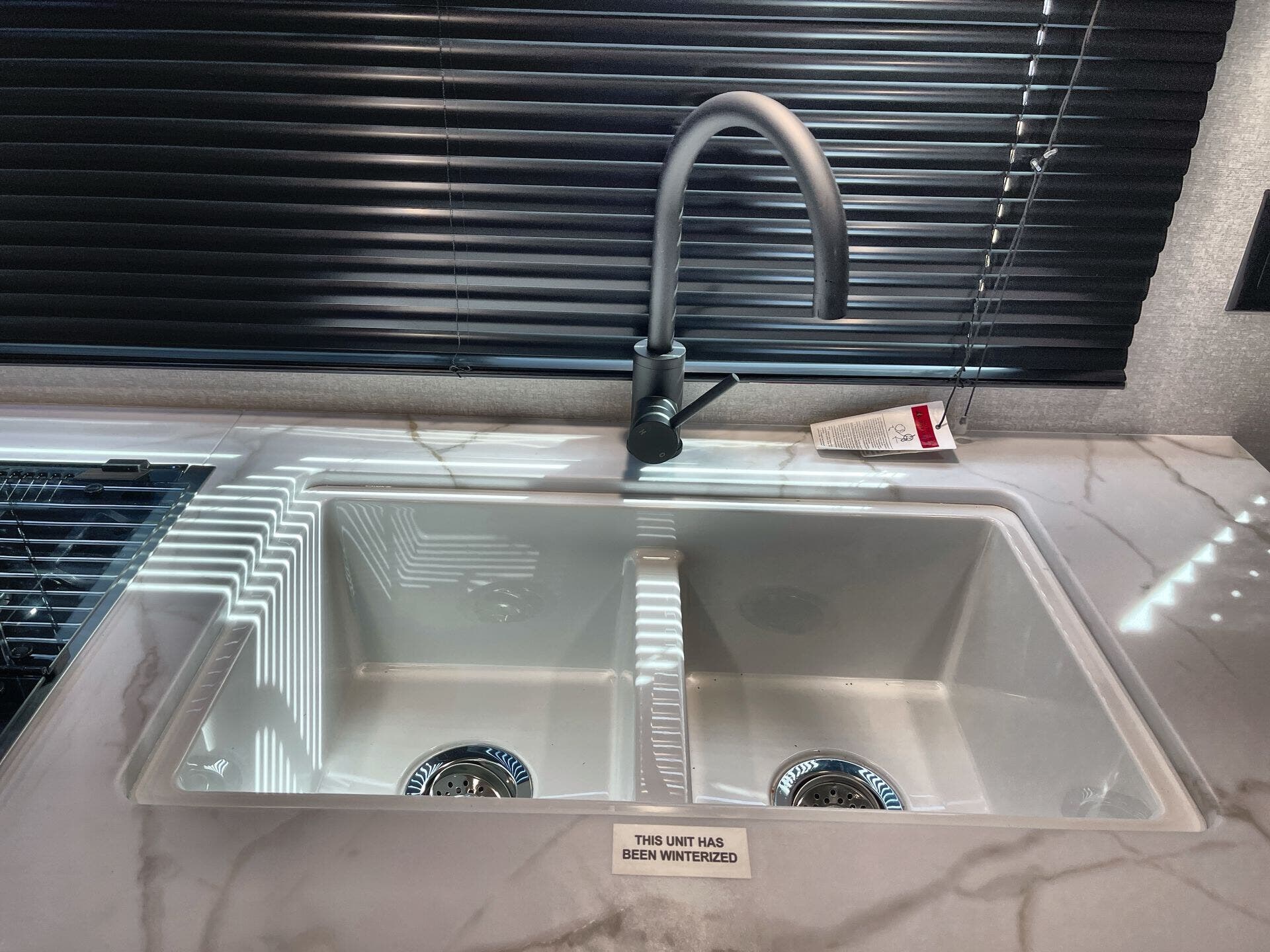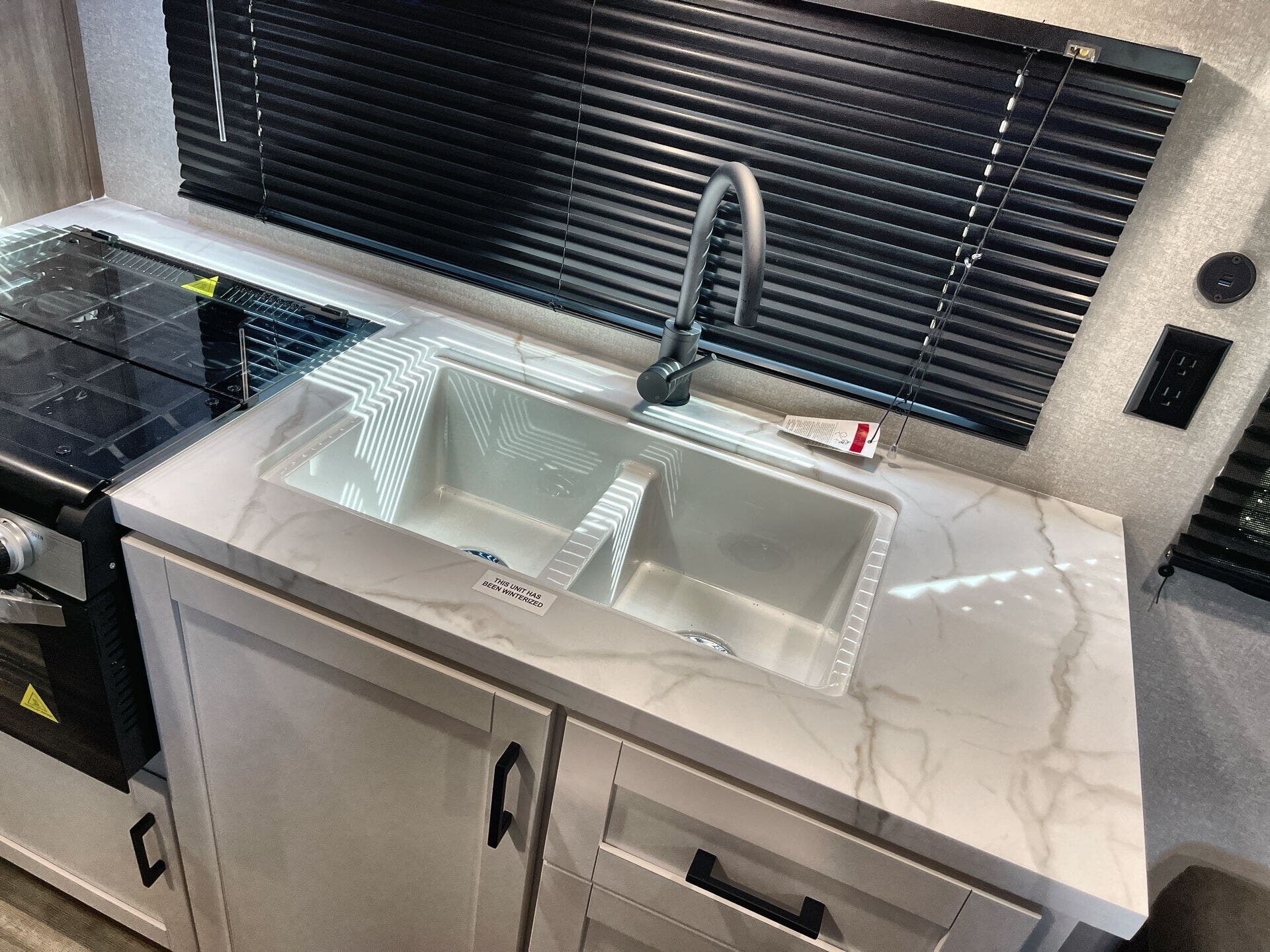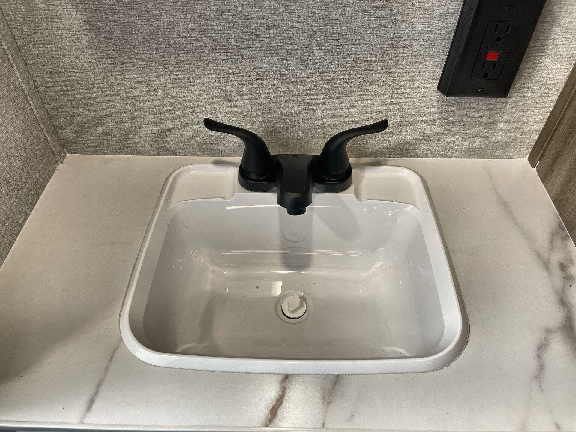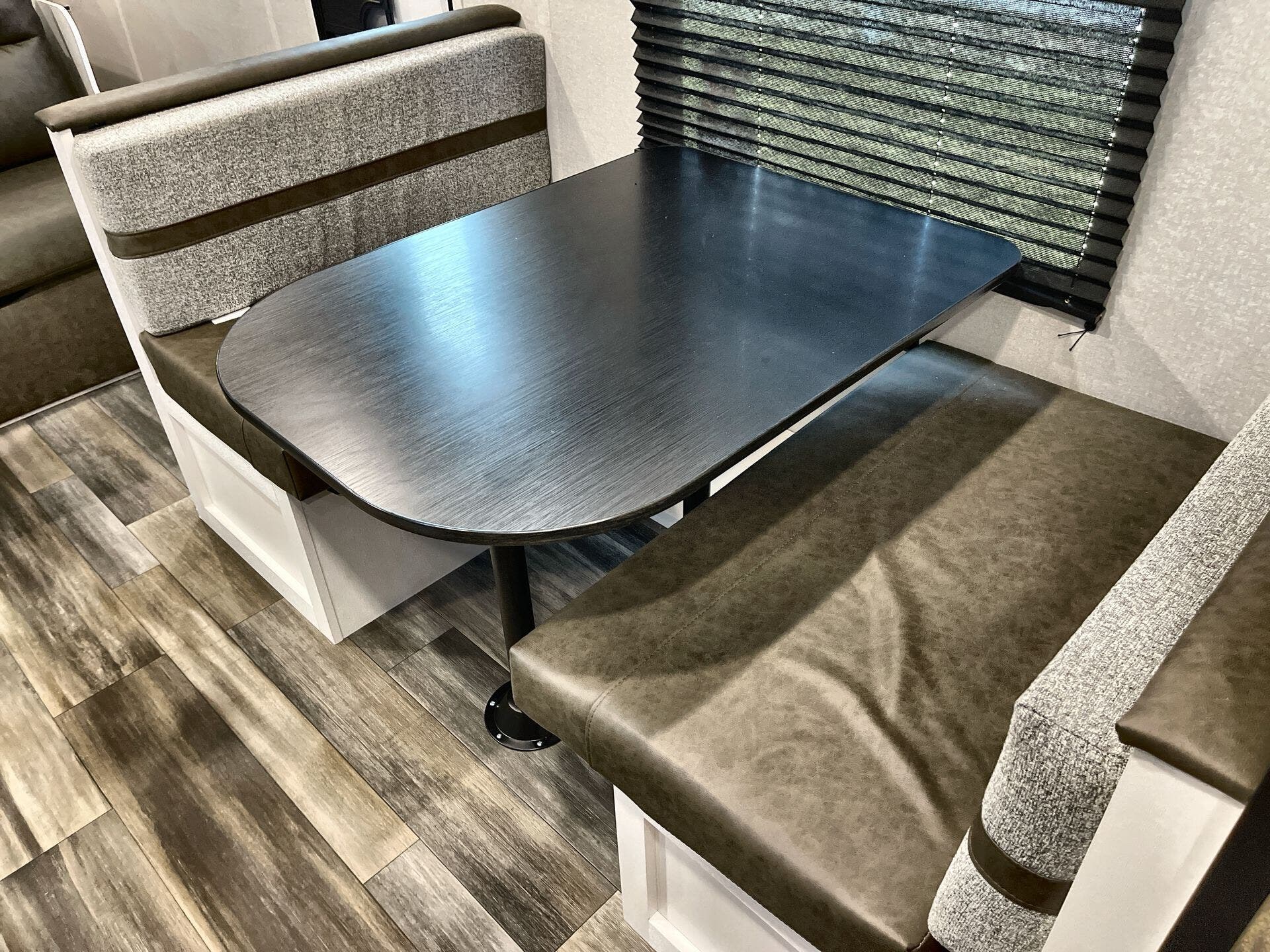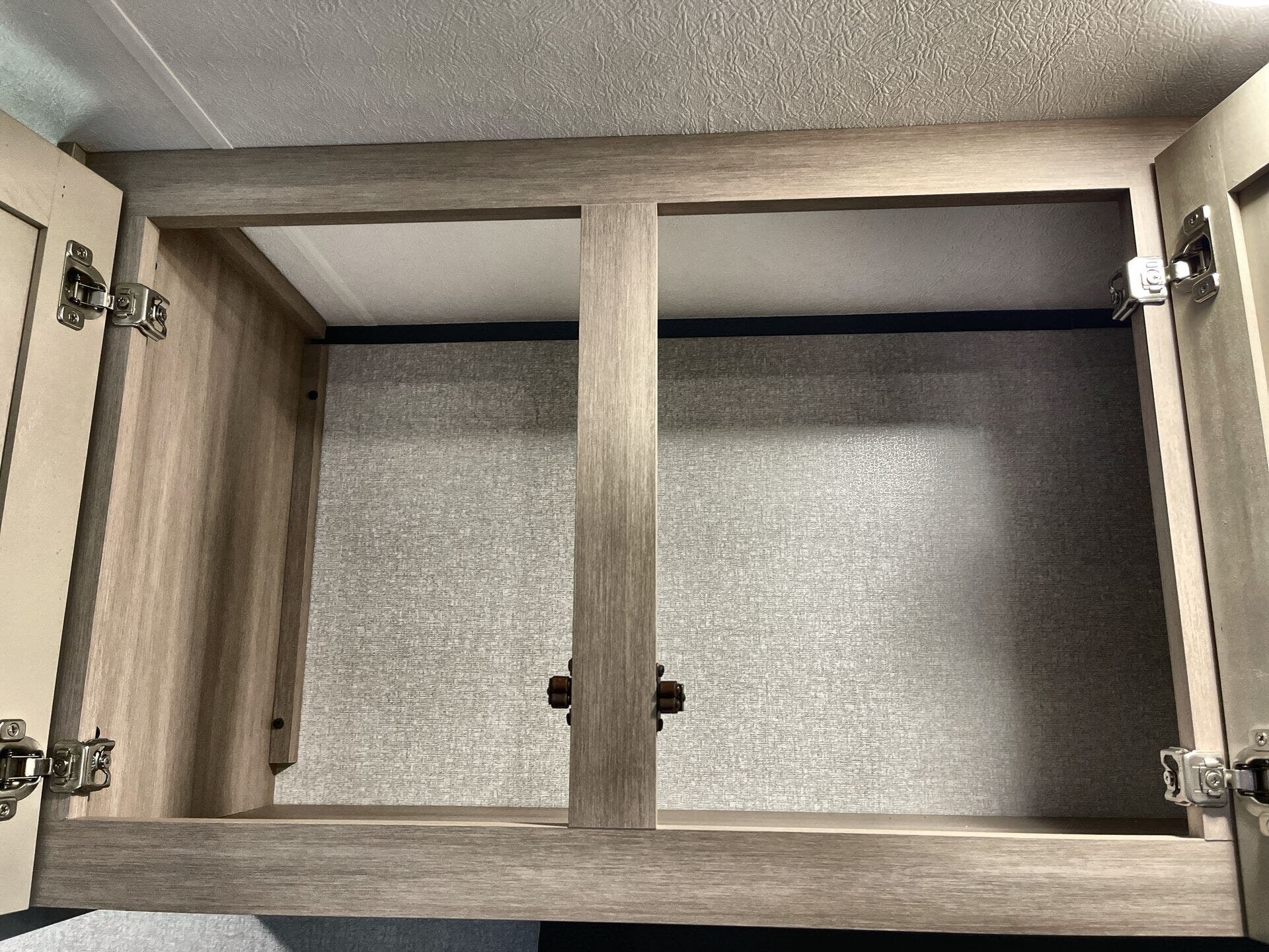 Inside, families will appreciate the bunk beds for kids and guests, a queen bed in the front bedroom, a dedicated shower, and a full bathroom with a toilet. The living area features theater seating for relaxing movie nights, while the mid-kitchen layout provides convenient access to a microwave, refrigerator, stove top burner, and water heater. A medicine cabinet and other storage compartments help keep the space organized on longer trips. This RV prioritizes comfort without sacrificing functionality, making meal prep and daily routines simple on the road.