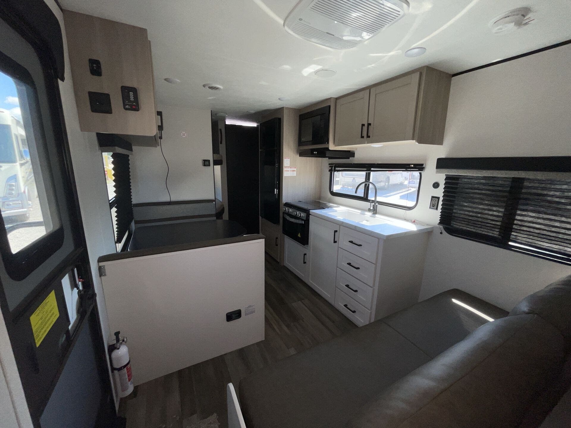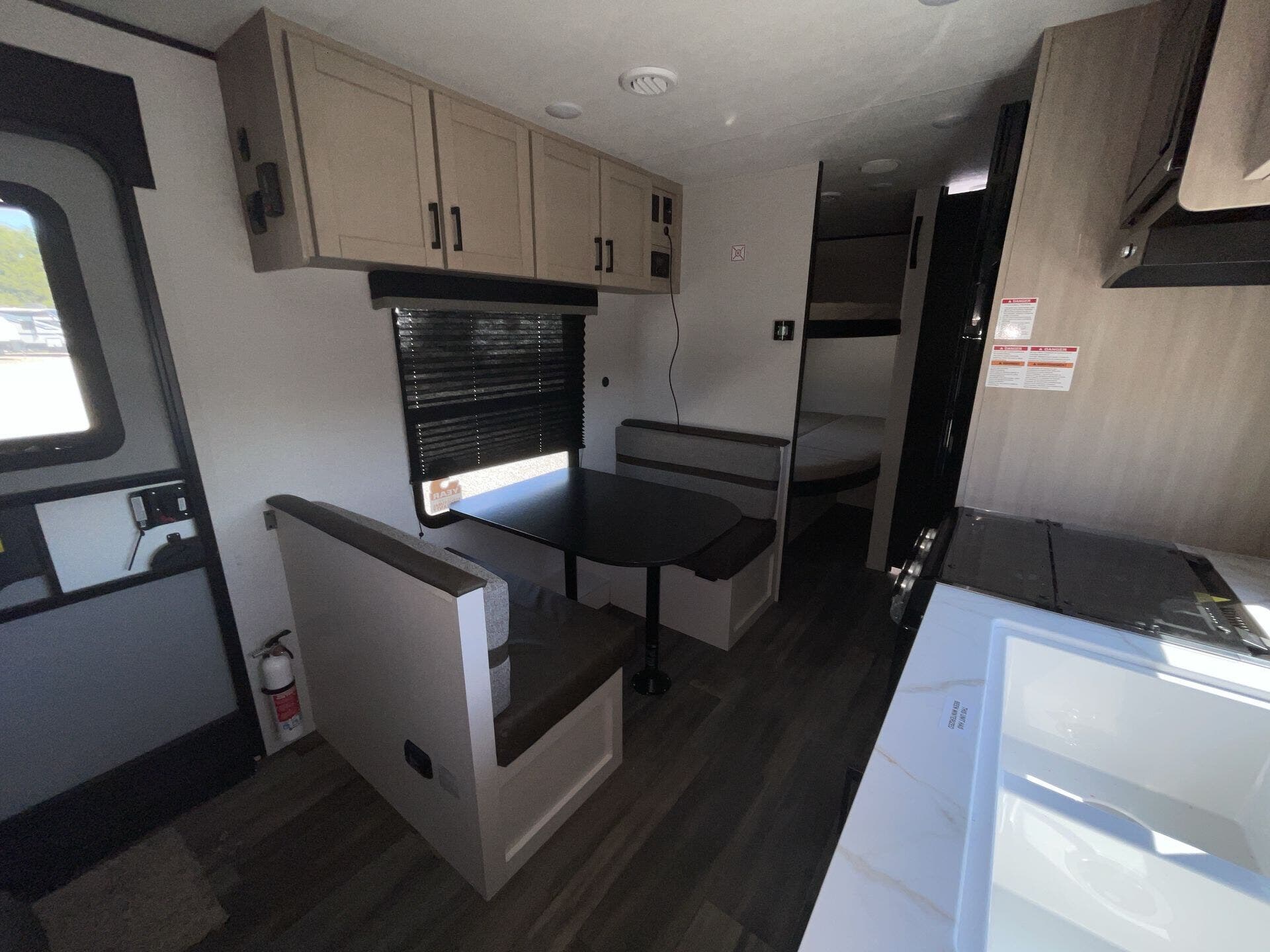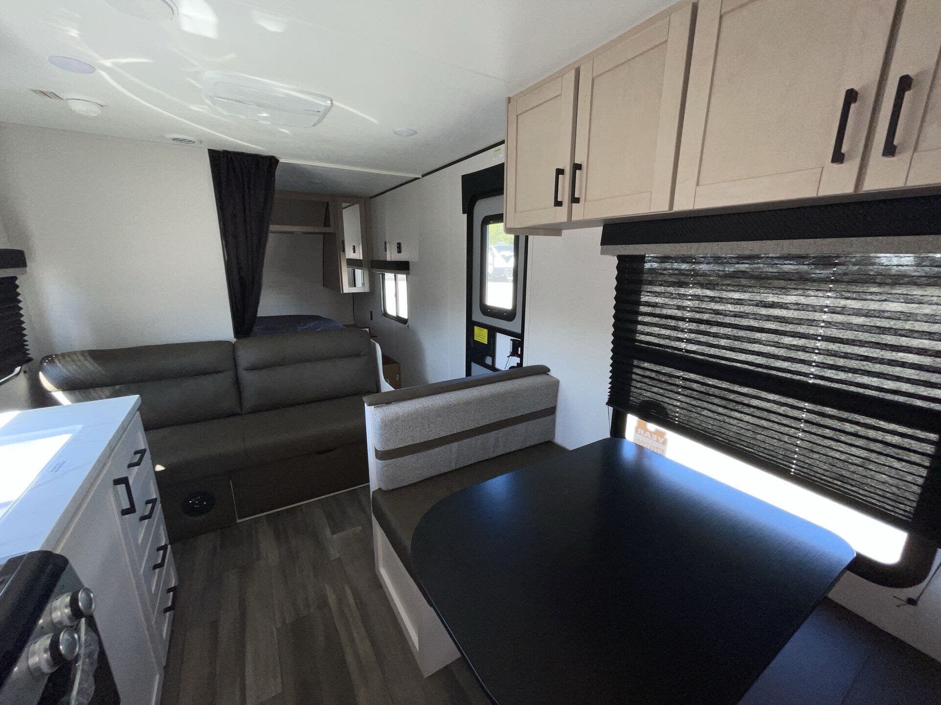 Inside, you’ll find a thoughtfully designed floorplan featuring double-over-double bunks at the rear—perfect for kids, guests, or extra storage—alongside a roomy U-shaped dinette that converts for additional sleeping space. The fully equipped kitchen boasts stainless steel appliances, solid-surface countertops, a deep farmhouse sink, and a pantry, giving you everything you need to prepare meals on the go. The open living area provides a warm, inviting space to relax, complete with large windows for natural light and an entertainment center for cozy evenings indoors.