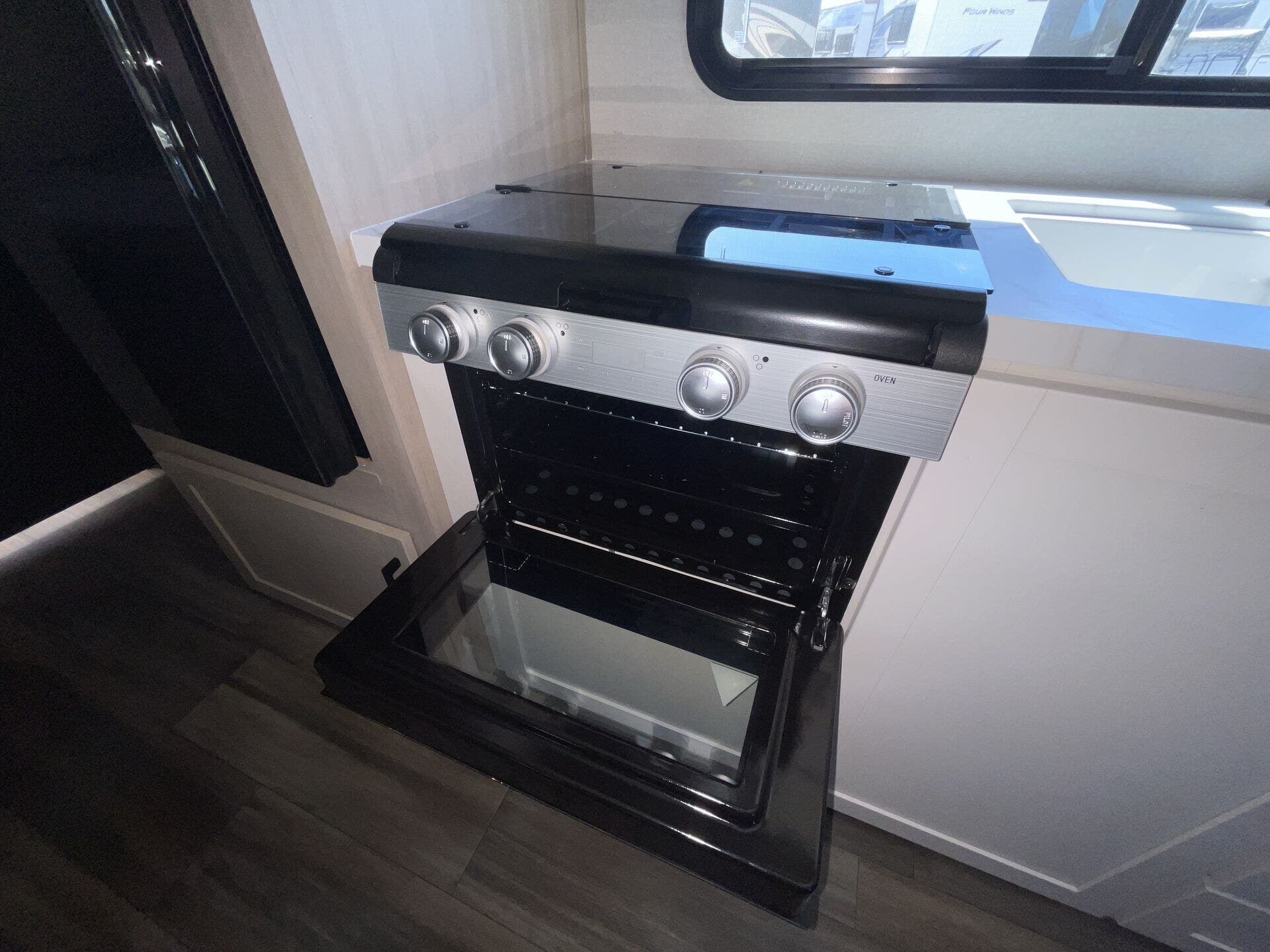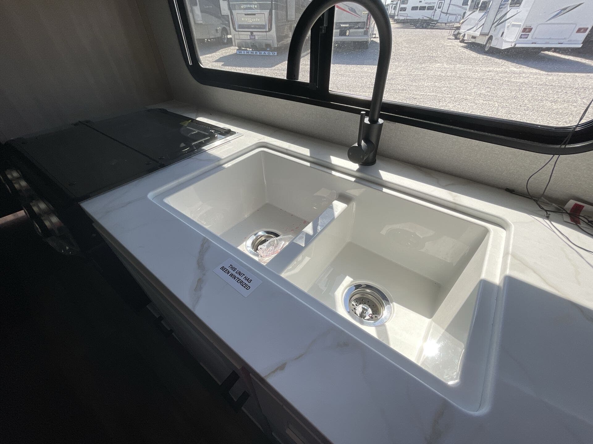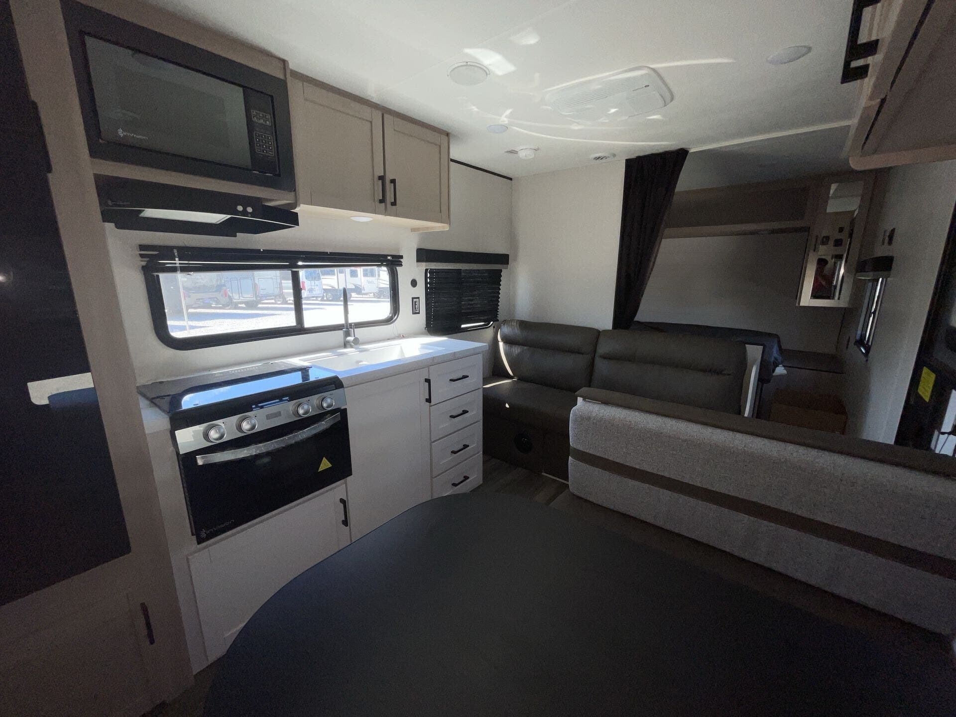 Inside, you’ll find a thoughtfully designed floorplan featuring double-over-double bunks at the rear—perfect for kids, guests, or extra storage—alongside a roomy U-shaped dinette that converts for additional sleeping space. The fully equipped kitchen boasts stainless steel appliances, solid-surface countertops, a deep farmhouse sink, and a pantry, giving you everything you need to prepare meals on the go. The open living area provides a warm, inviting space to relax, complete with large windows for natural light and an entertainment center for cozy evenings indoors.