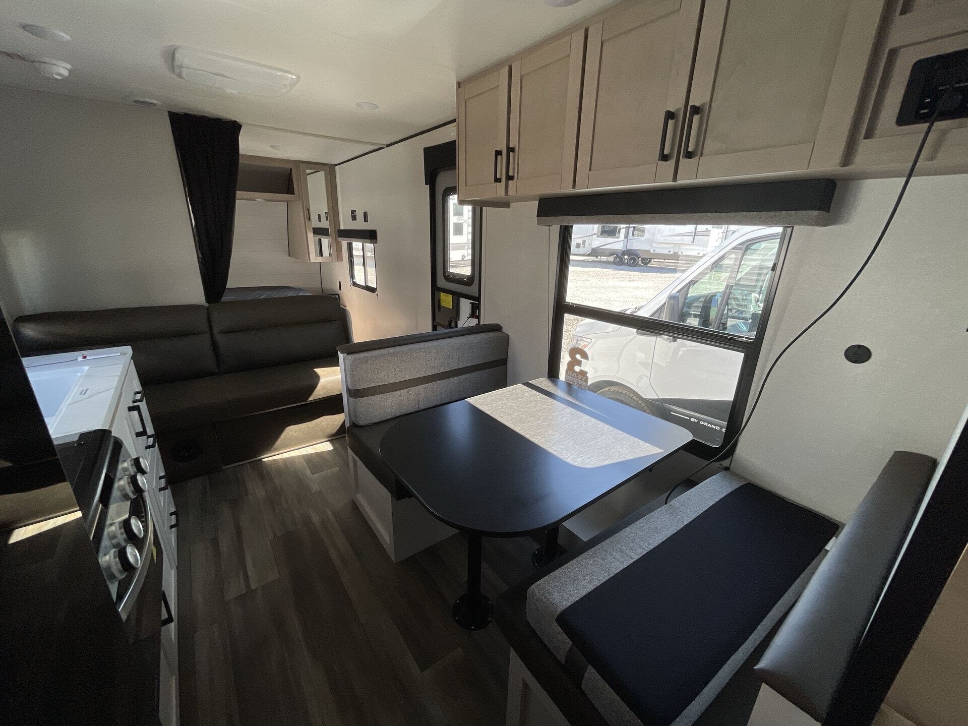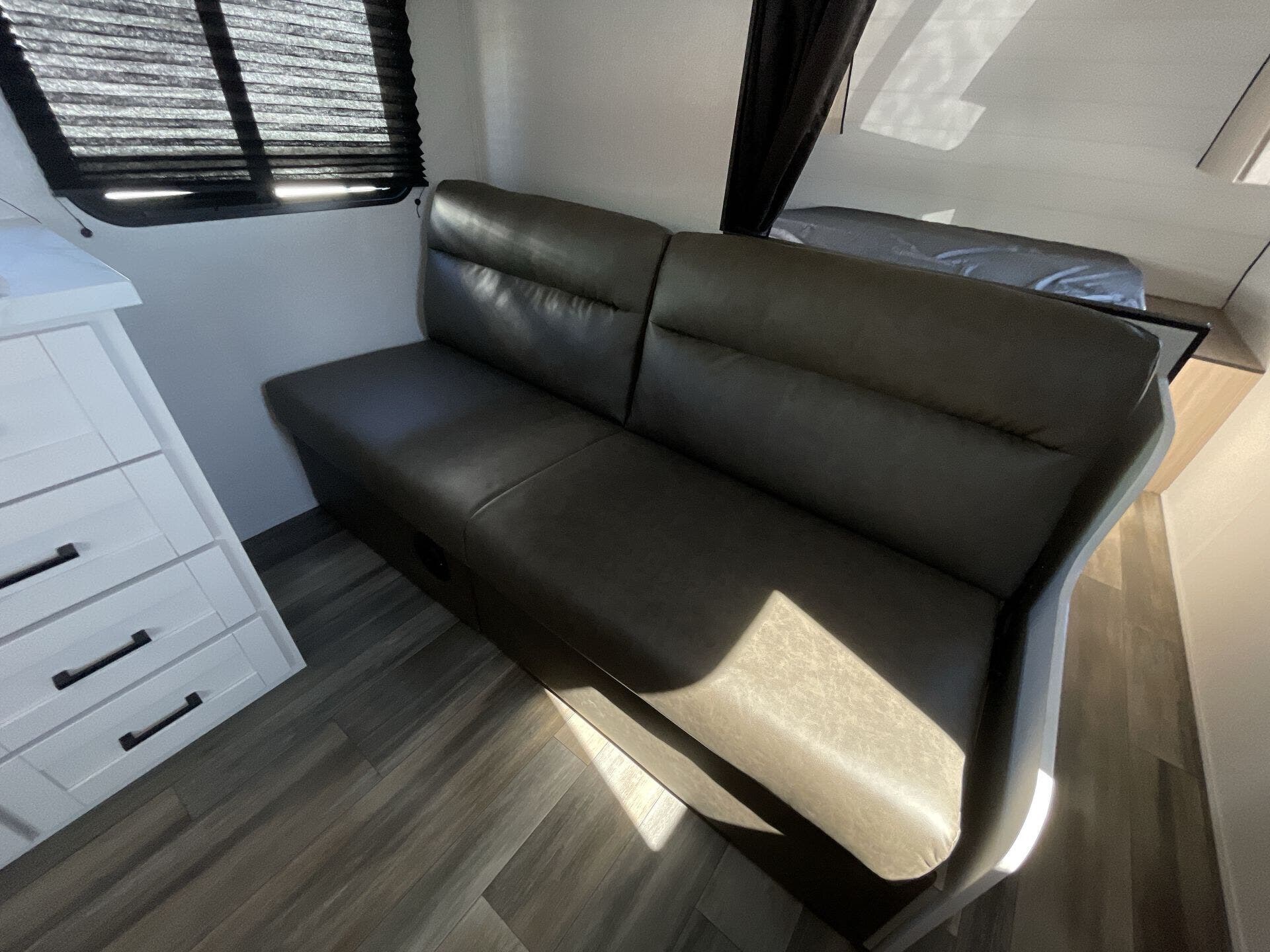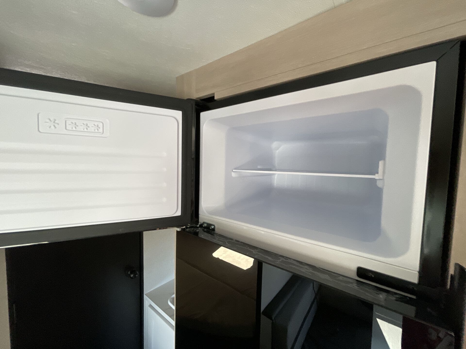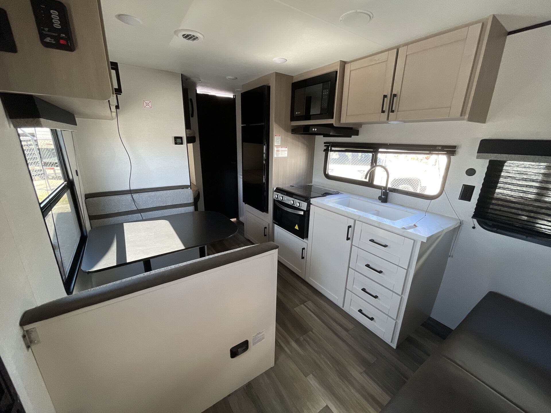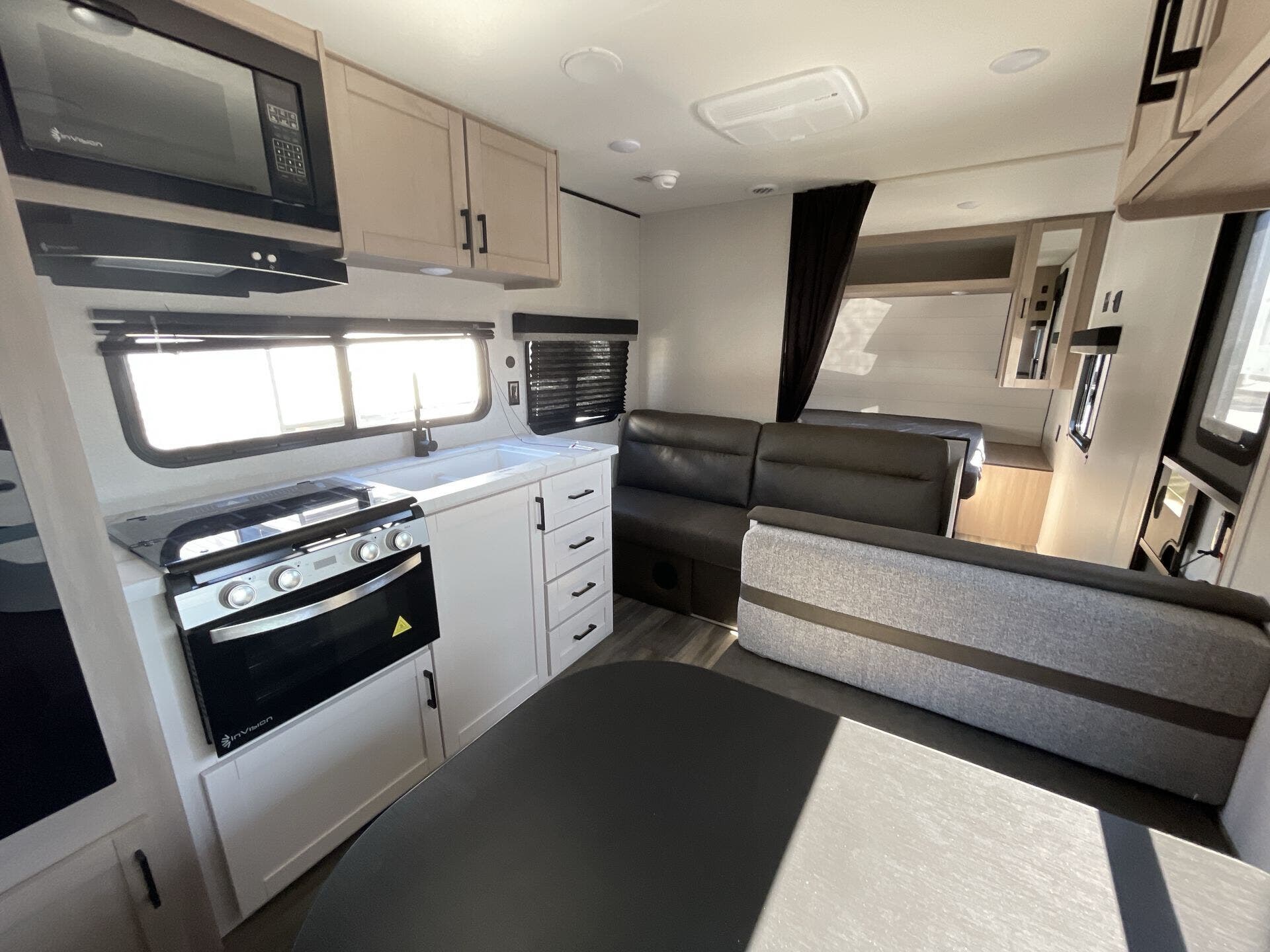 Inside, the 211MK feels open and inviting thanks to its smart layout and residential-style finishes. The spacious living area features a large slide with a comfortable sofa or dinette, perfect for relaxing or entertaining. The fully equipped kitchen includes stainless-steel appliances, solid countertops, and plenty of storage, while the front queen bed offers a cozy retreat after a day of adventure. A roomy rear bathroom with a large shower and extra storage adds an unexpected touch of luxury for a compact trailer.