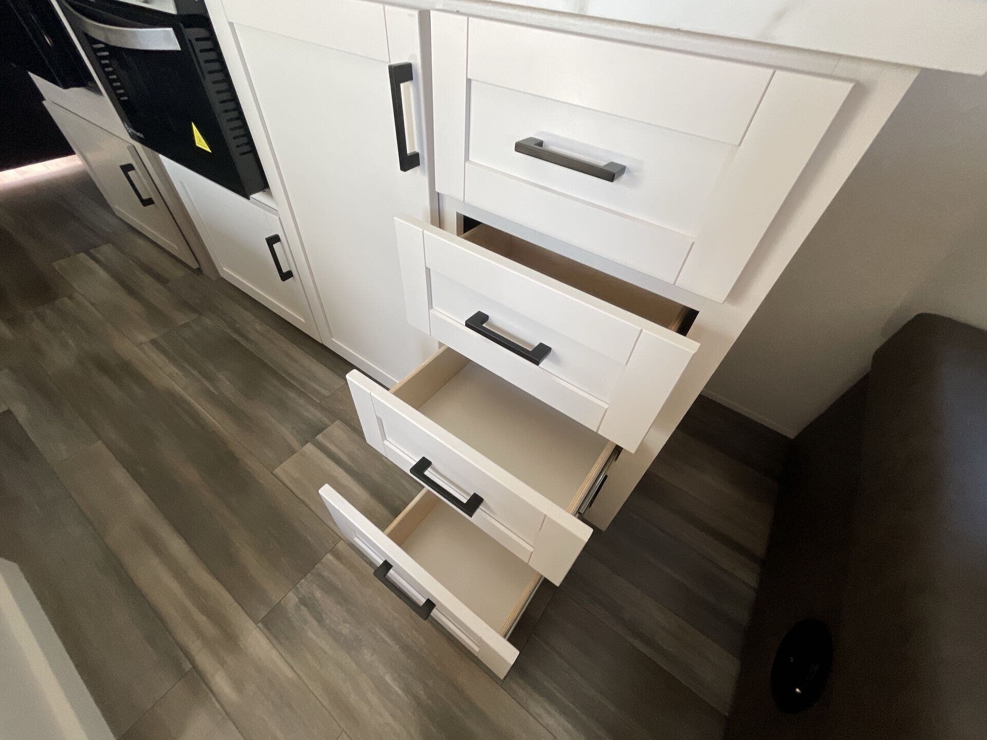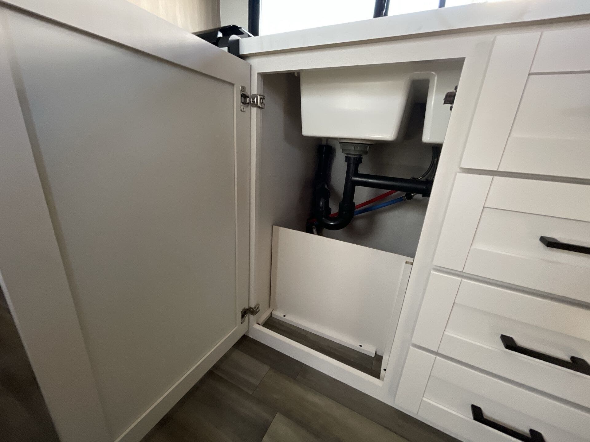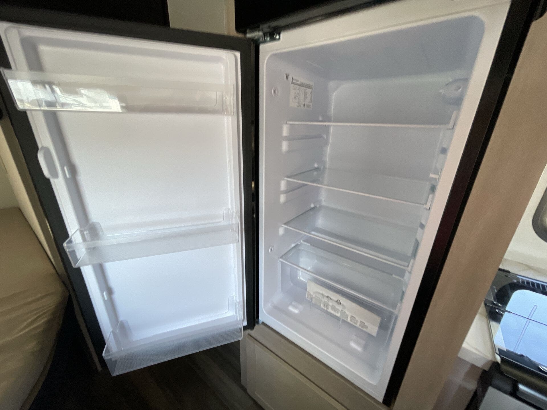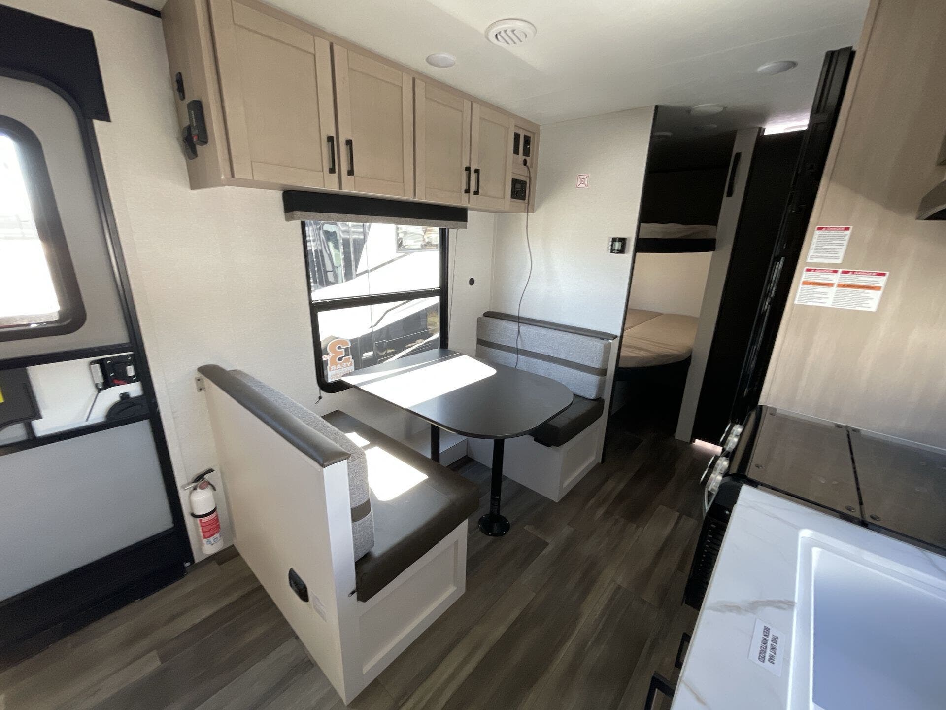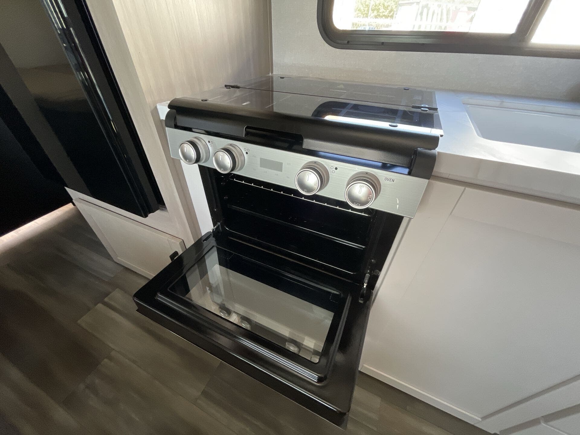 Inside, the 211MK feels open and inviting thanks to its smart layout and residential-style finishes. The spacious living area features a large slide with a comfortable sofa or dinette, perfect for relaxing or entertaining. The fully equipped kitchen includes stainless-steel appliances, solid countertops, and plenty of storage, while the front queen bed offers a cozy retreat after a day of adventure. A roomy rear bathroom with a large shower and extra storage adds an unexpected touch of luxury for a compact trailer.