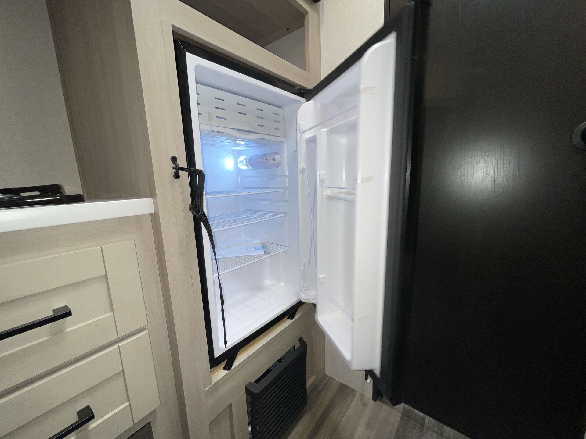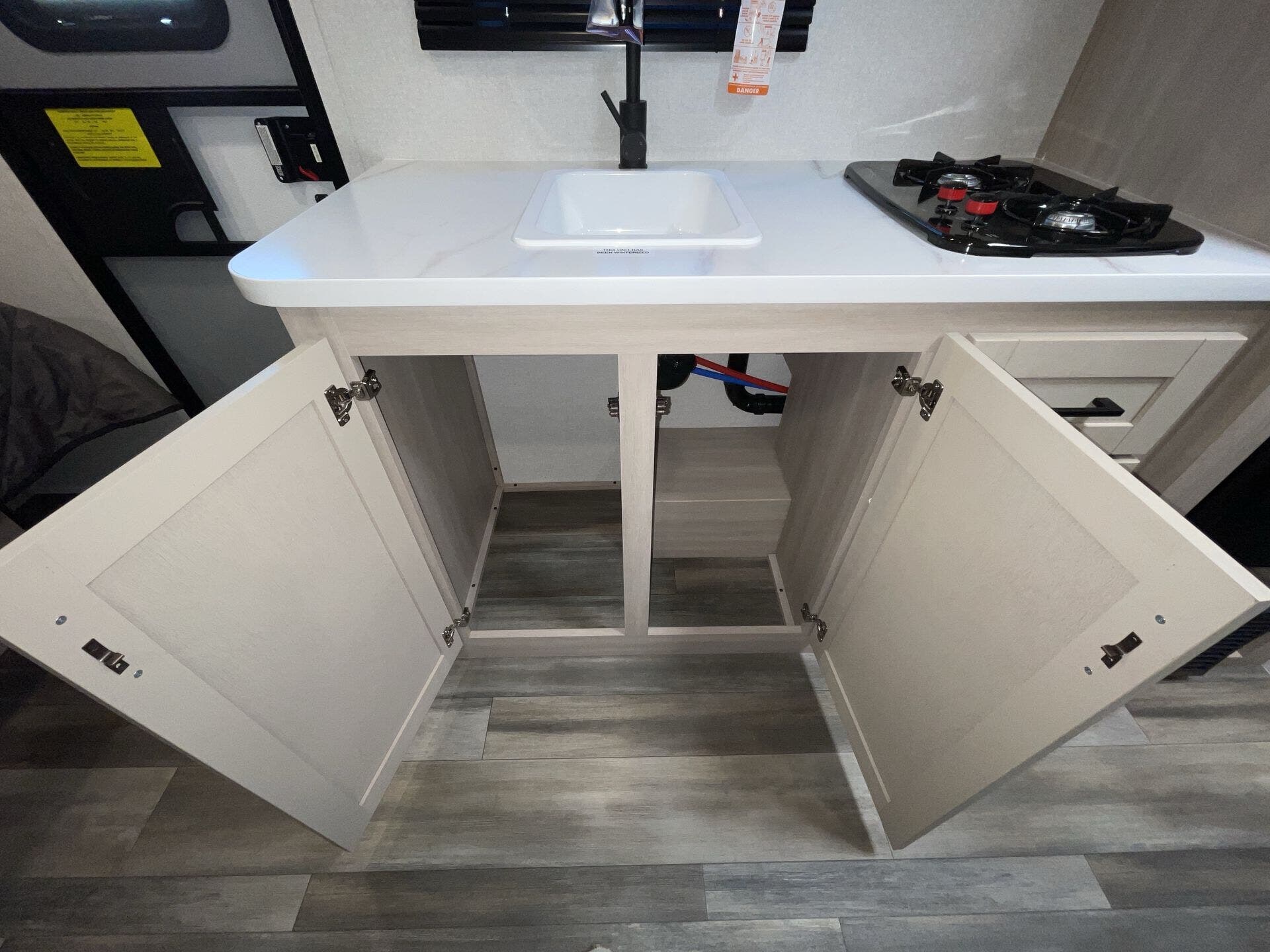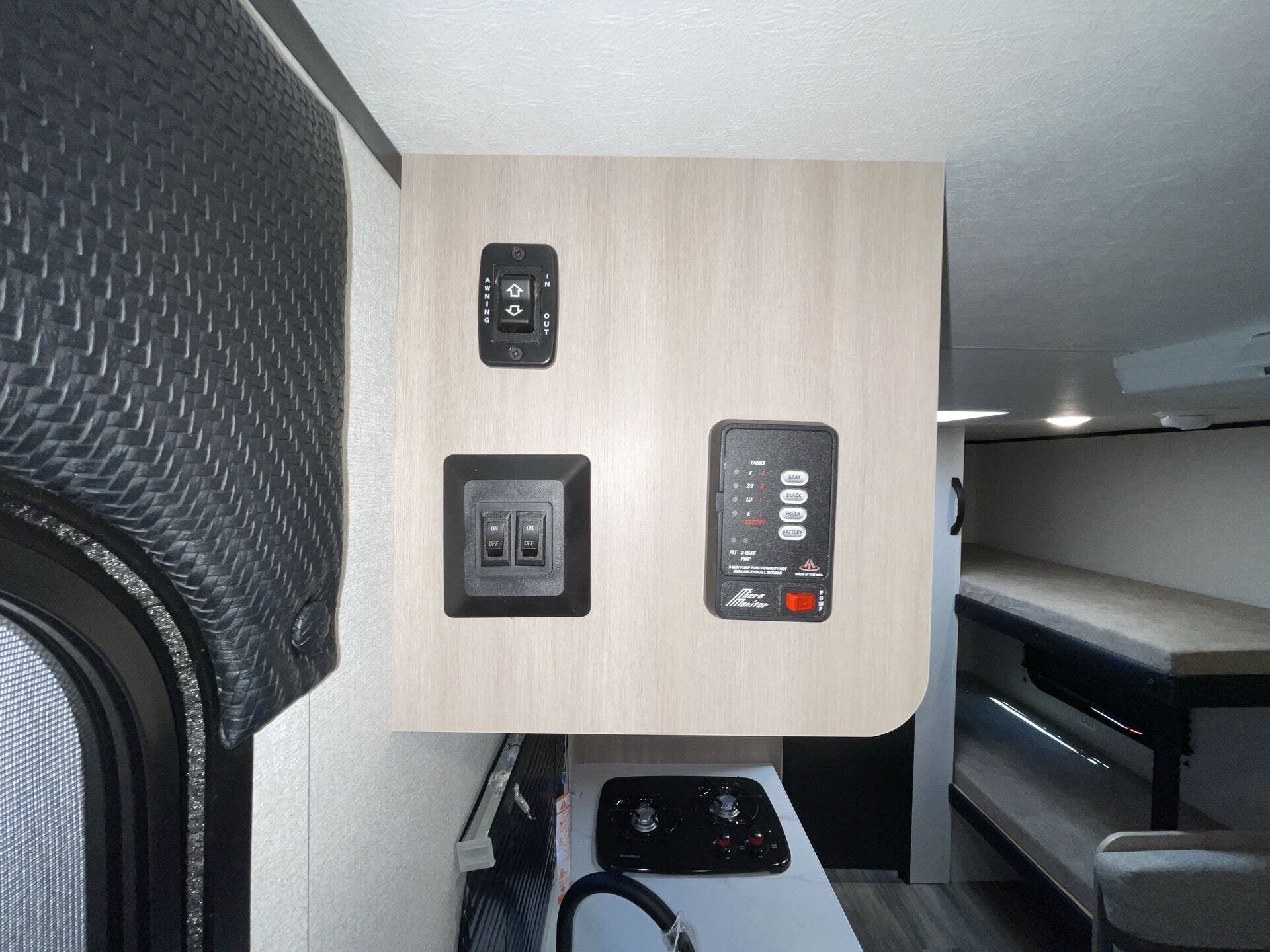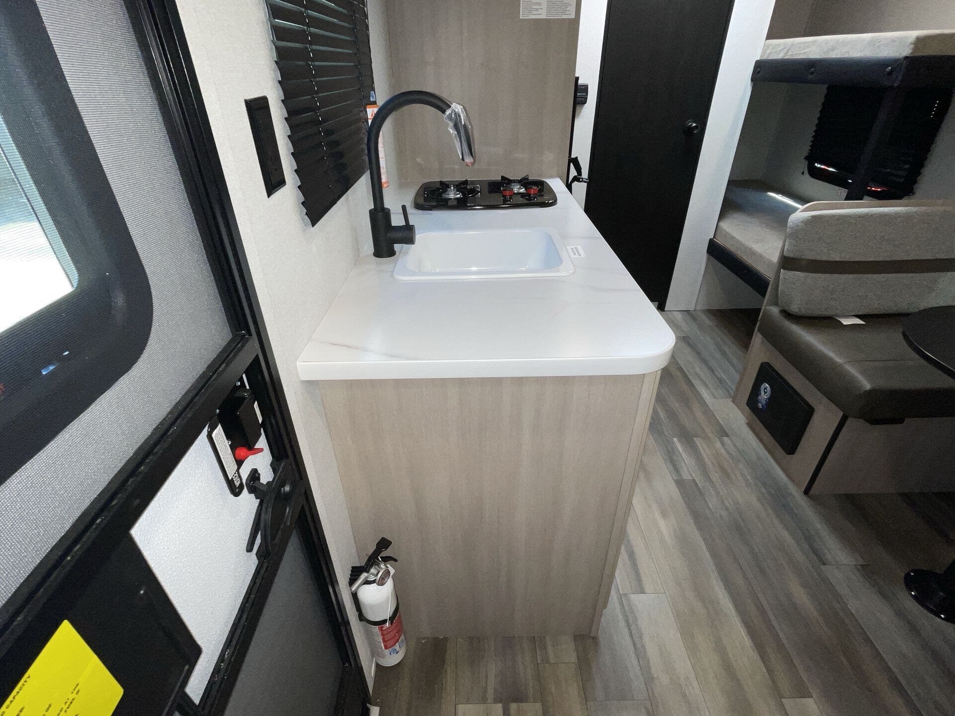 - Well-equipped kitchen: microwave, stove top burner, 8 cu ft 12V refrigerator, and kitchen sink
