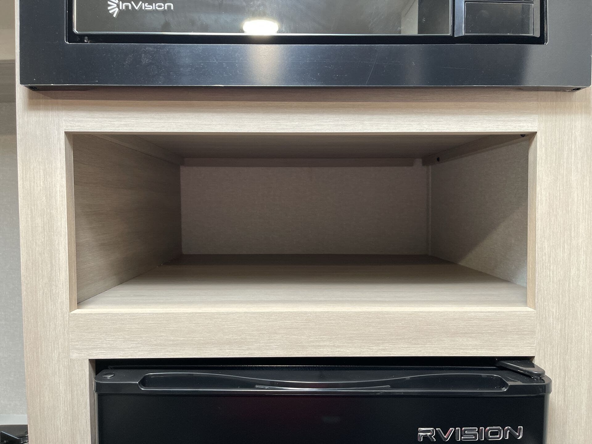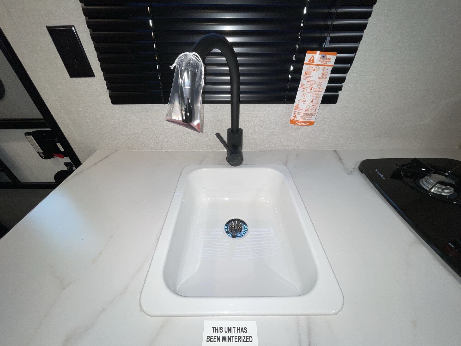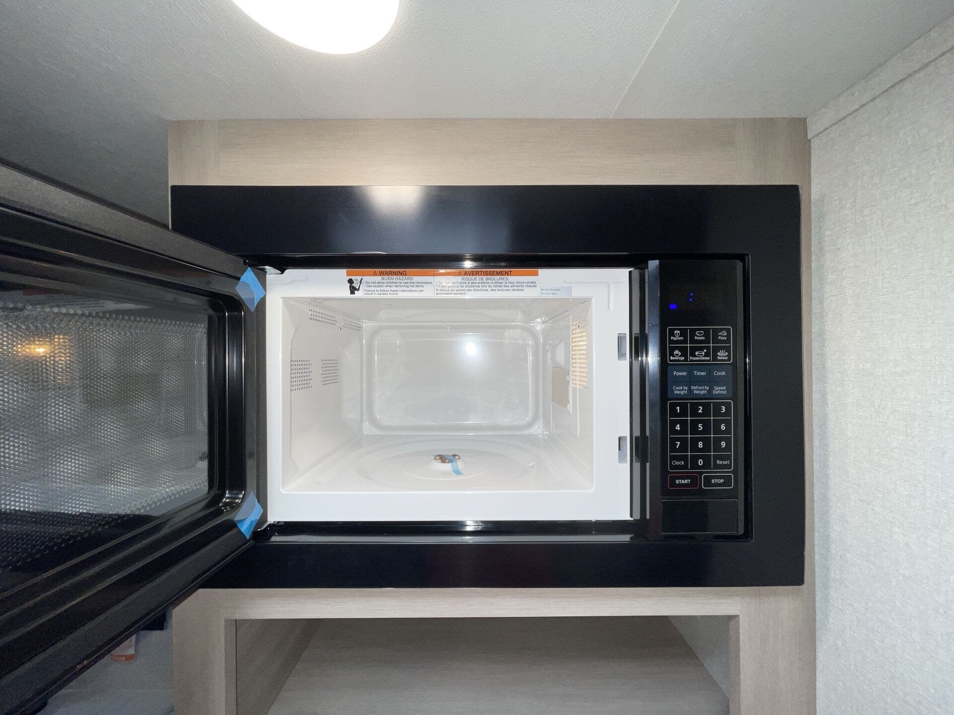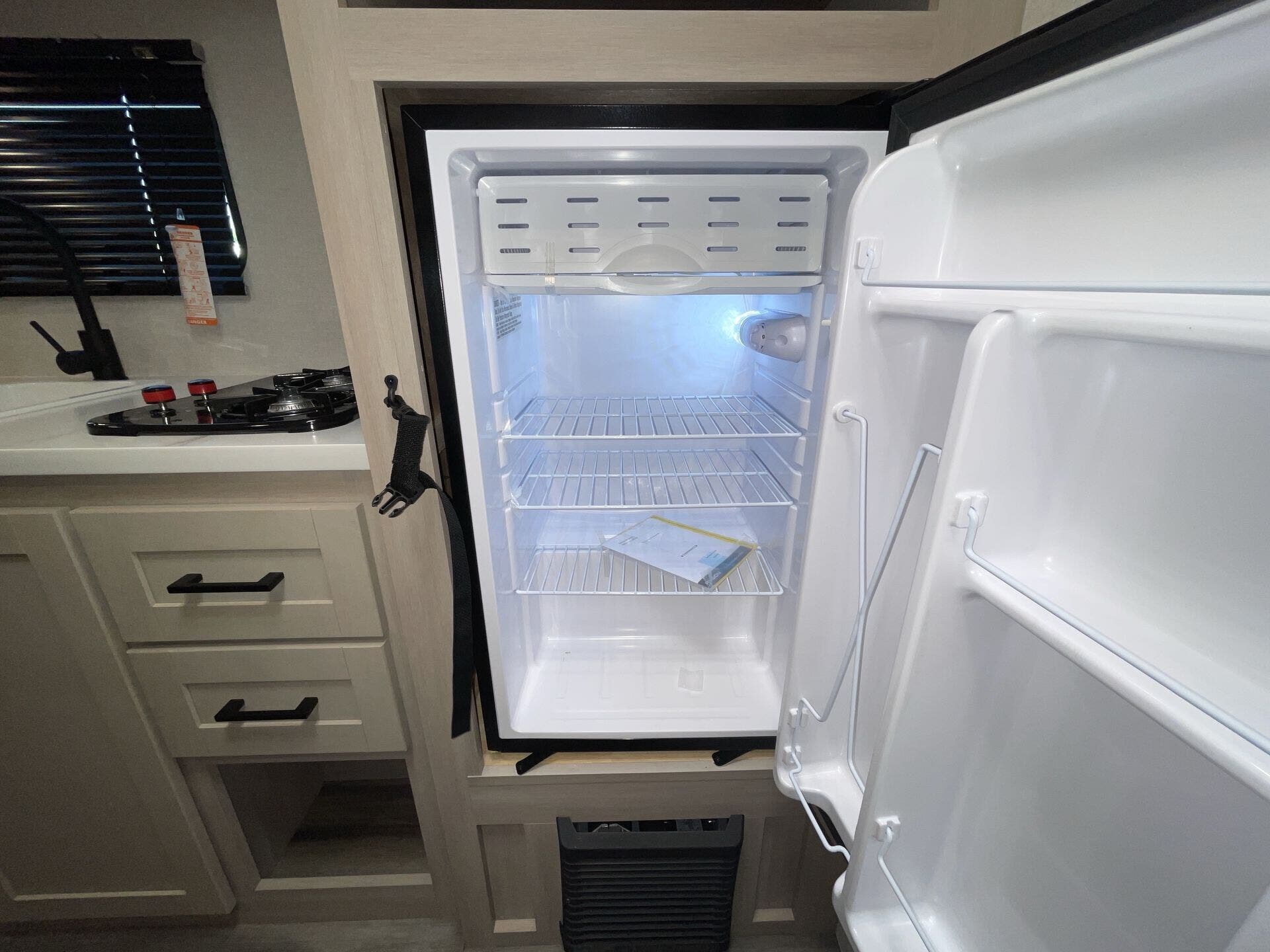- Well-equipped kitchen: microwave, stove top burner, 8 cu ft 12V refrigerator, and kitchen sink
