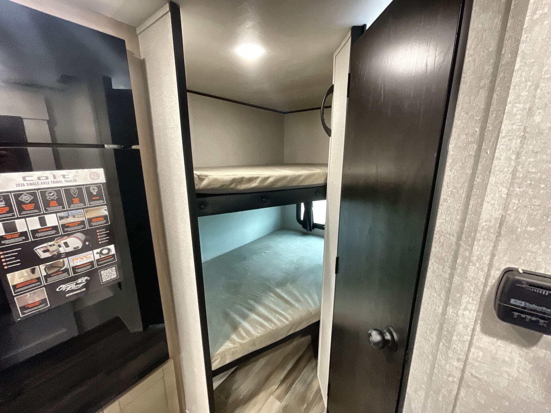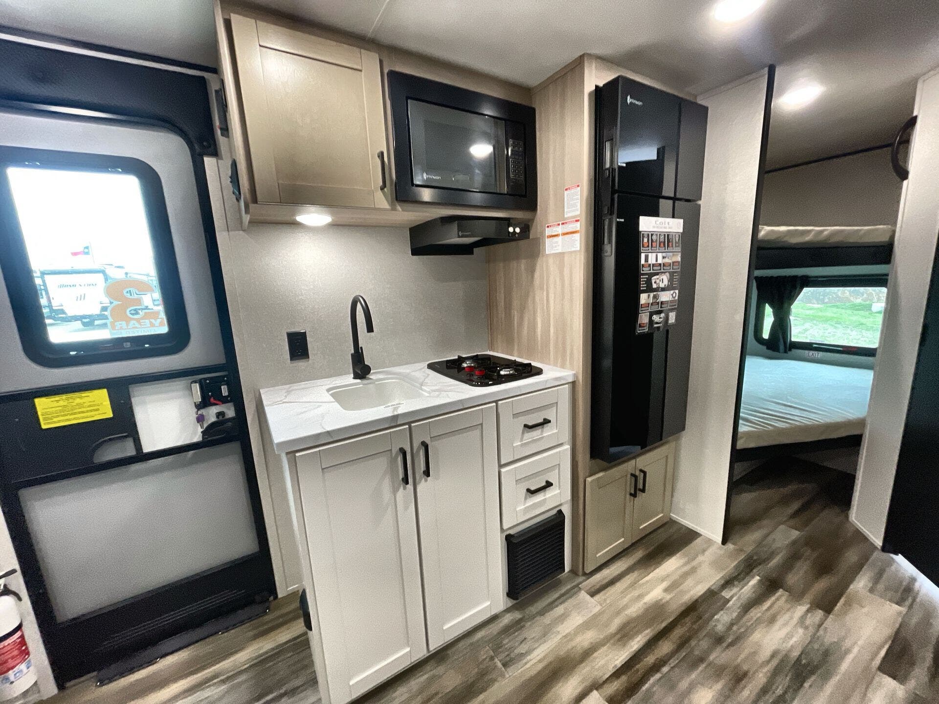 The floorplan types for this model include Bunk Beds, Mid Kitchen, Mid Living Area, Murphy Bed, Rear Bedroom, and U-Shaped Dinette, all brought together in the CONV COLT 18MBS layout. This arrangement delivers flexible sleeping options—up to eight people—while offering a welcoming living zone, a functional galley, and a private bedroom. The Murphy bed design frees up floor space during the day, making this travel trailer ideal for family trips, weekend getaways, and seasonal excursions.