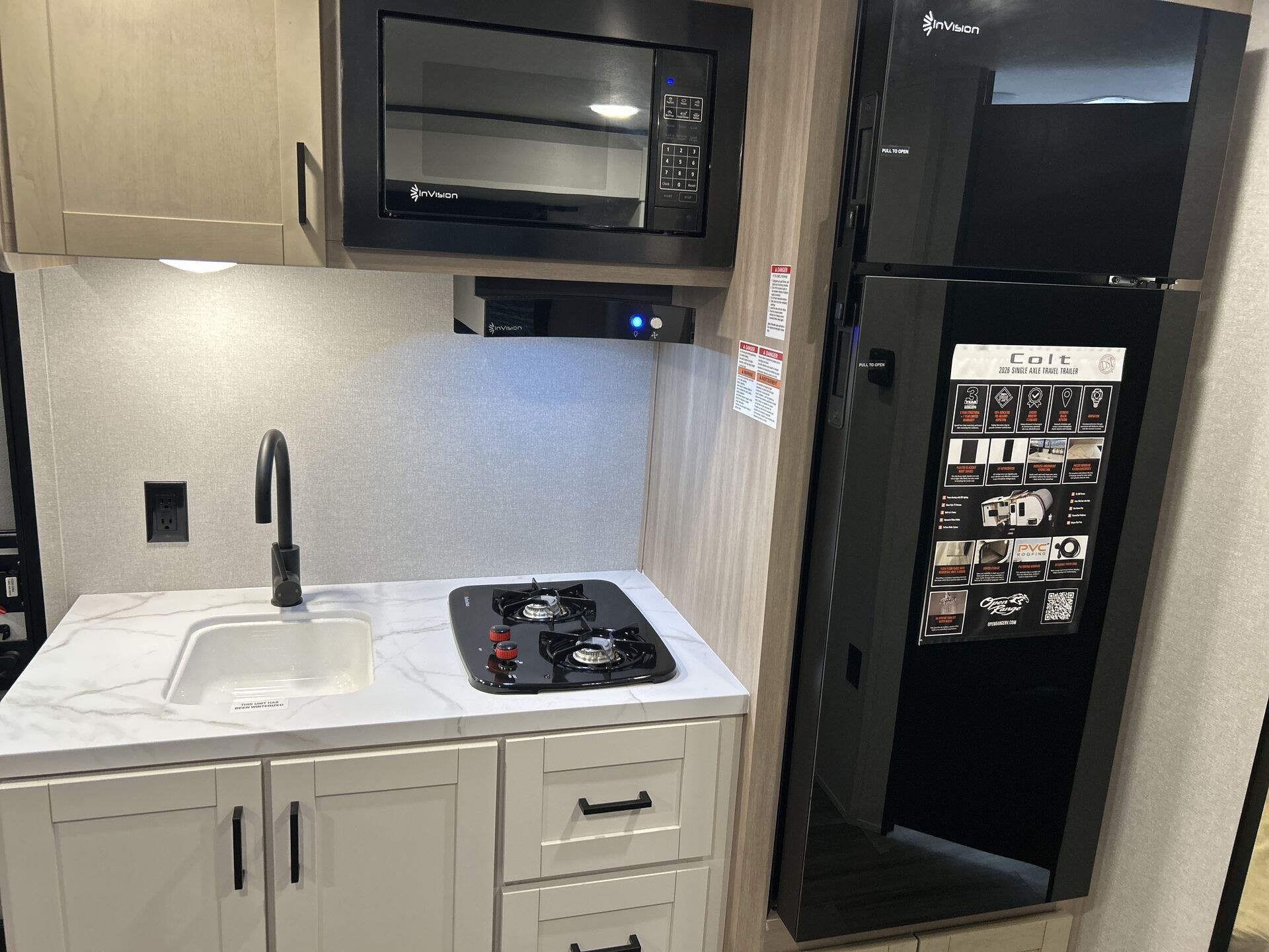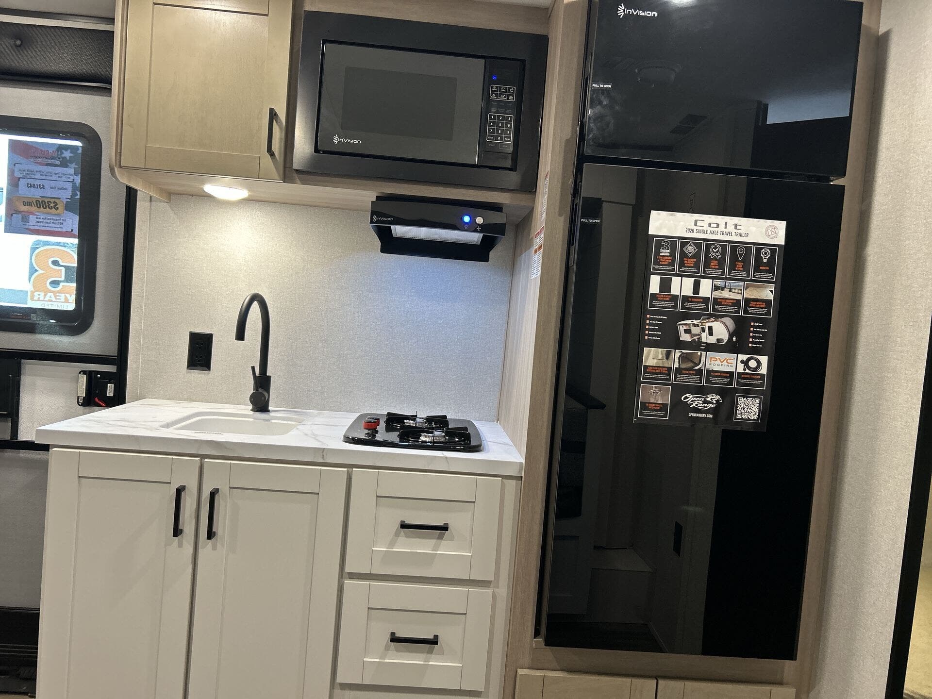 - Key Features: Convection Microwave, Refrigerator, Stove Top Burner, Water Heater