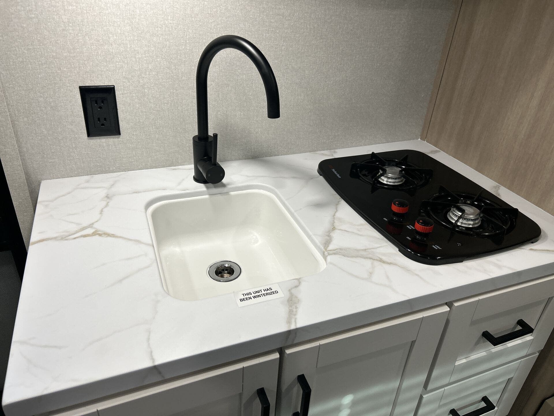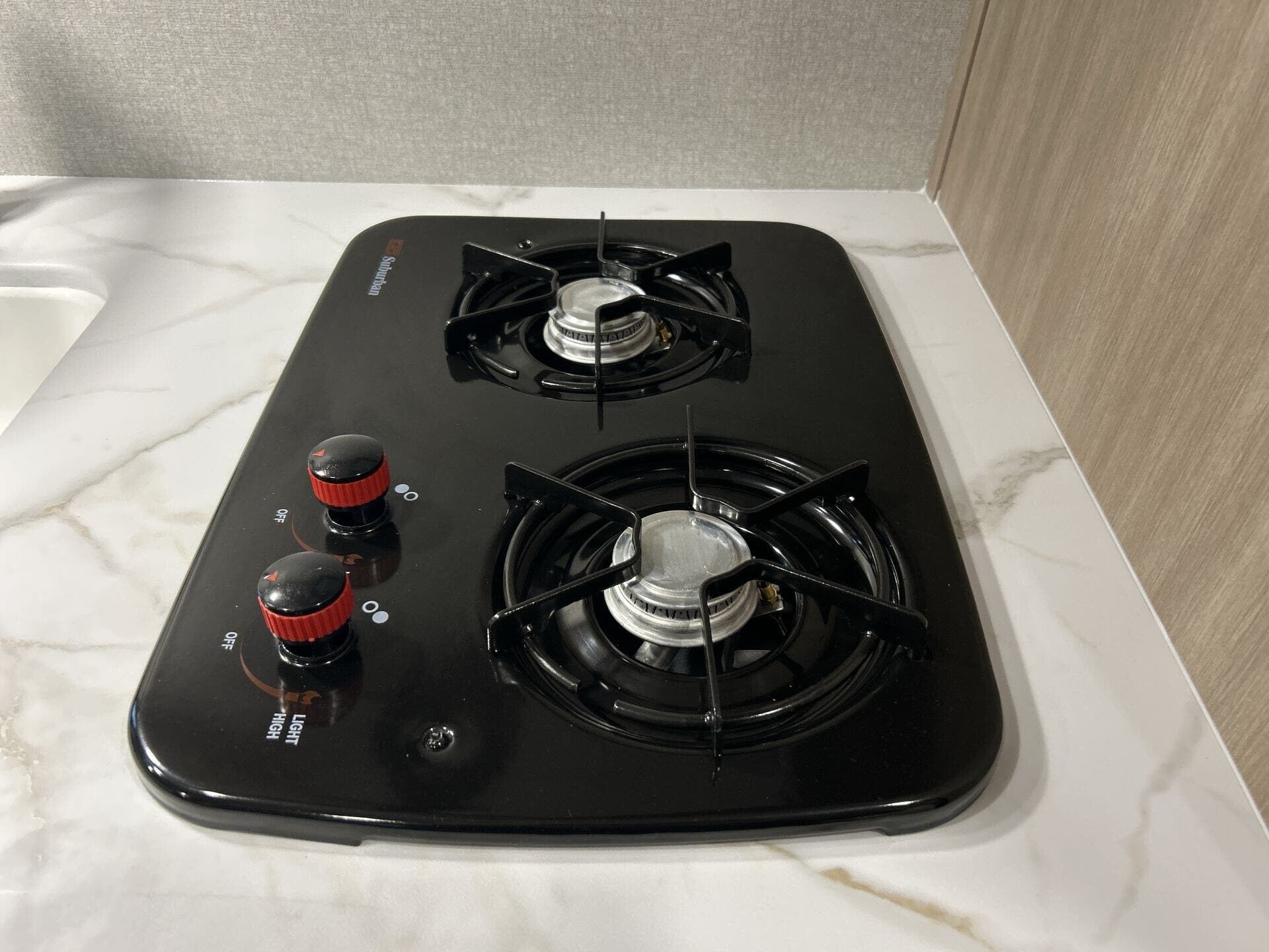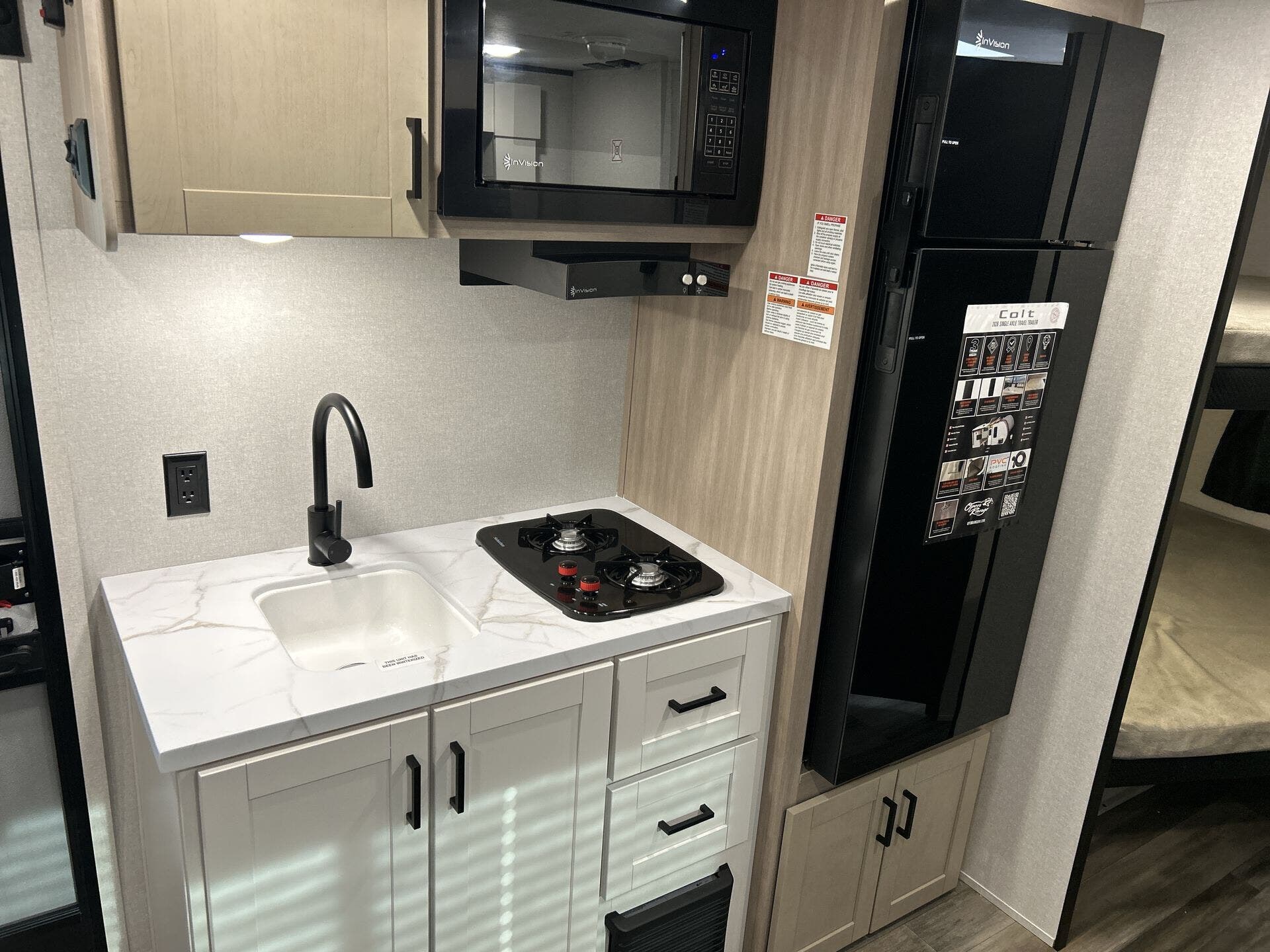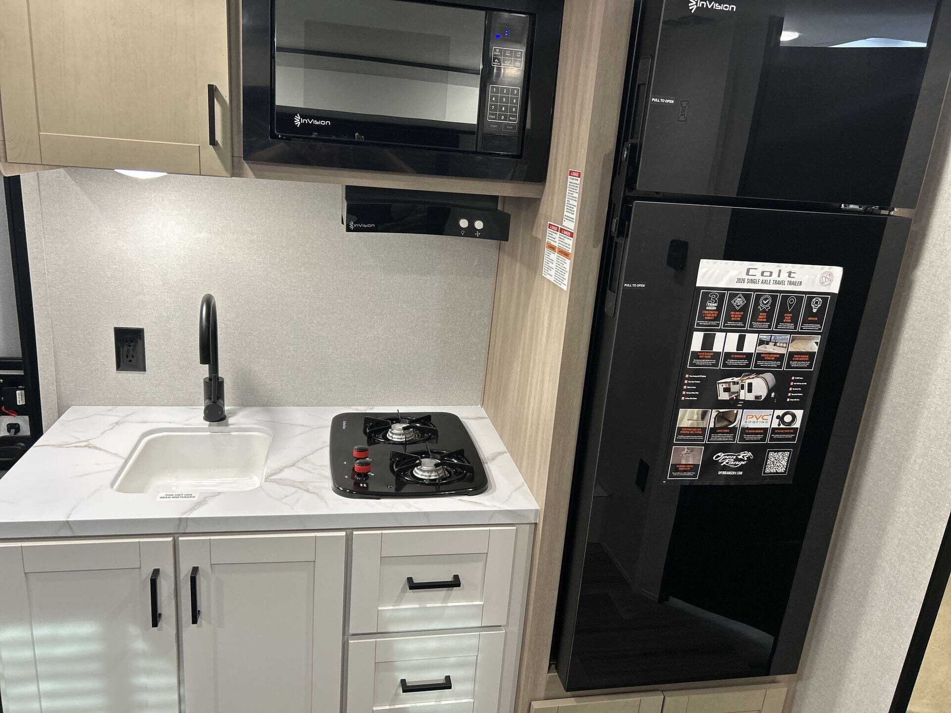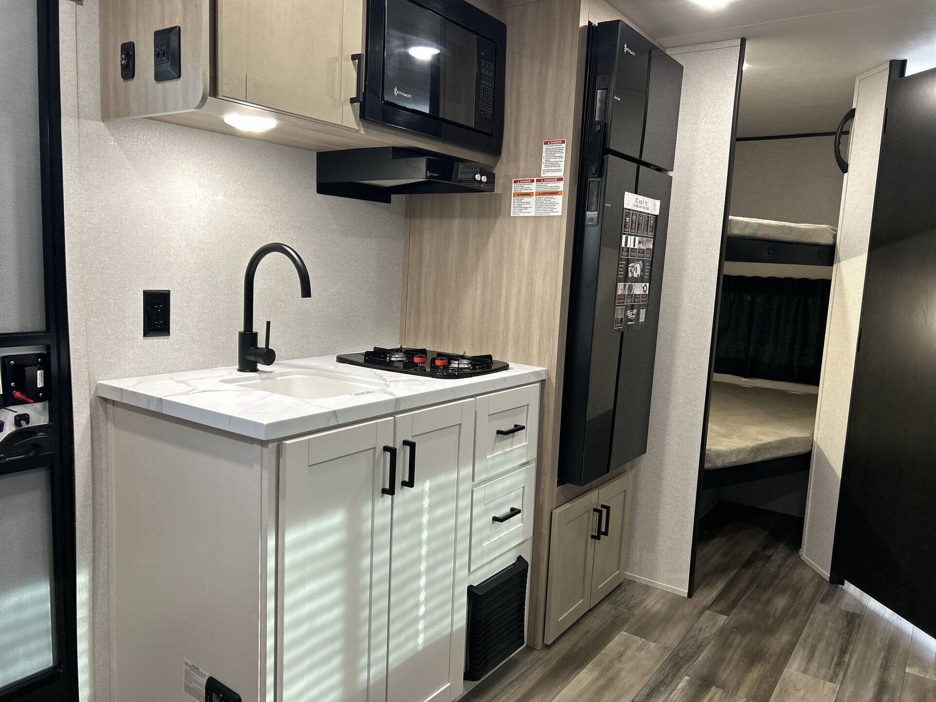 - Appliances: Convection microwave, refrigerator, stove top burner
