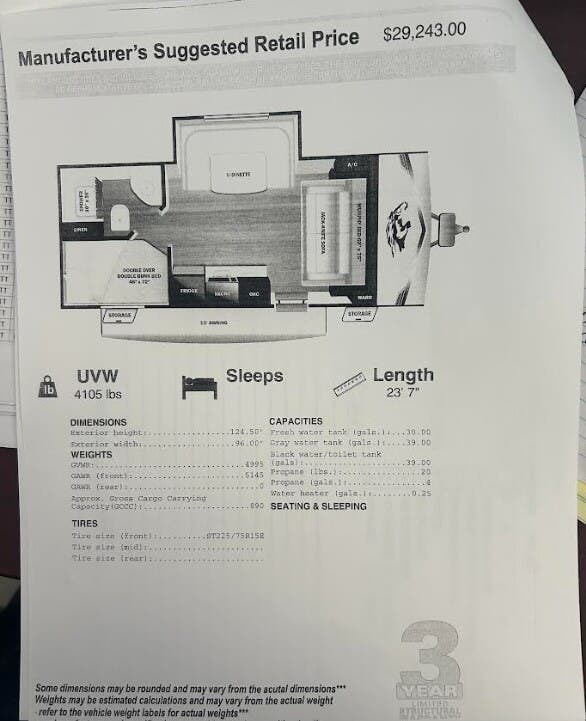 - Safety & Comfort: CO detector, LP detector, smoke detector, fire extinguisher, awning