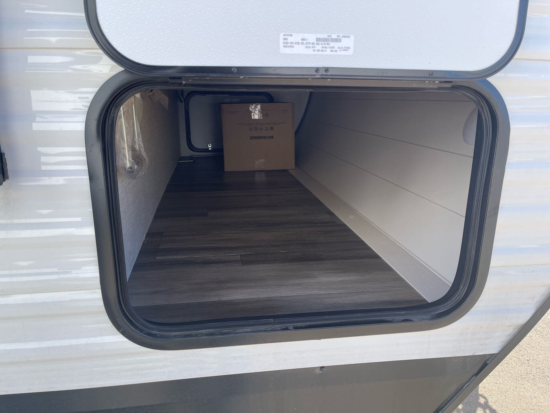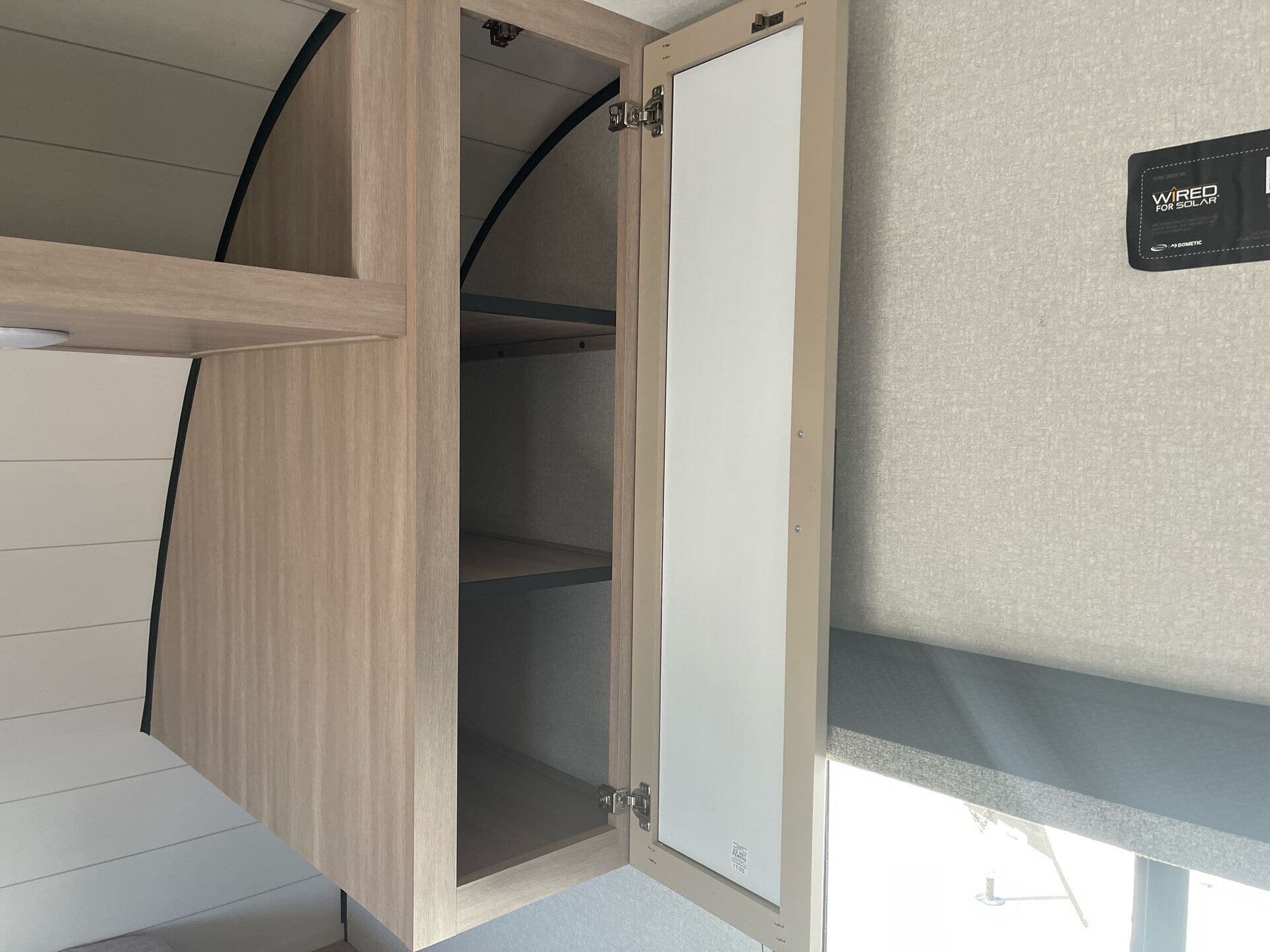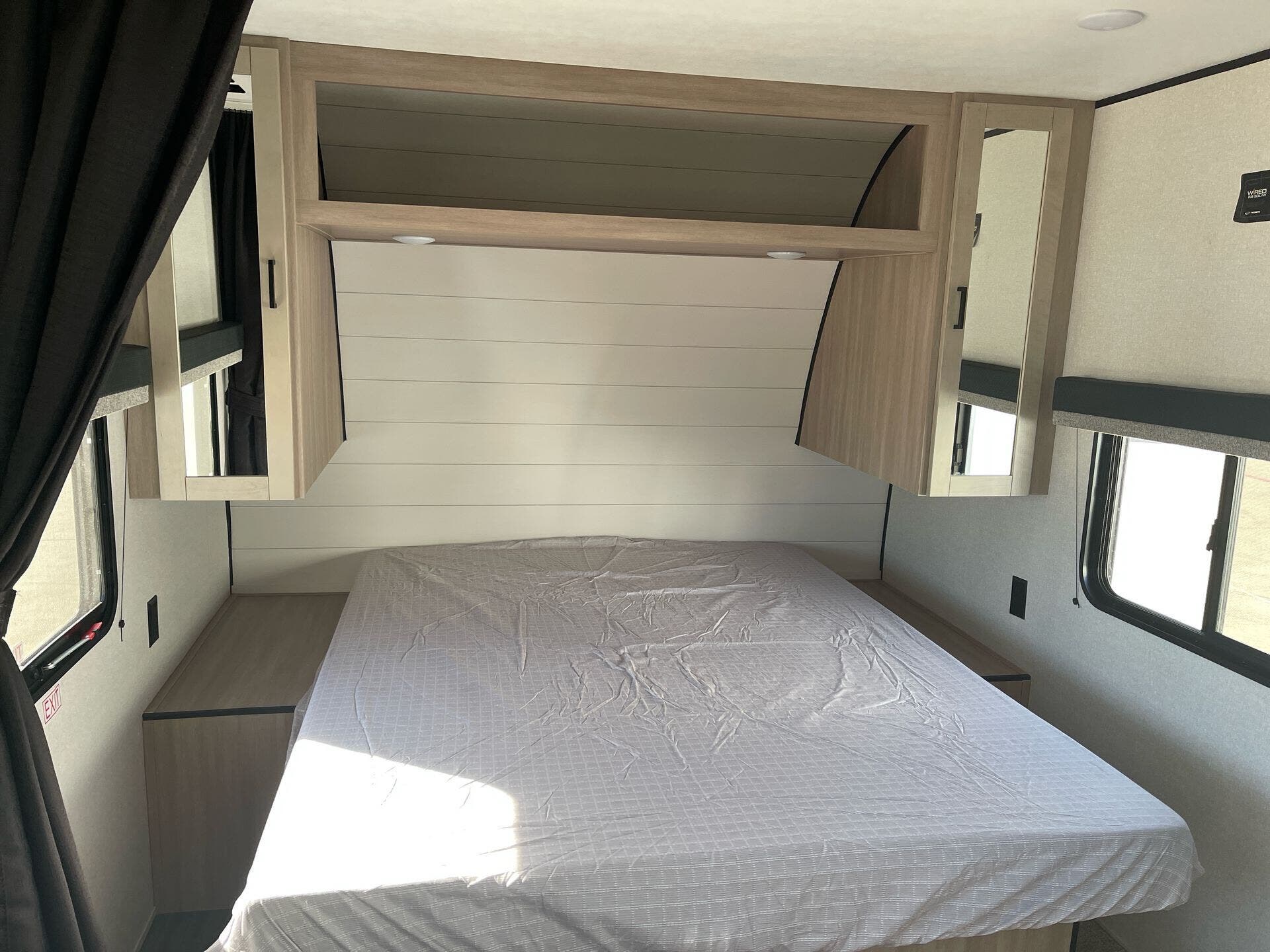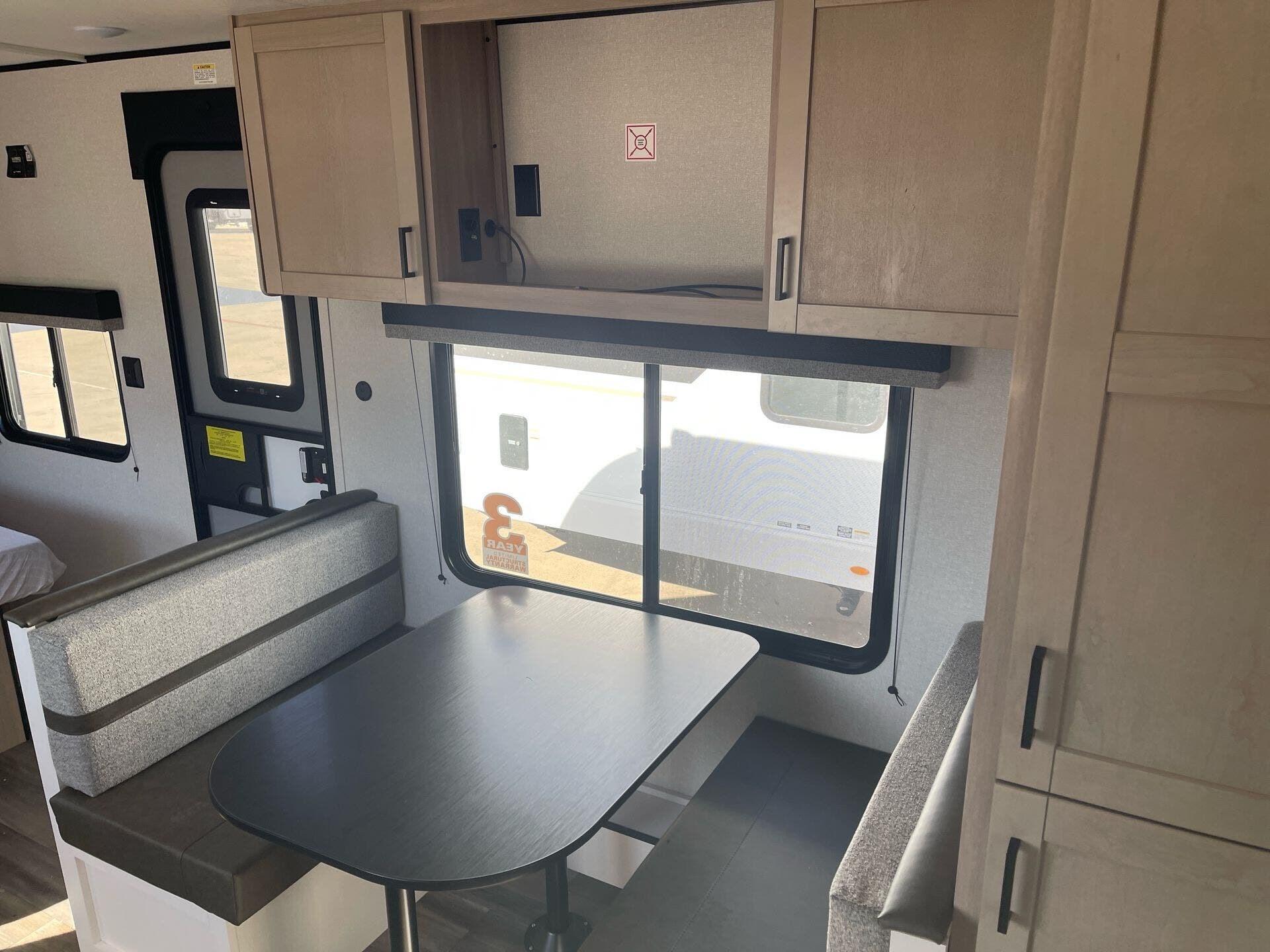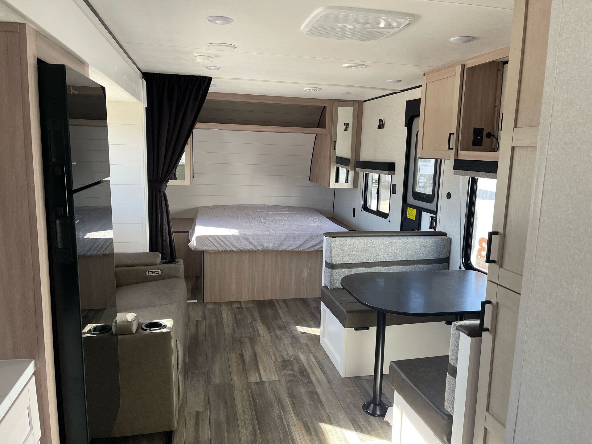 The 22MDS floorplan is designed for family comfort, featuring bunk beds and a queen-size mattress for flexible sleeping arrangements. Inside, you’ll find a complete kitchen setup with a refrigerator, microwave, and oven, plus a shower, toilet, and vanity for everyday living on the road. LED lighting and a skylight create a bright, welcoming atmosphere, while the compact yet functional layout makes efficient use of space for gatherings, meals, and downtime.
