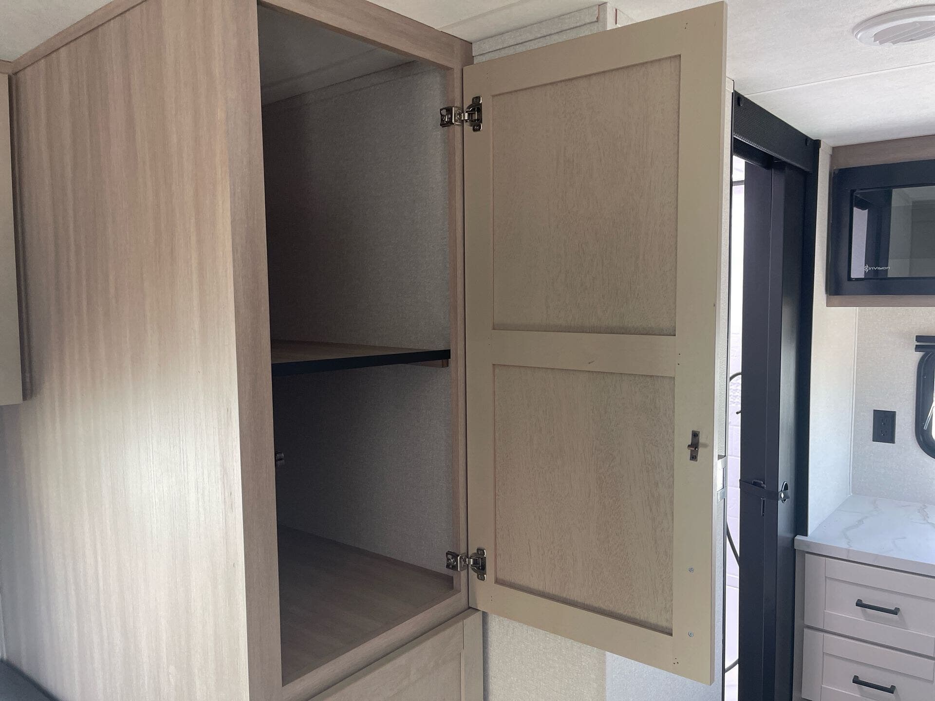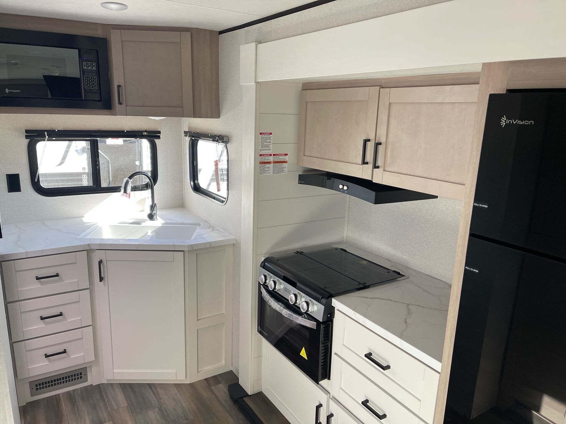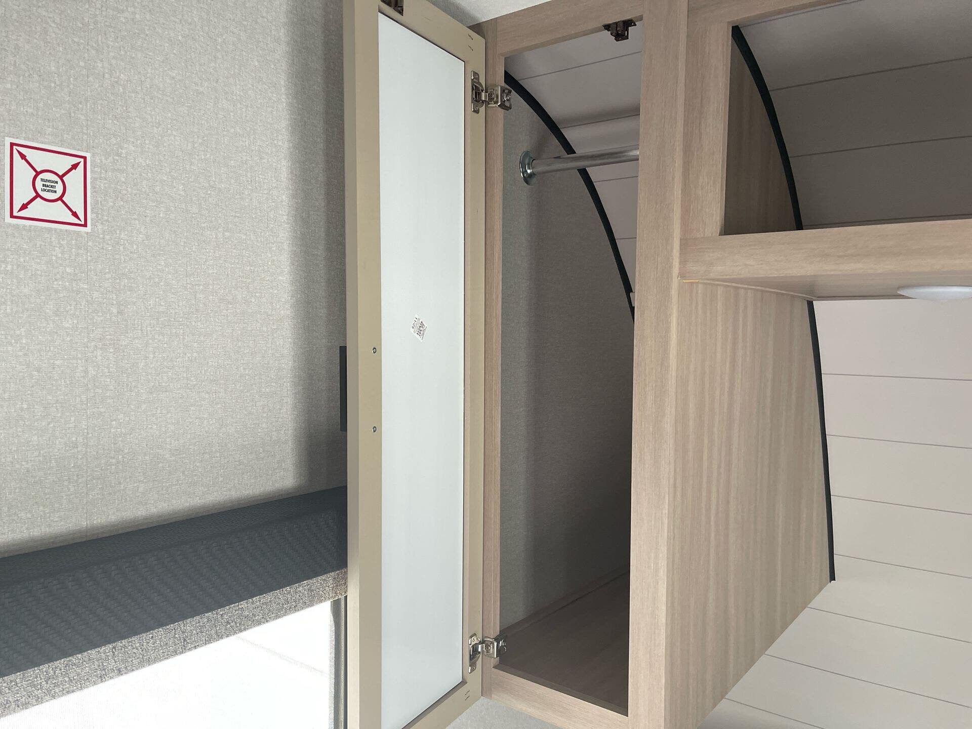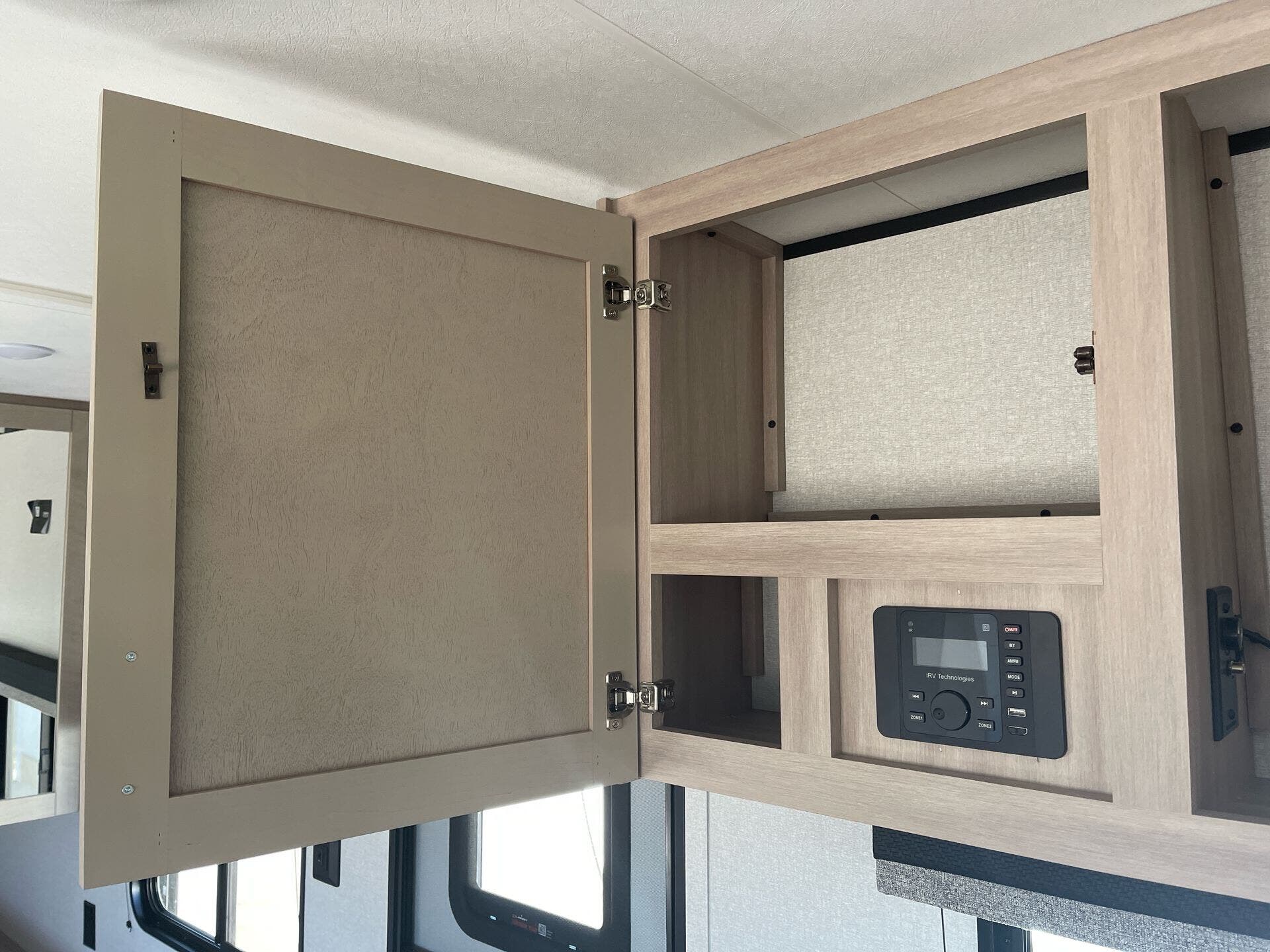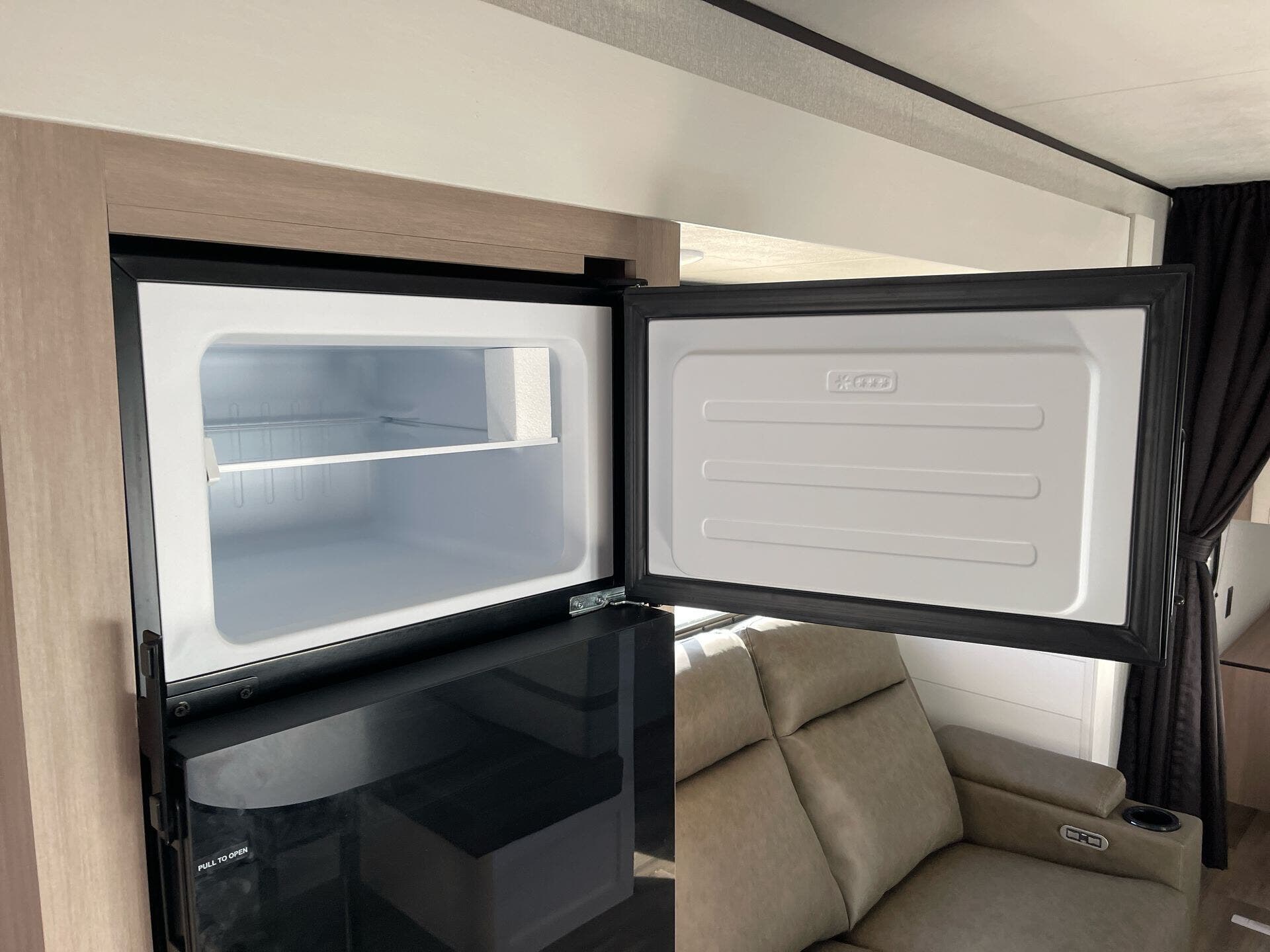 The 22MDS floorplan is designed for family comfort, featuring bunk beds and a queen-size mattress for flexible sleeping arrangements. Inside, you’ll find a complete kitchen setup with a refrigerator, microwave, and oven, plus a shower, toilet, and vanity for everyday living on the road. LED lighting and a skylight create a bright, welcoming atmosphere, while the compact yet functional layout makes efficient use of space for gatherings, meals, and downtime.