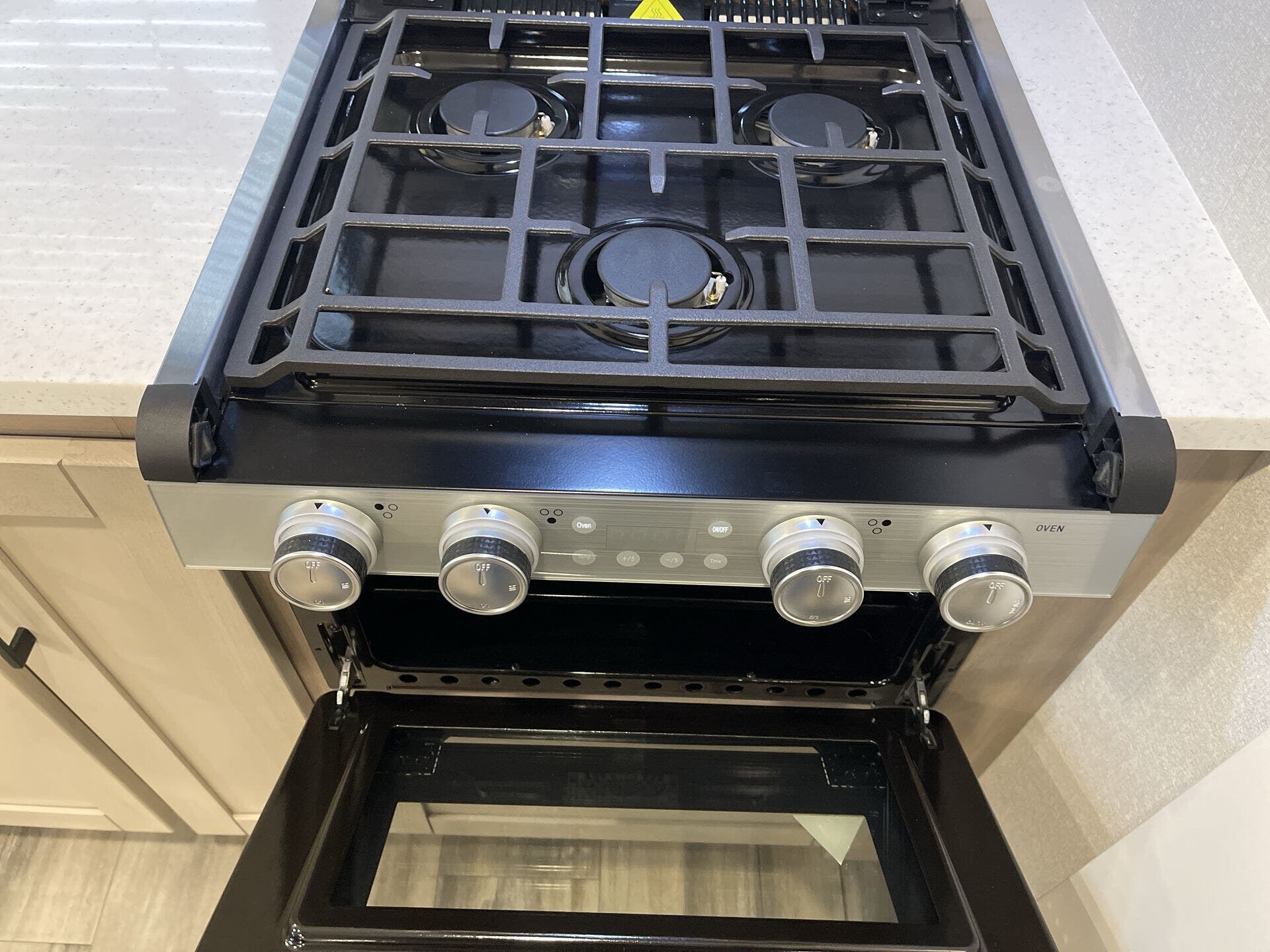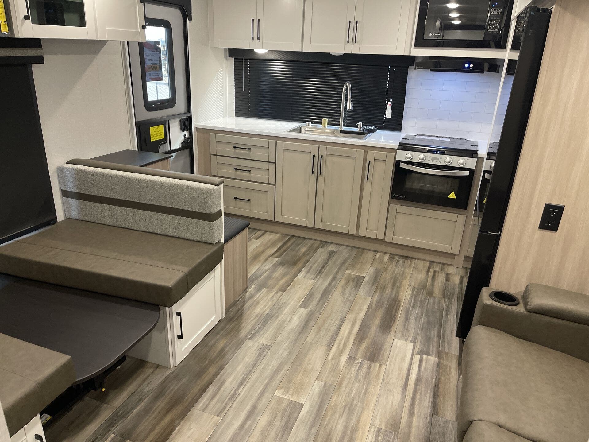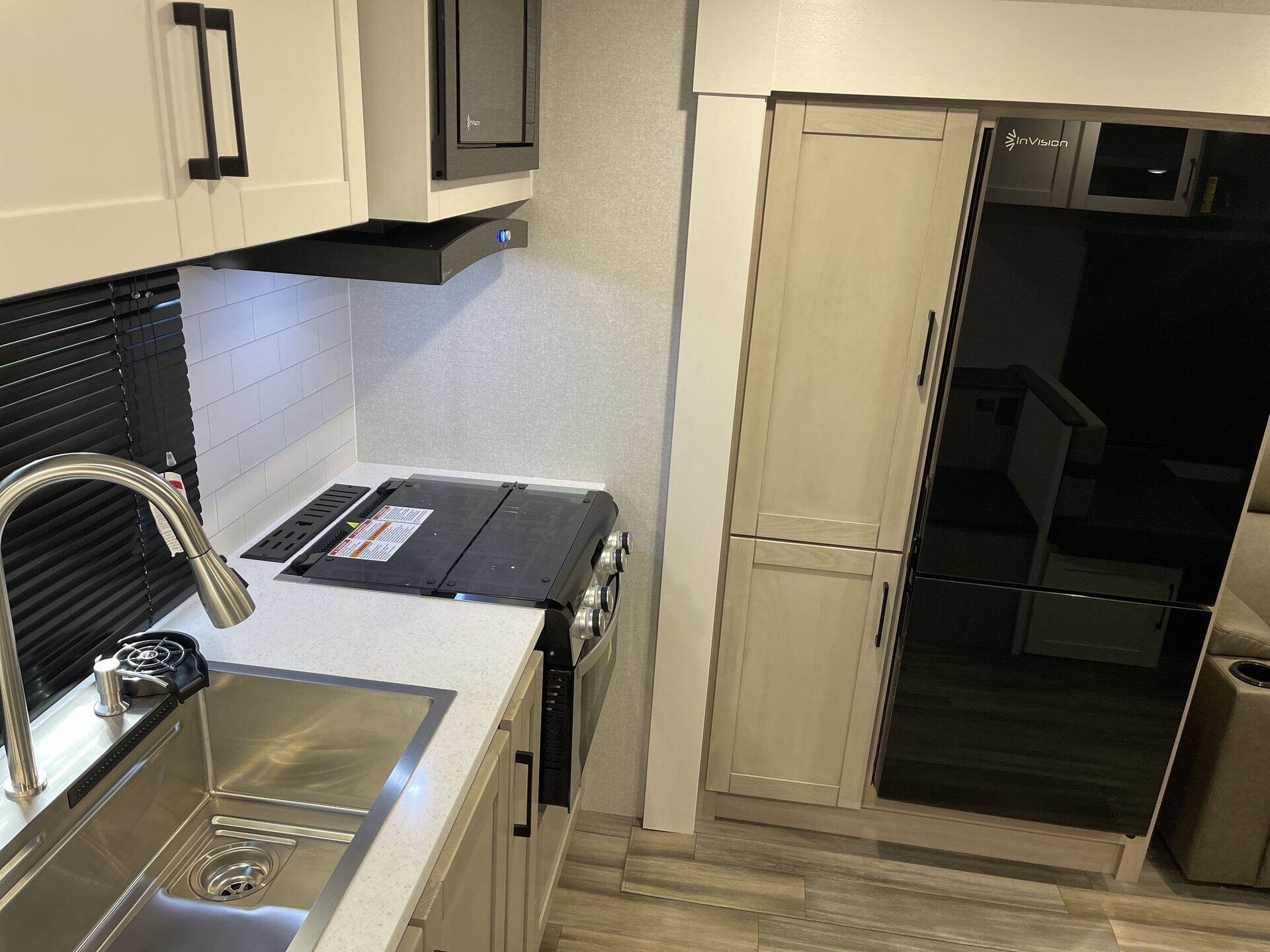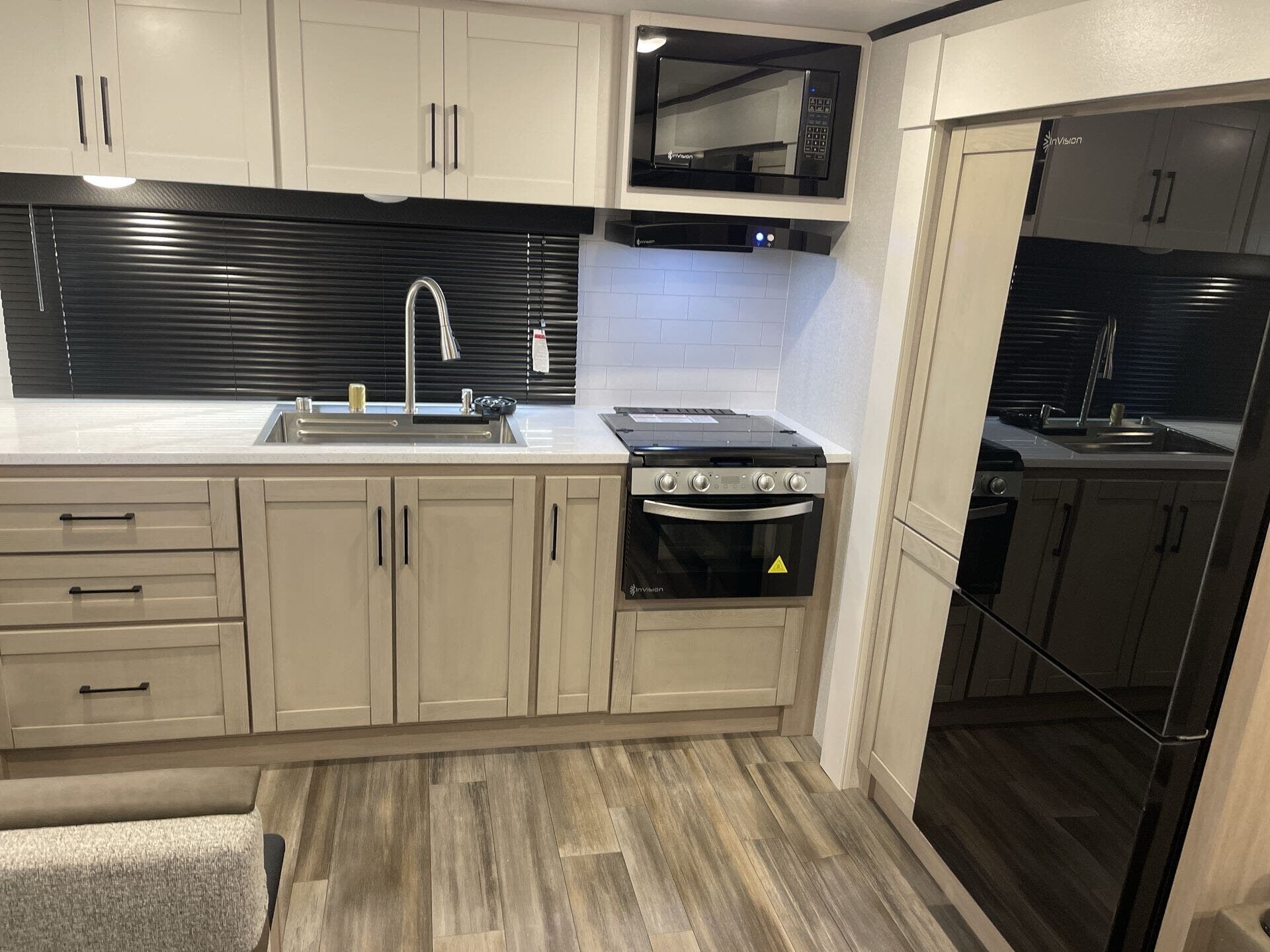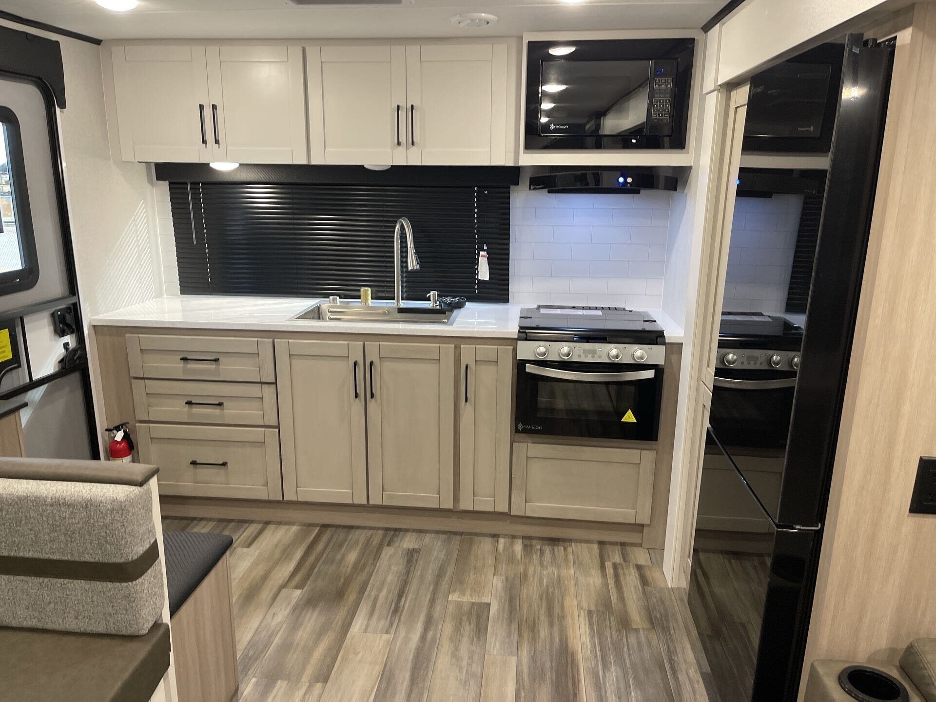 The kitchen has everything you need — fridge, stove, oven, counter space — and the tankless water heater plus good tank sizes mean you can stay out longer without stressing about hookups.