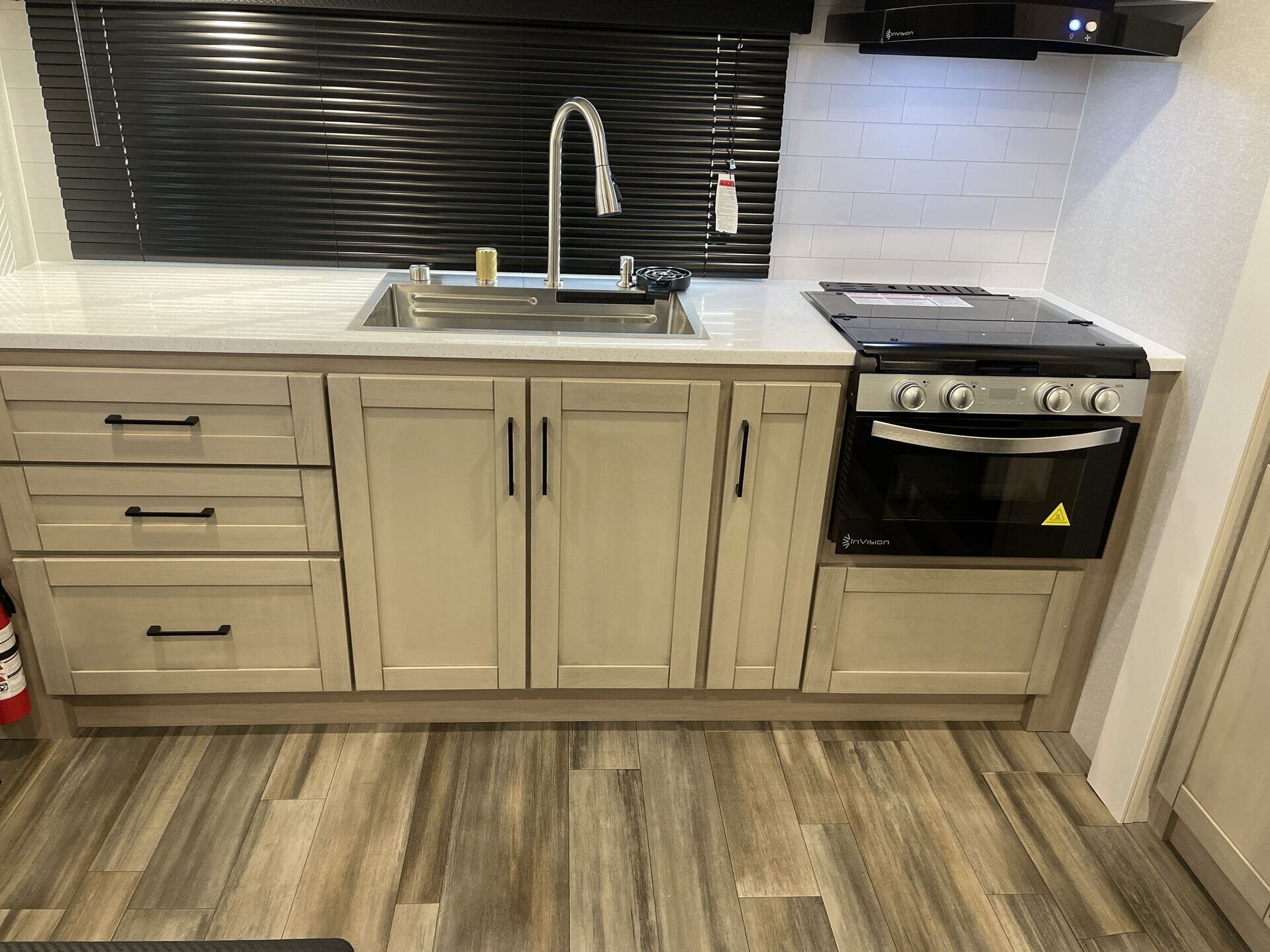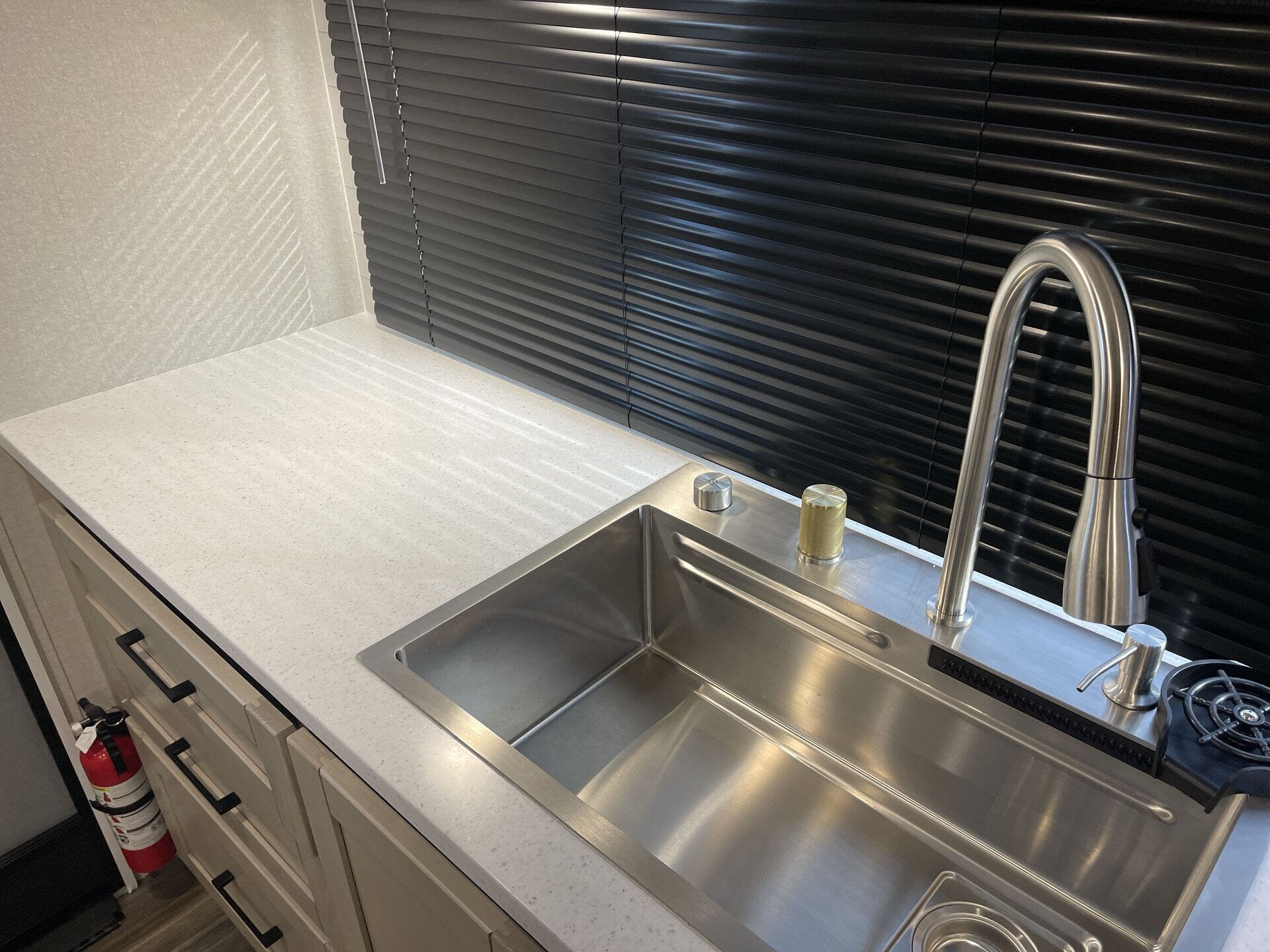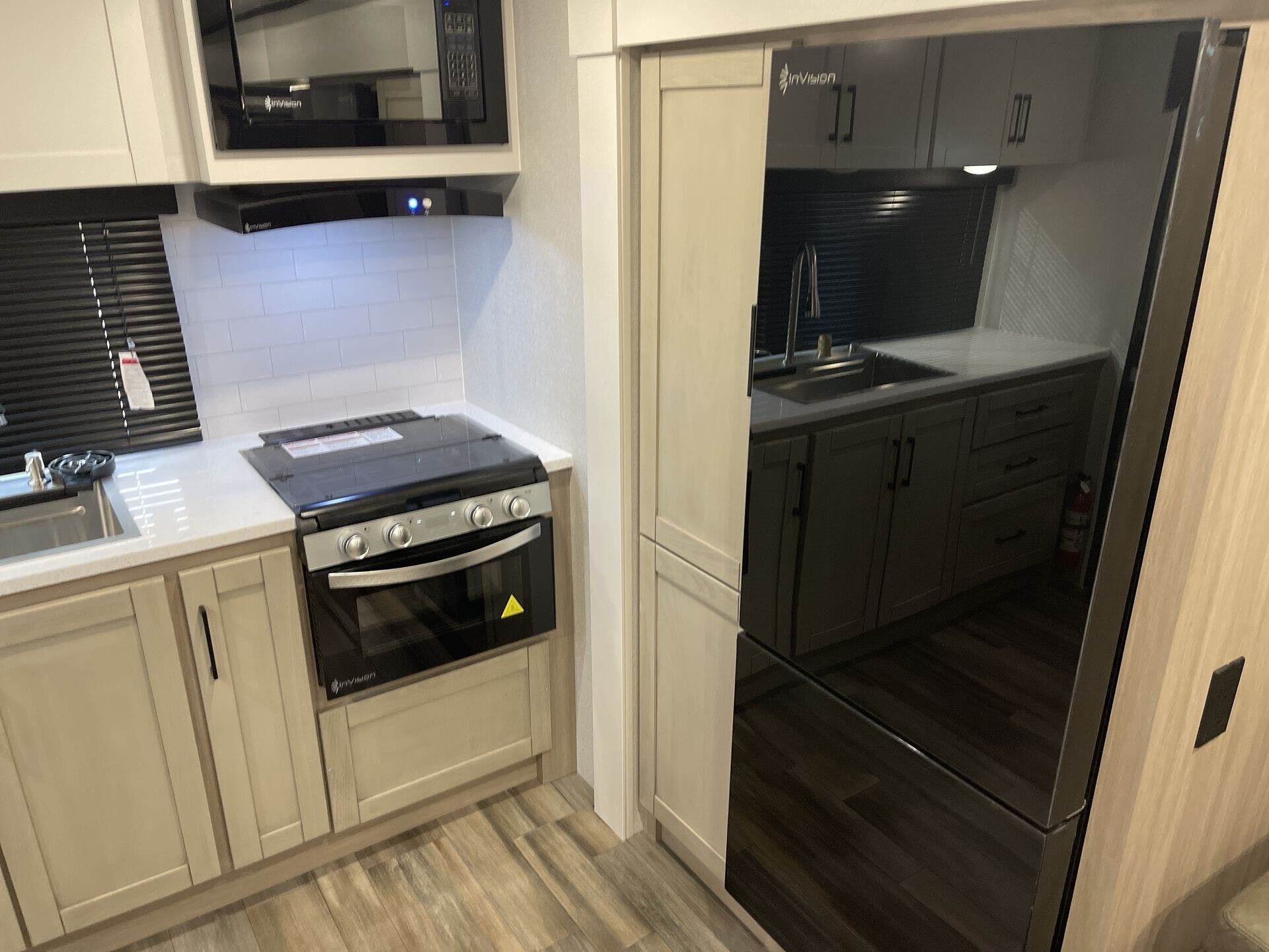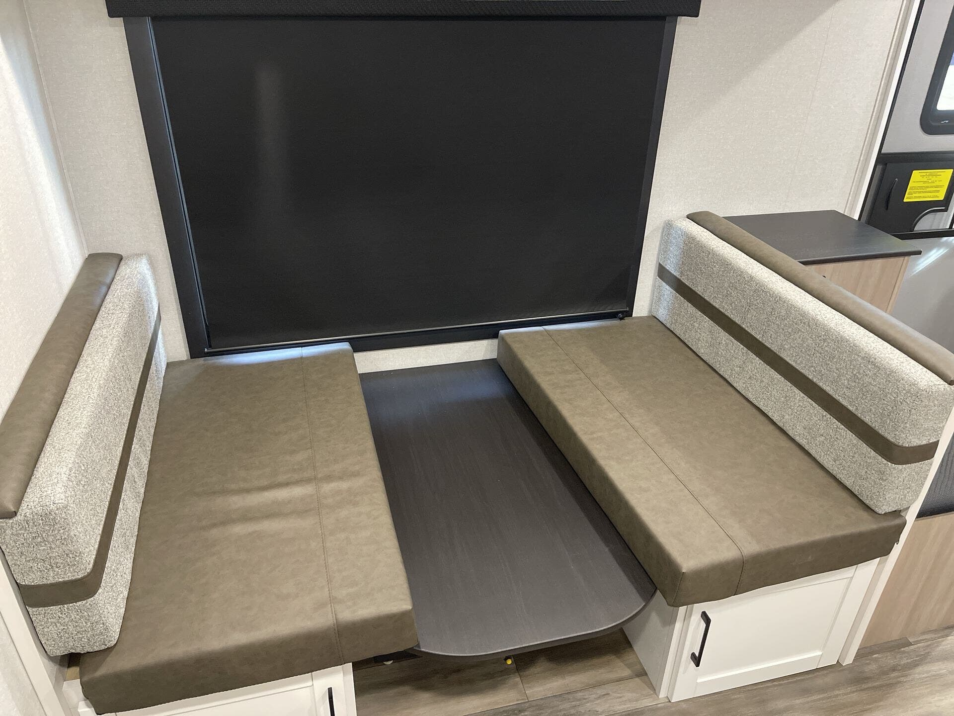 The kitchen has everything you need — fridge, stove, oven, counter space — and the tankless water heater plus good tank sizes mean you can stay out longer without stressing about hookups.