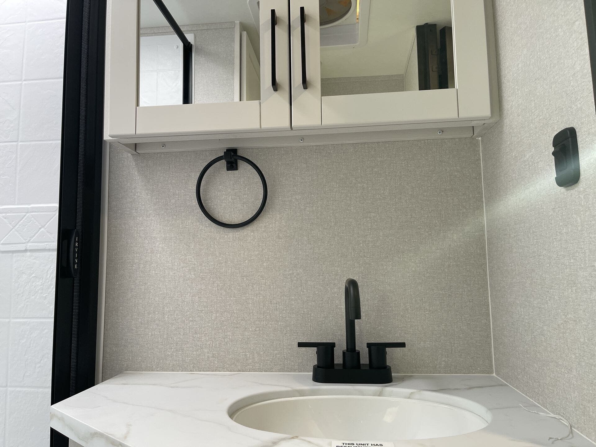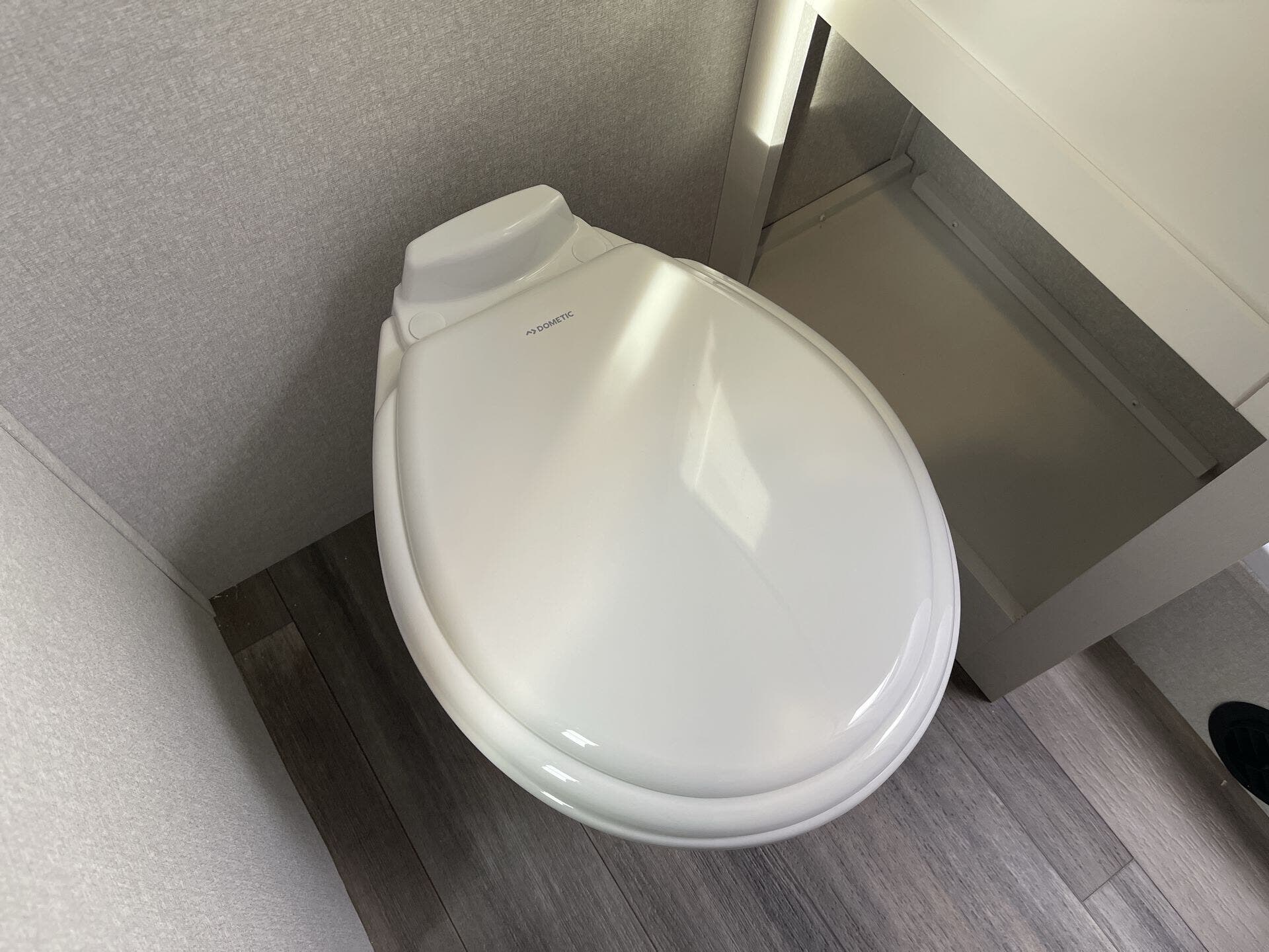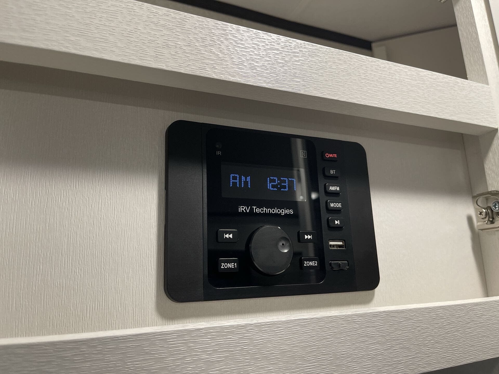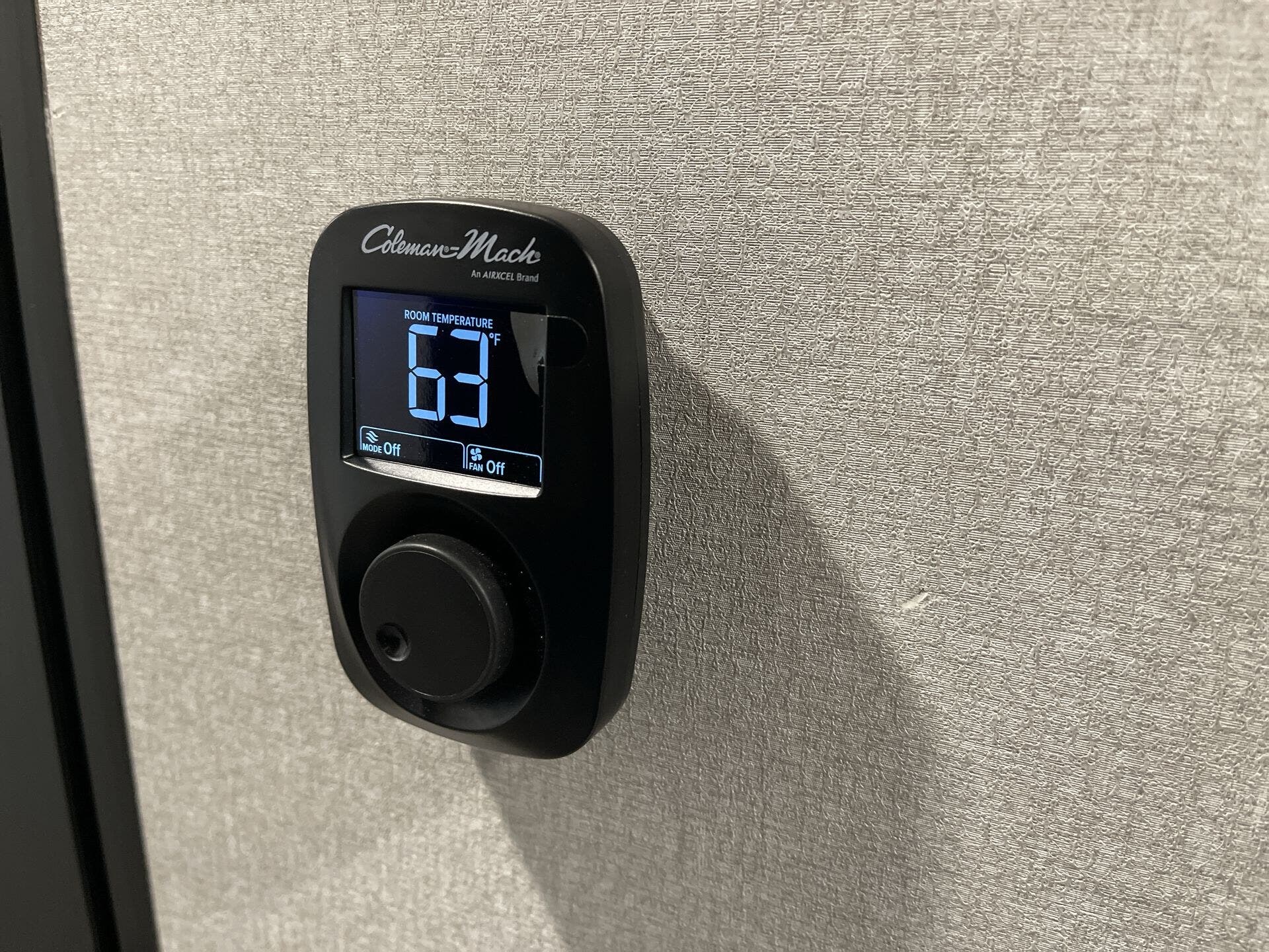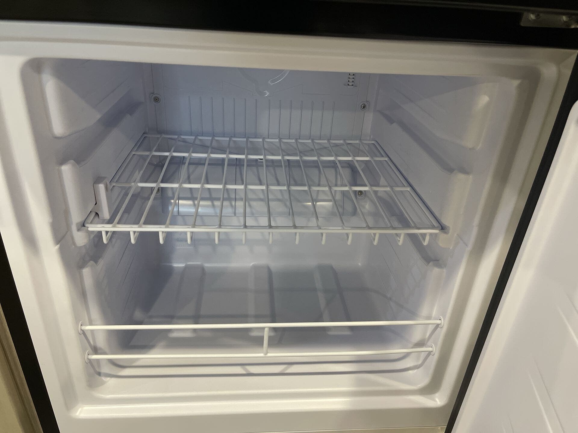 The kitchen has everything you need — fridge, stove, oven, counter space — and the tankless water heater plus good tank sizes mean you can stay out longer without stressing about hookups.
