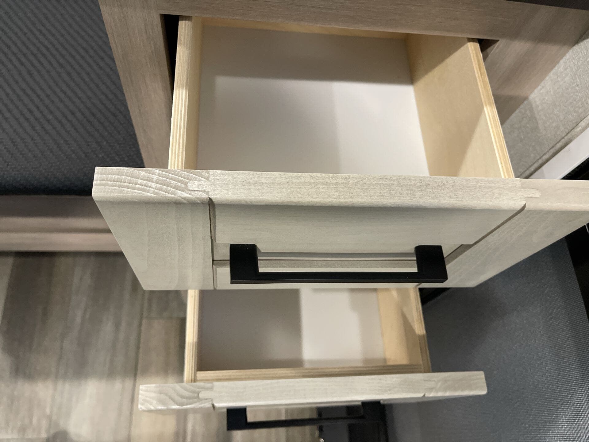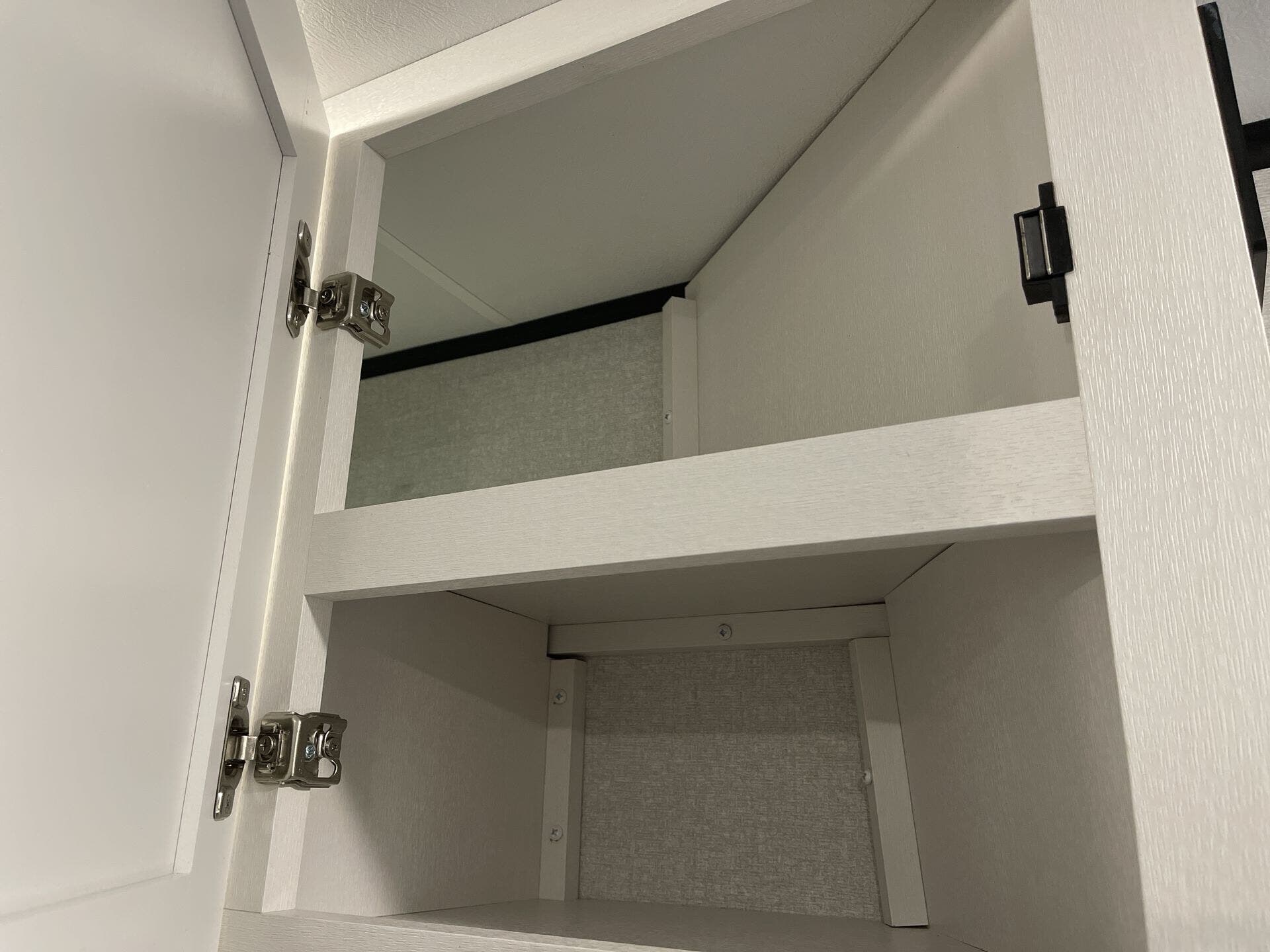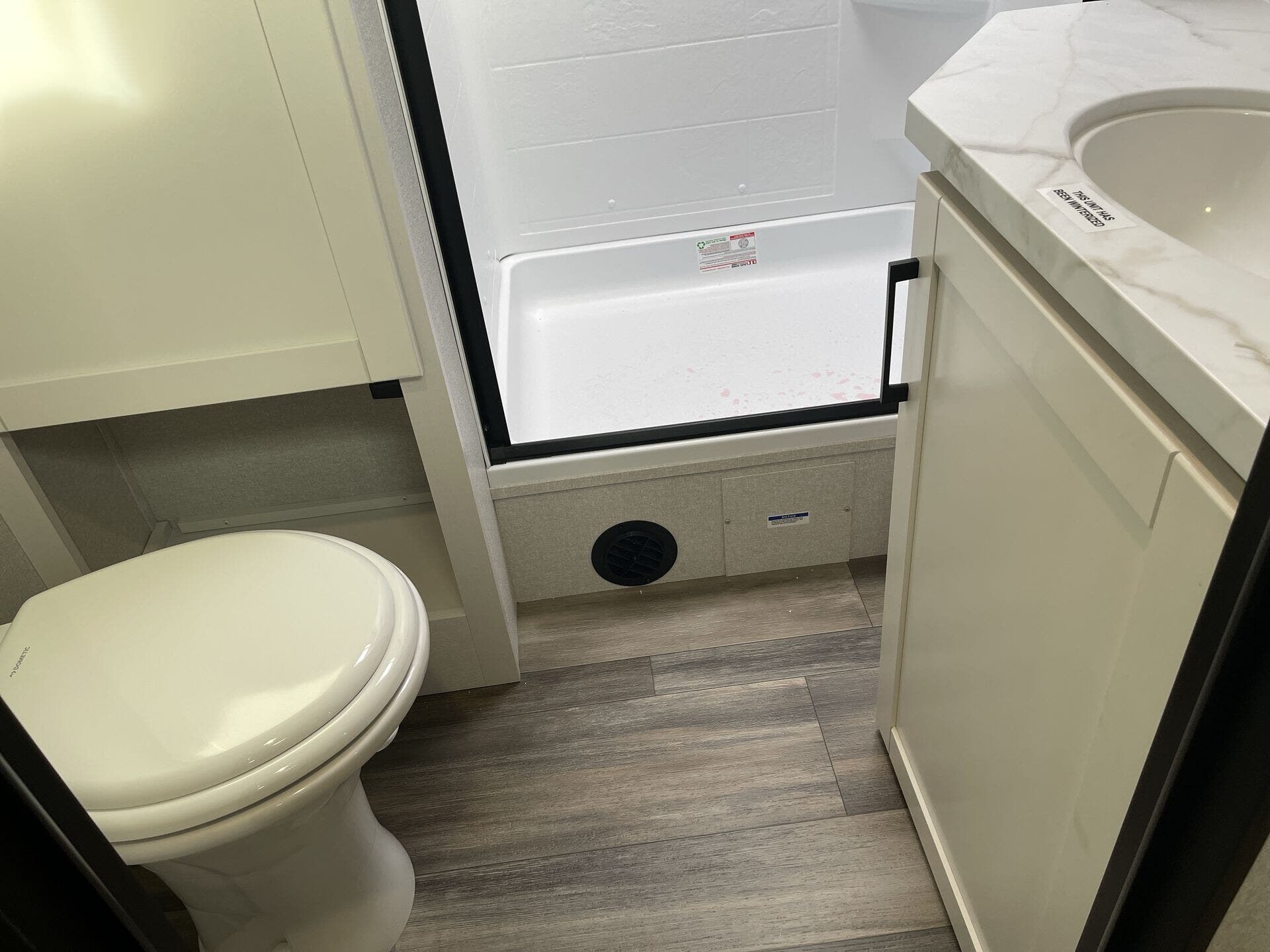 Bench Seat, Dinette Bed, Kitchen Sink, Medicine Cabinet, Non-Smoking Unit, Overhead Cabinetry, Pantry, Queen Bed, Removable Table, Roof Vents, Shower, Theater Seating, Toilet, Wardrobe(s)