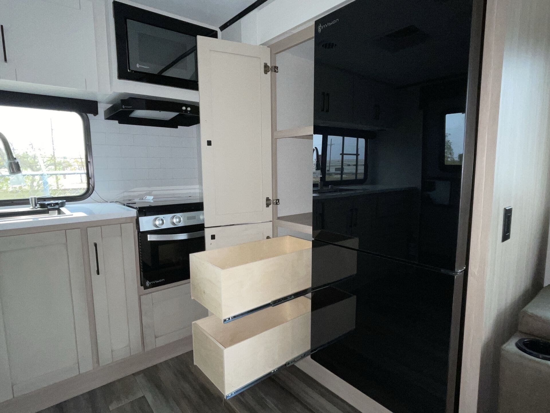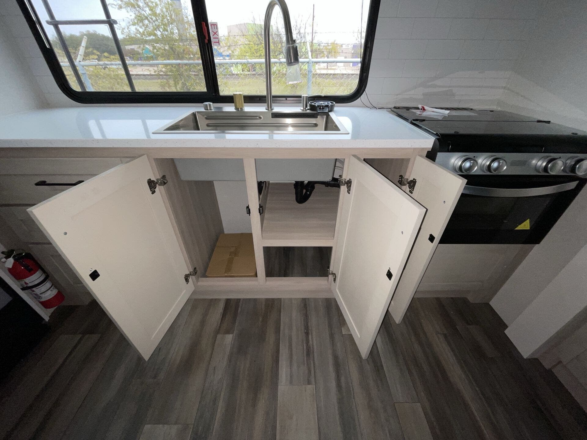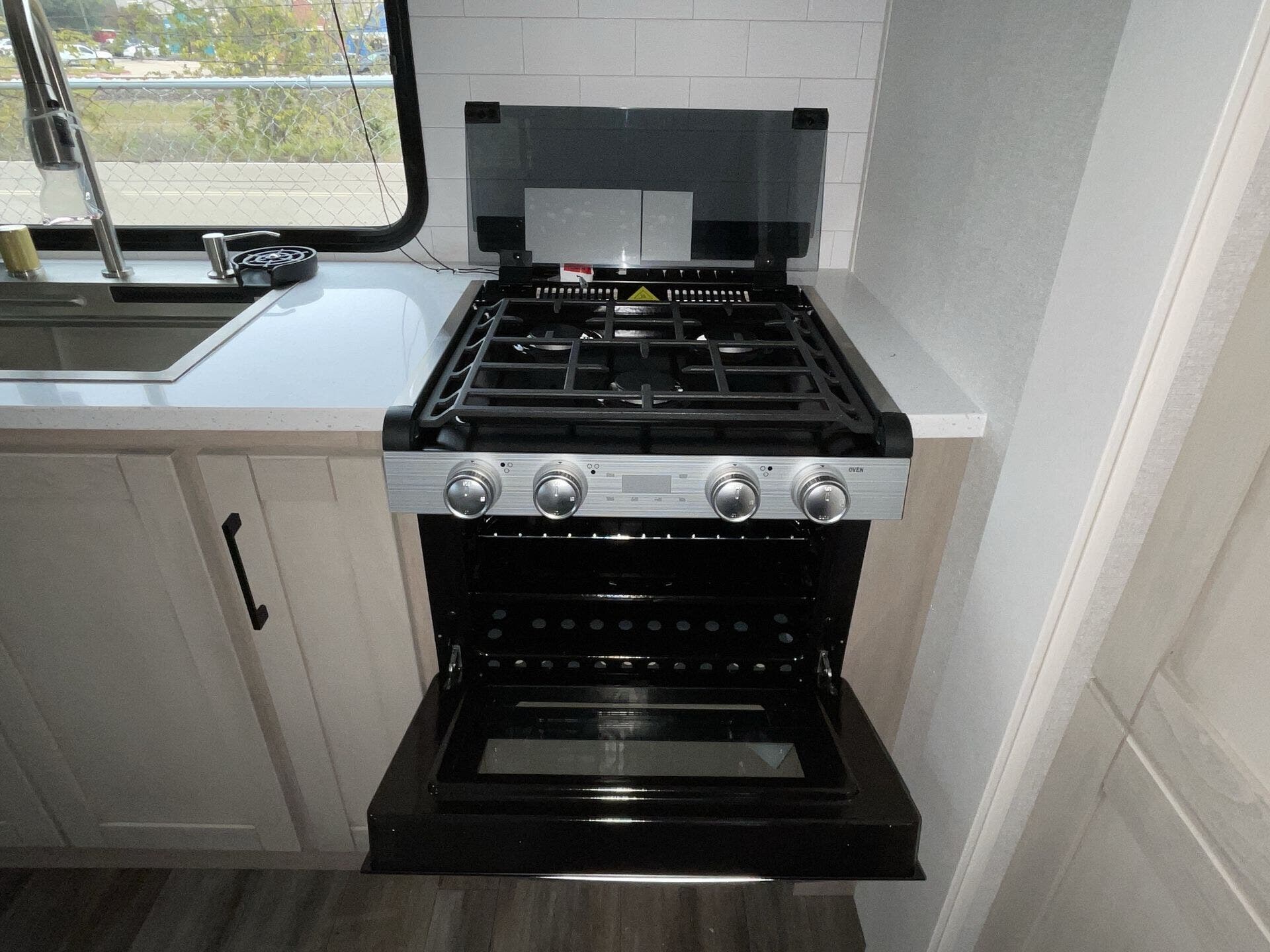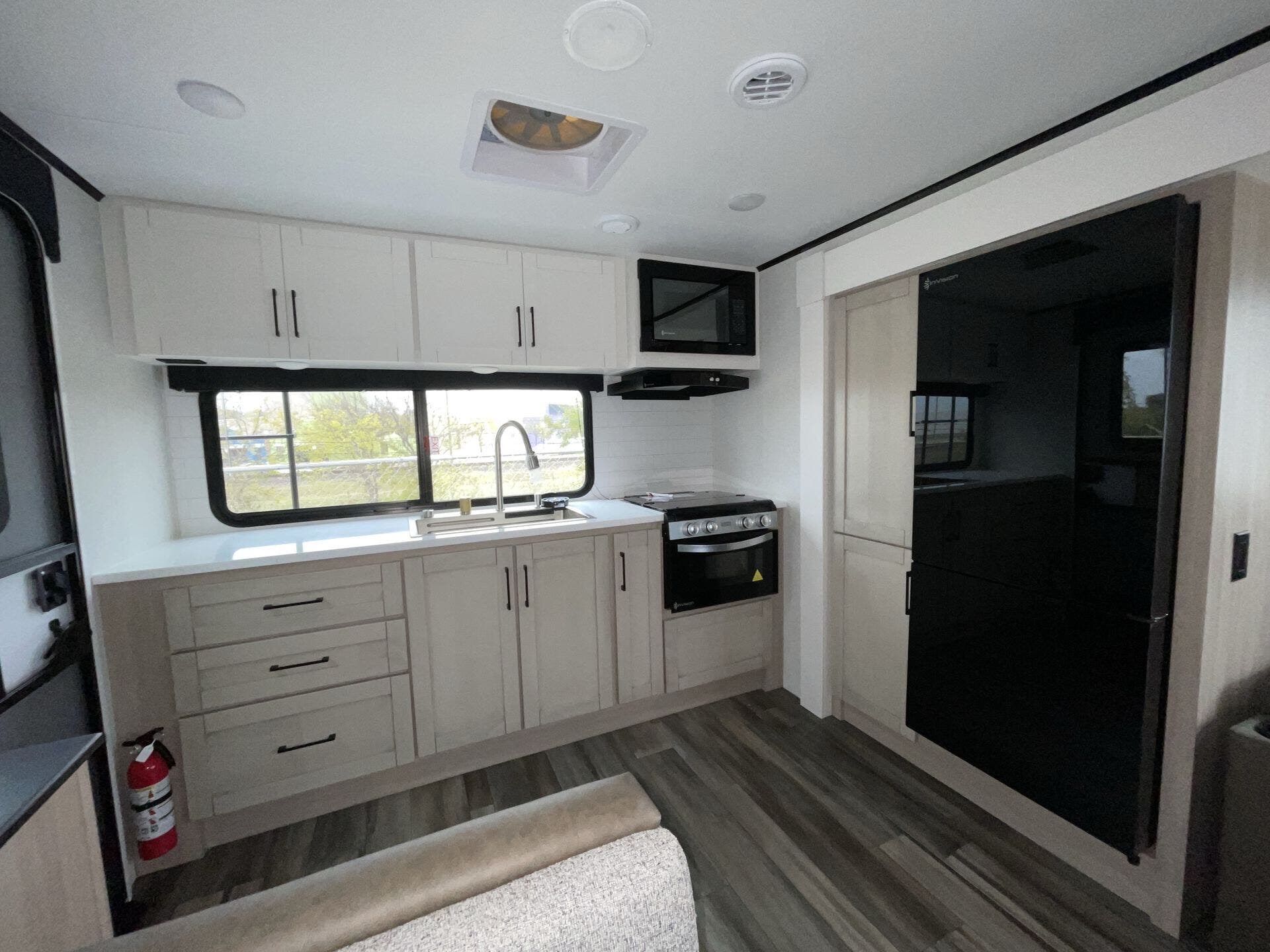 The kitchen has everything you need — fridge, stove, oven, counter space — and the tankless water heater plus good tank sizes mean you can stay out longer without stressing about hookups.