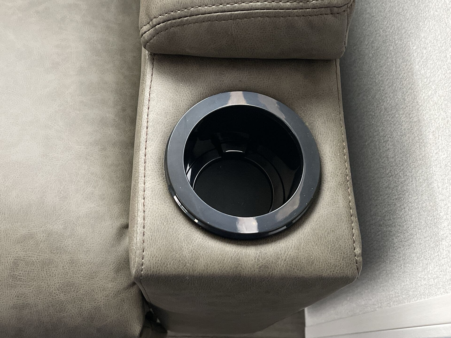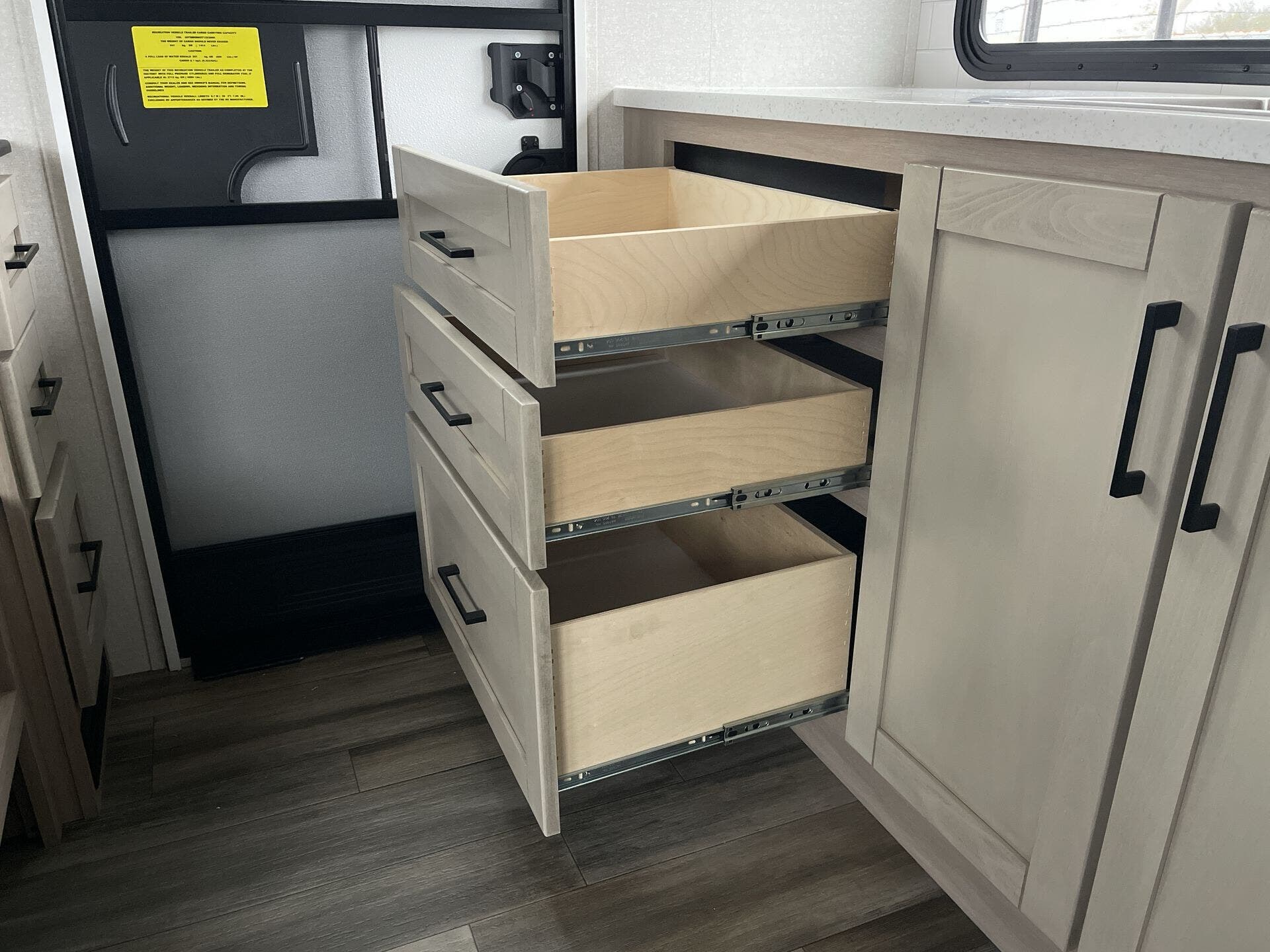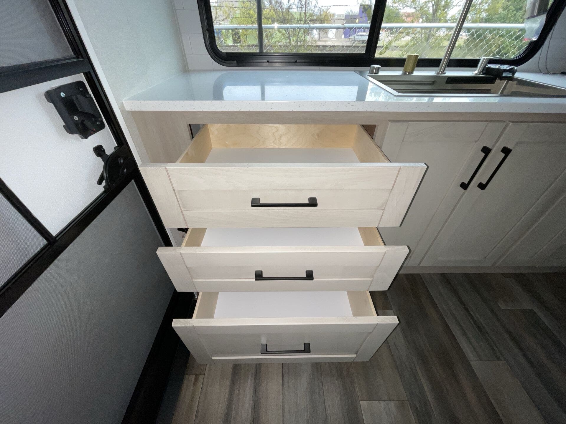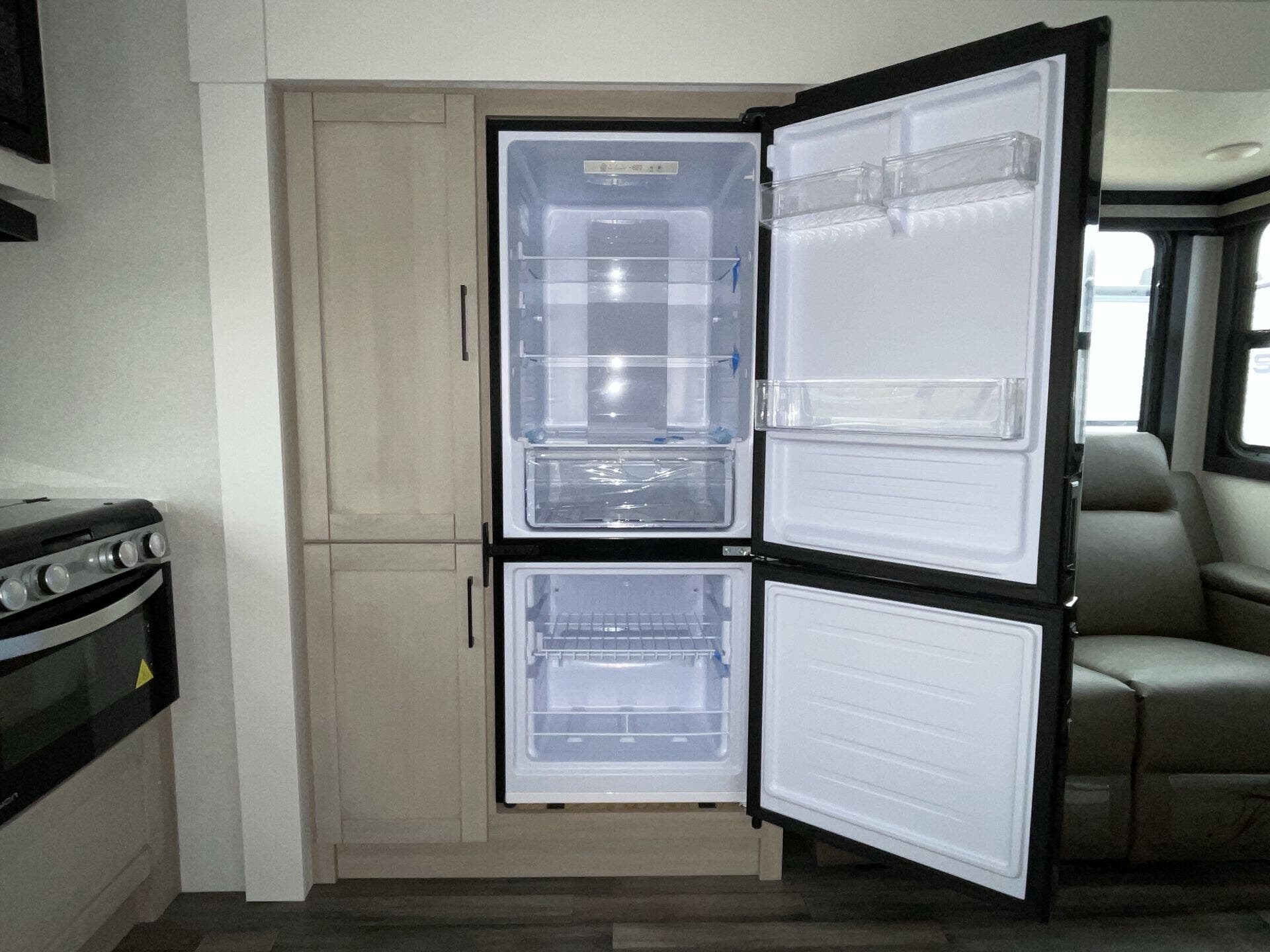The kitchen has everything you need — fridge, stove, oven, counter space — and the tankless water heater plus good tank sizes mean you can stay out longer without stressing about hookups.