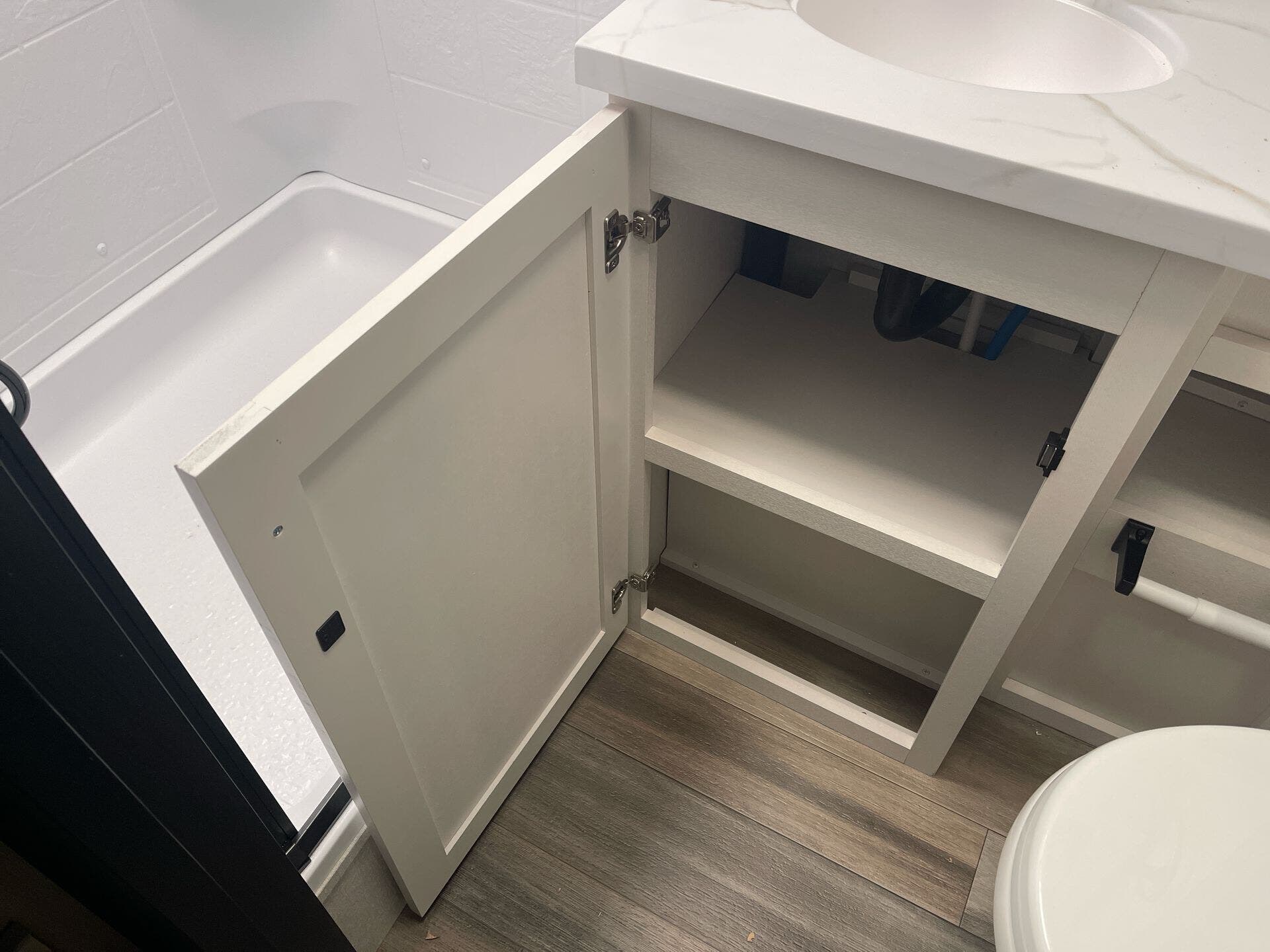 - Well-appointed kitchen and bath amenities, including a kitchen sink, dinette, and a full shower and toilet setup.