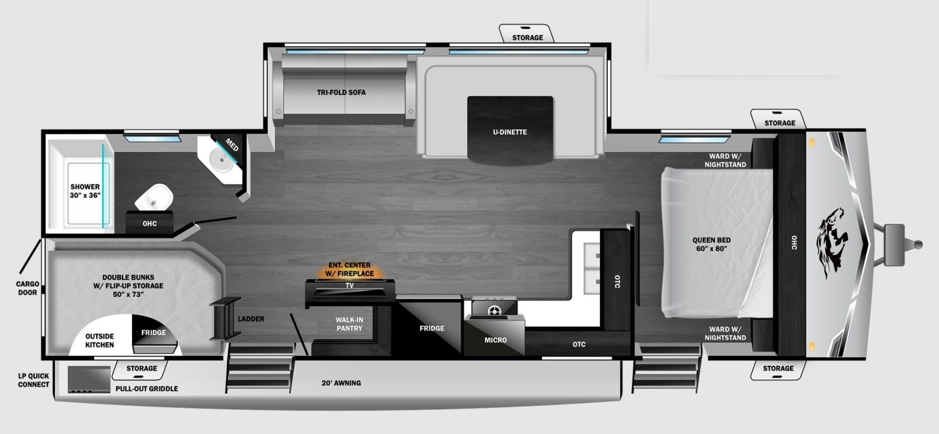 - 32’ 3” travel trailer with family-friendly bunkhouse layout