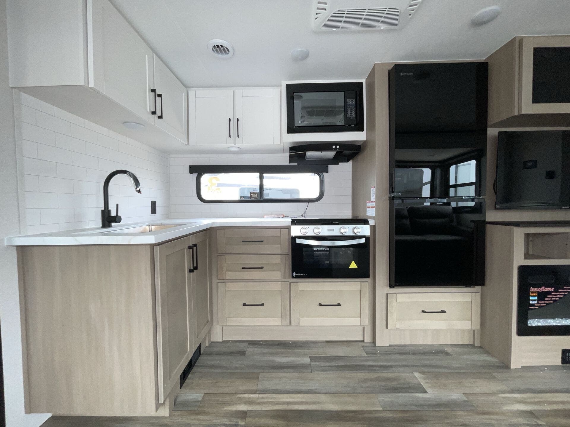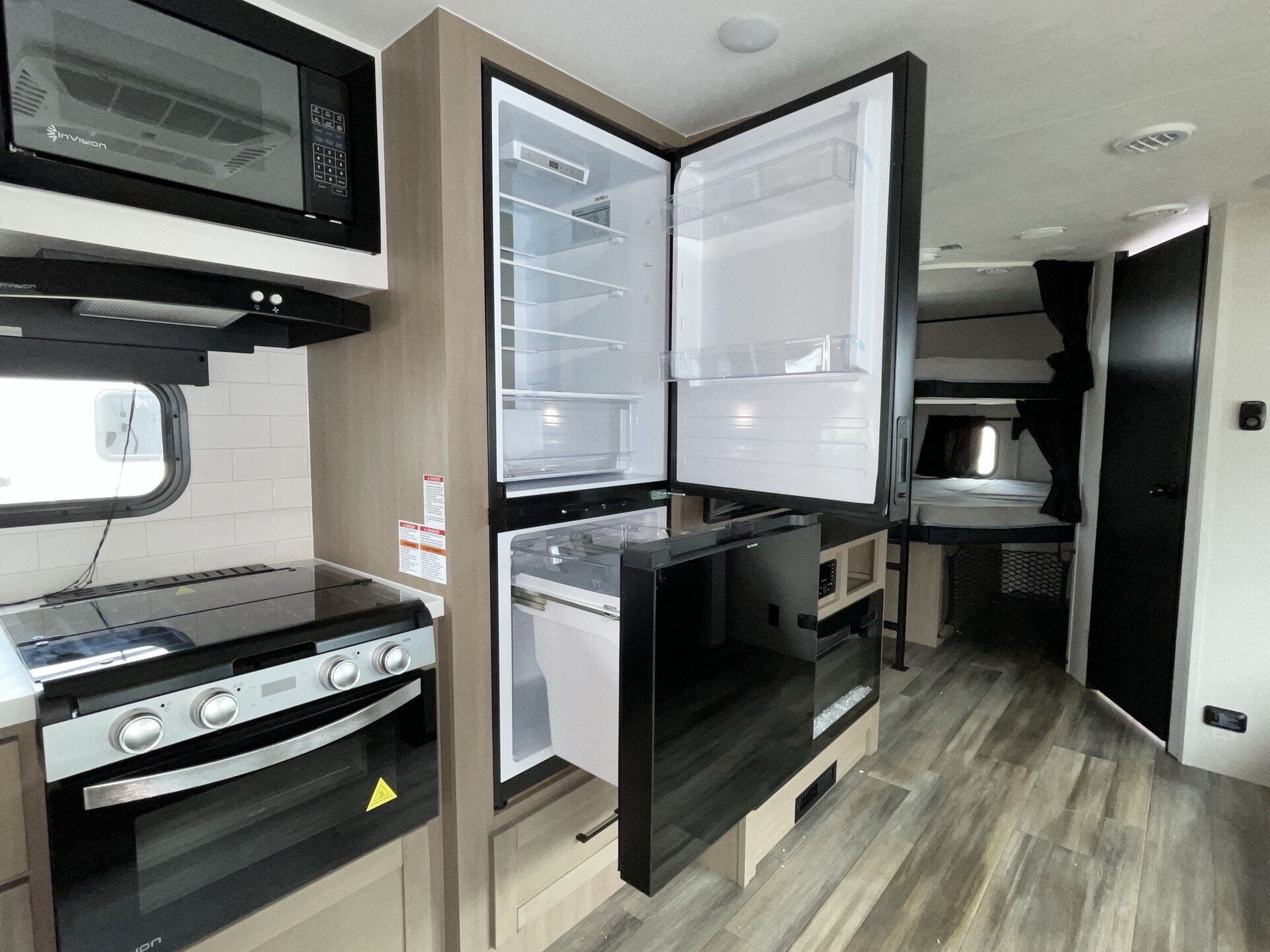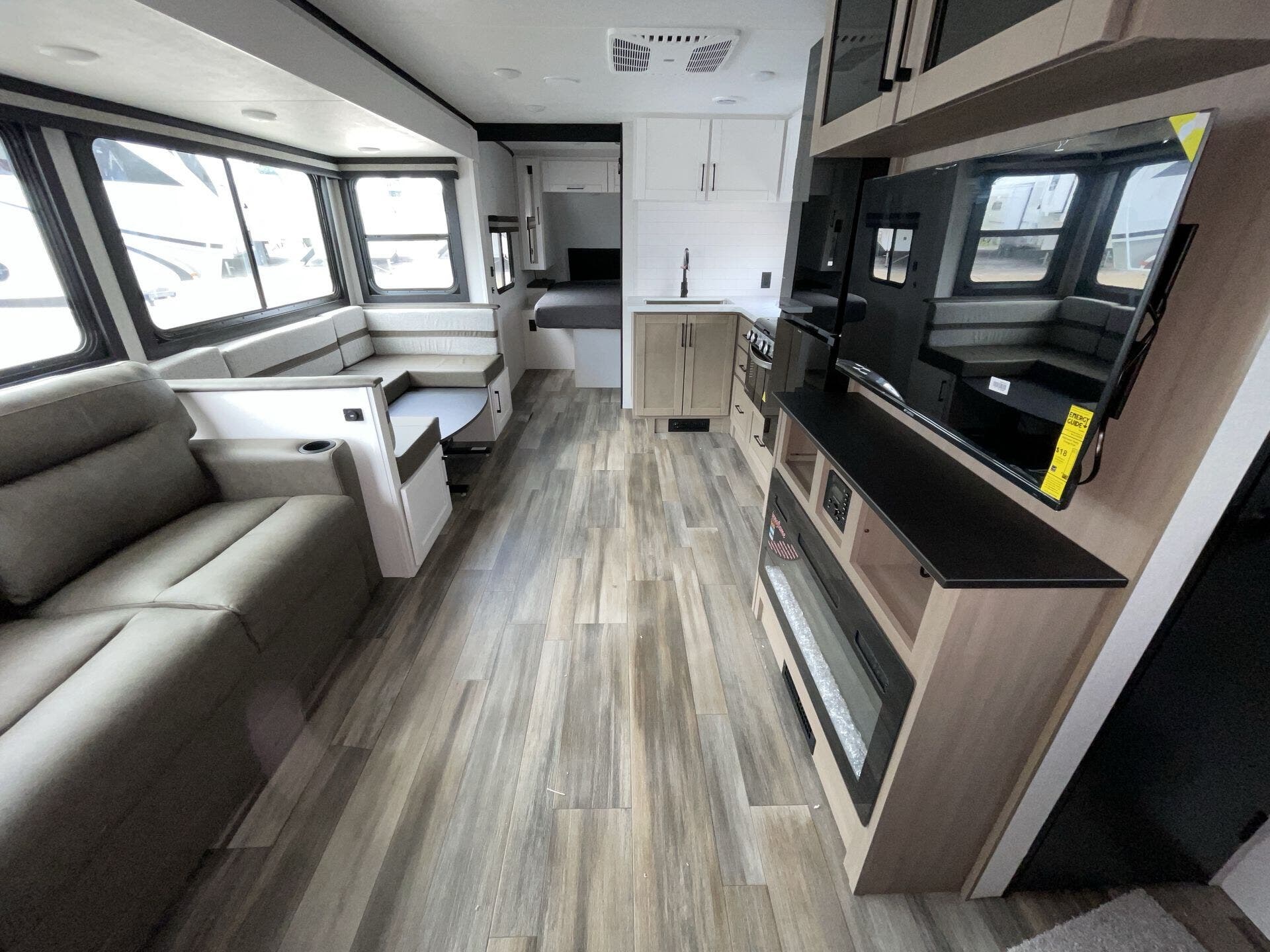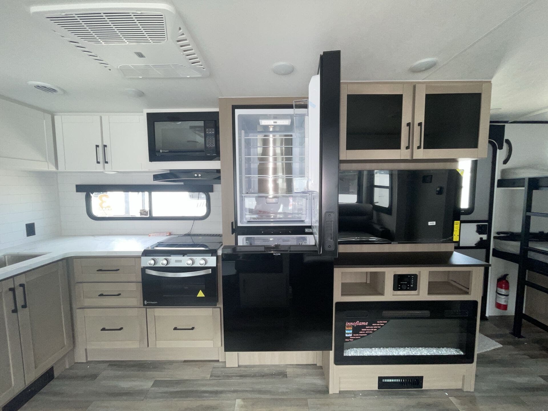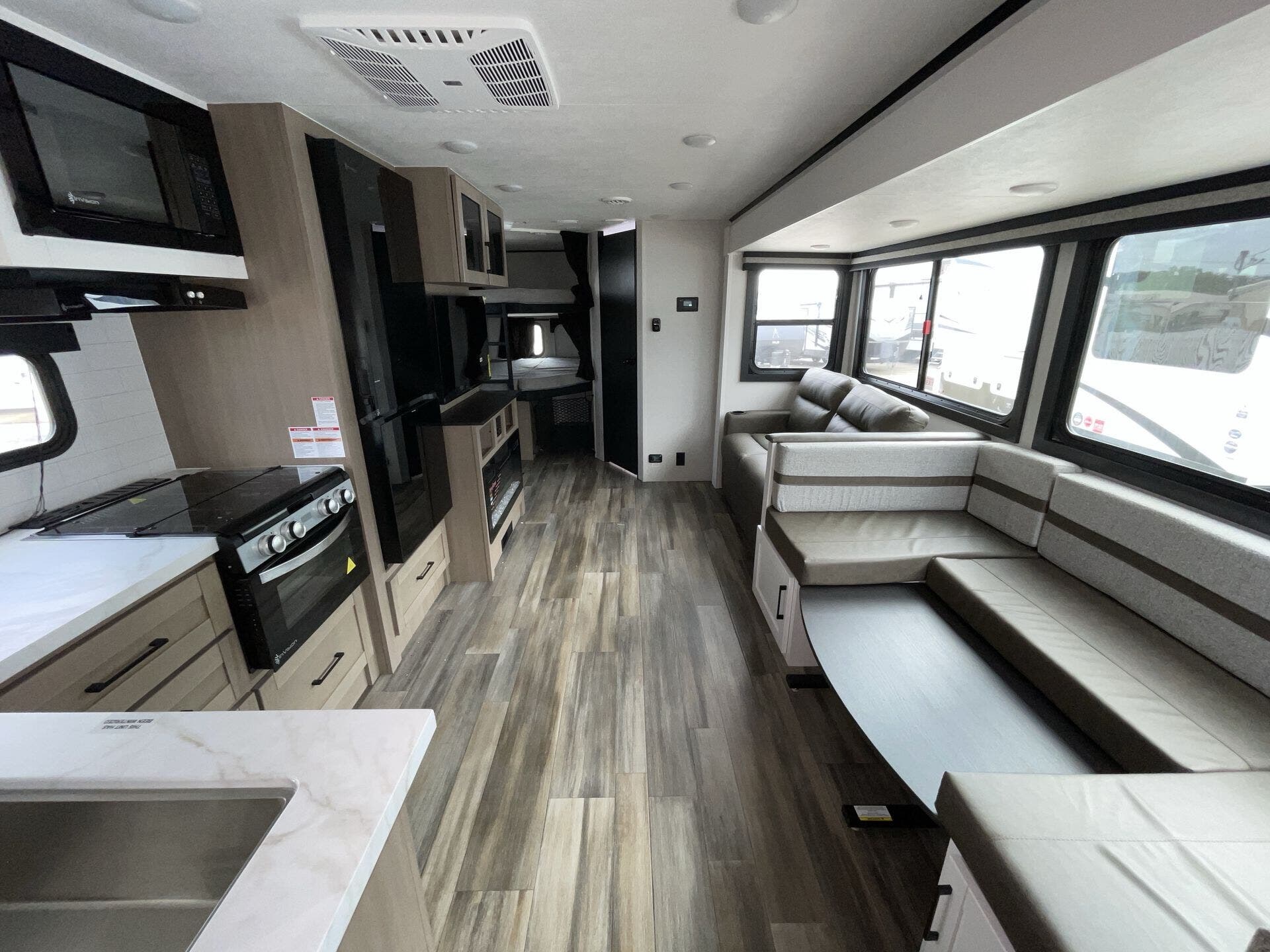 The kitchen is fully equipped for real-world use, featuring modern appliances, ample counter space, and a large refrigerator—making it easy to cook whether you're on a weekend getaway or an extended trip. The rear bathroom adds convenience with a full shower and smart storage.