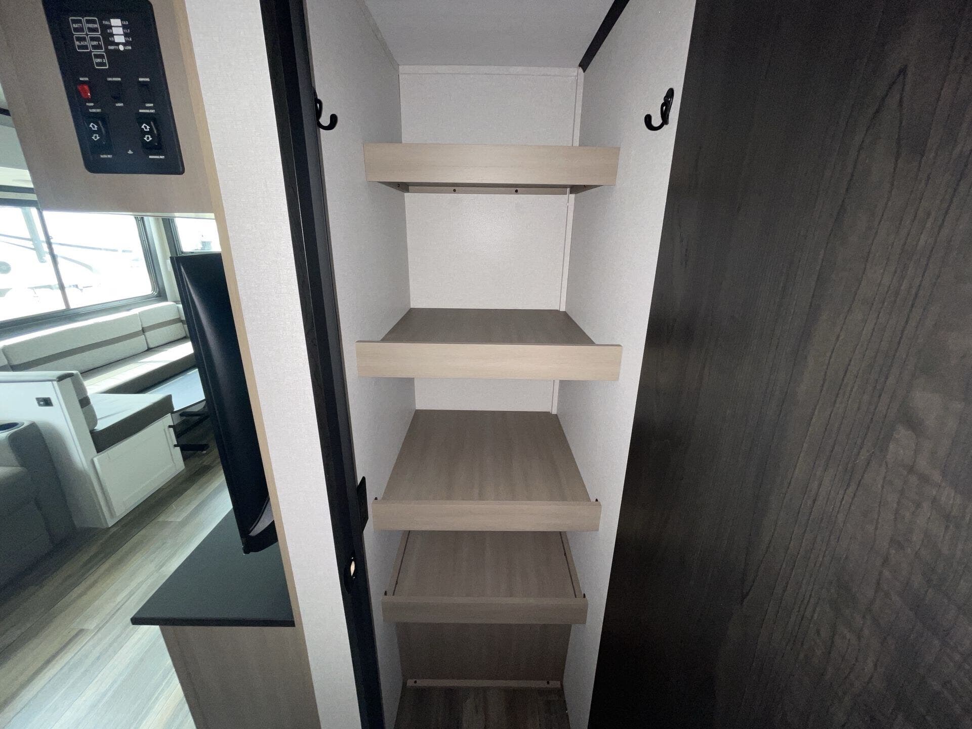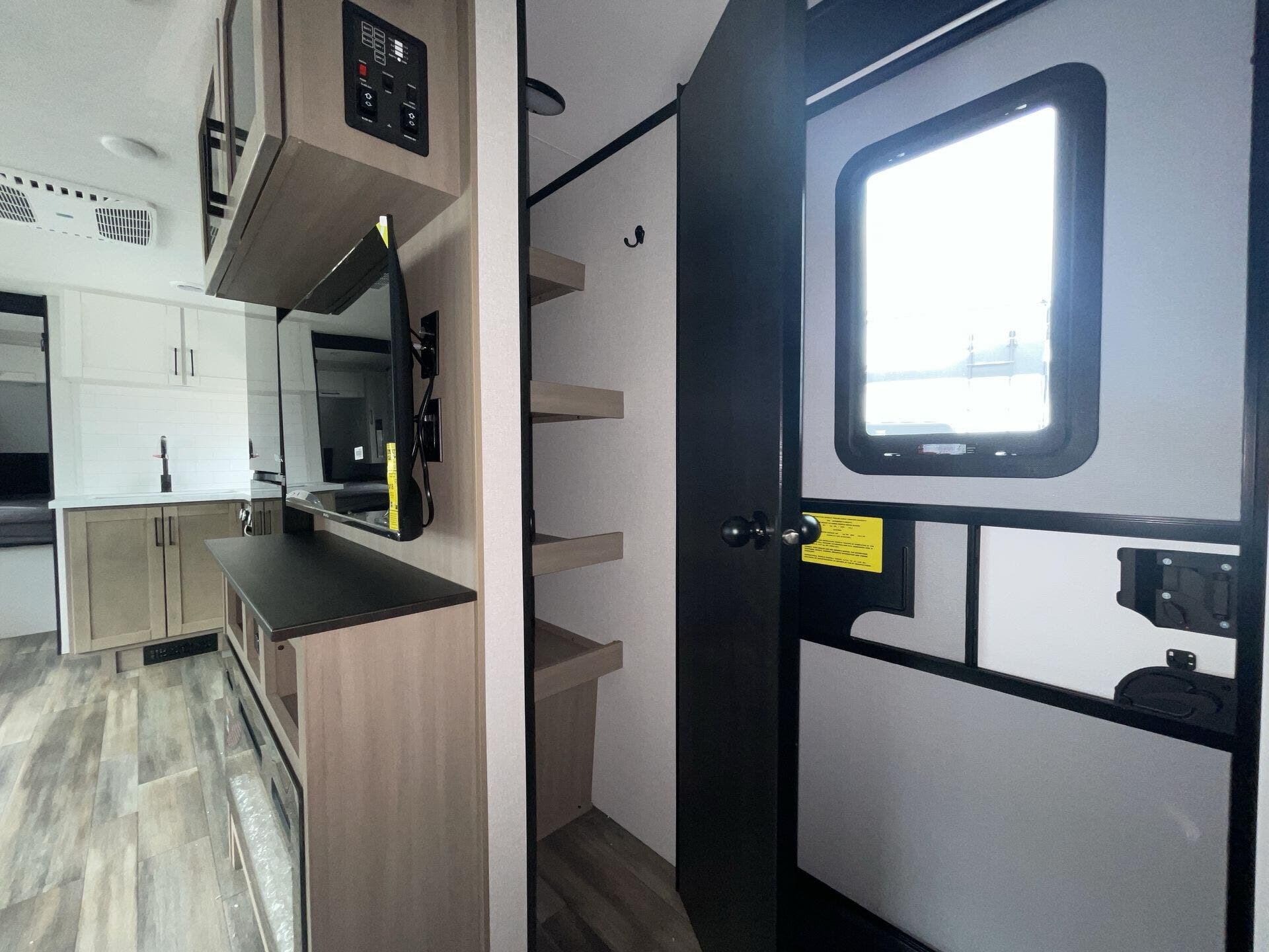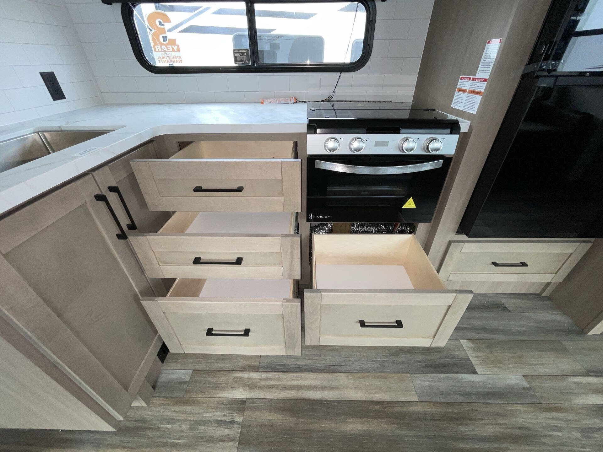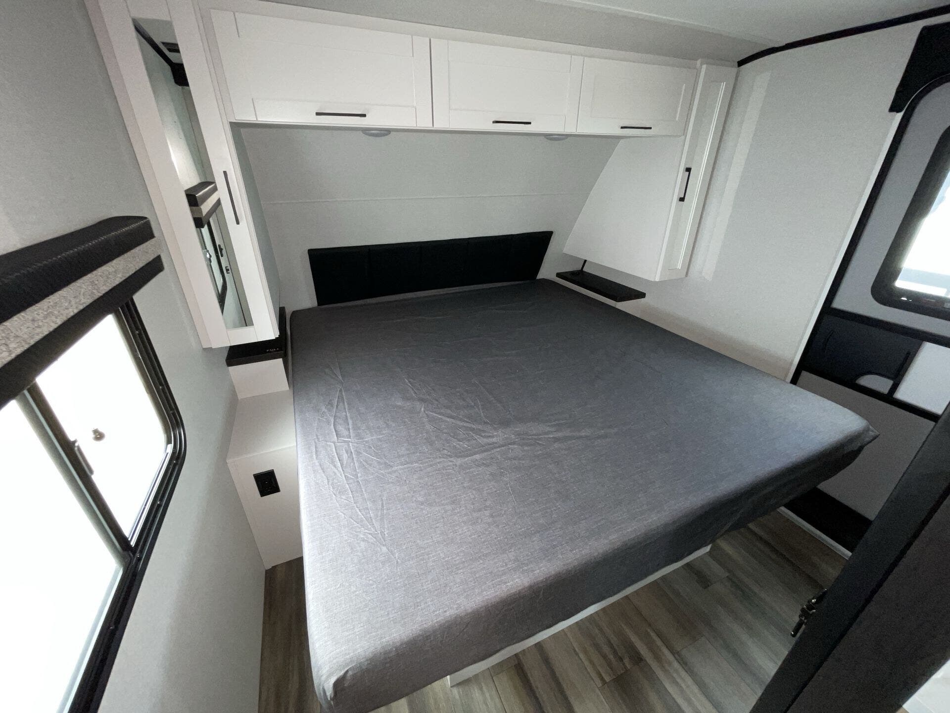 The kitchen is fully equipped for real-world use, featuring modern appliances, ample counter space, and a large refrigerator—making it easy to cook whether you're on a weekend getaway or an extended trip. The rear bathroom adds convenience with a full shower and smart storage.