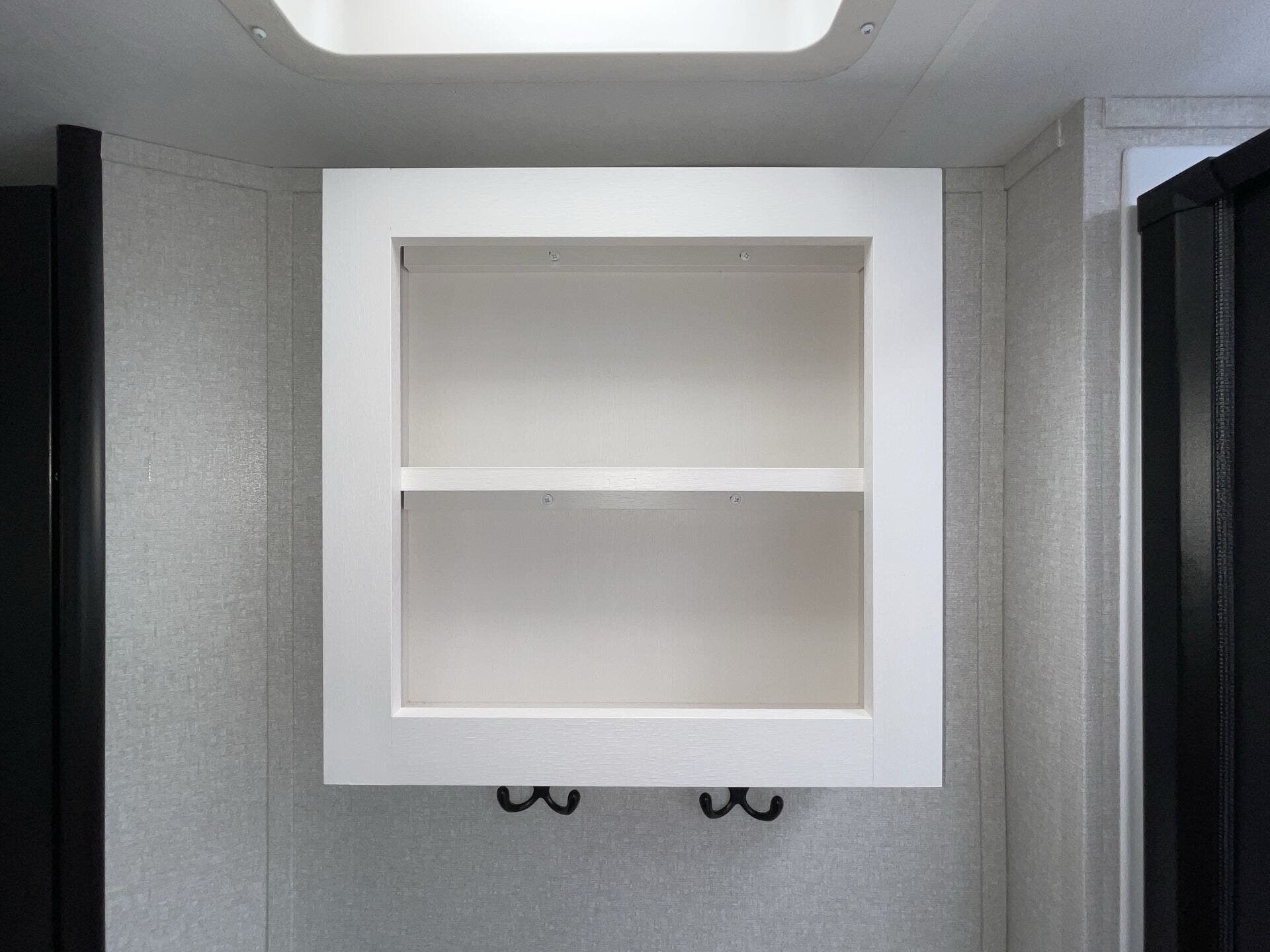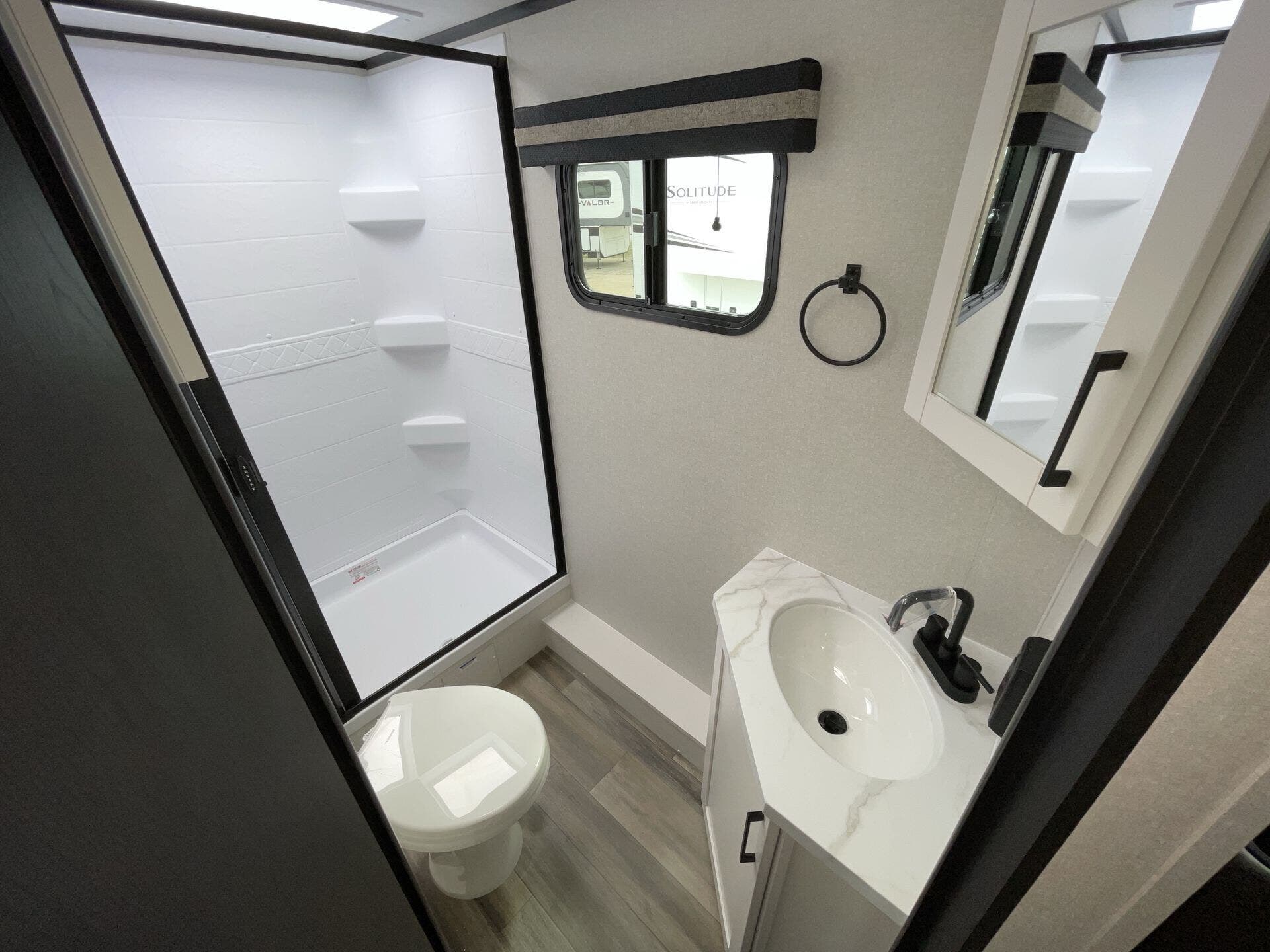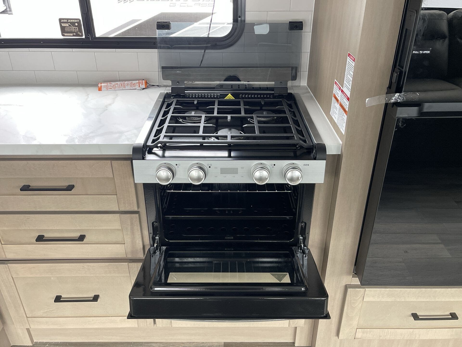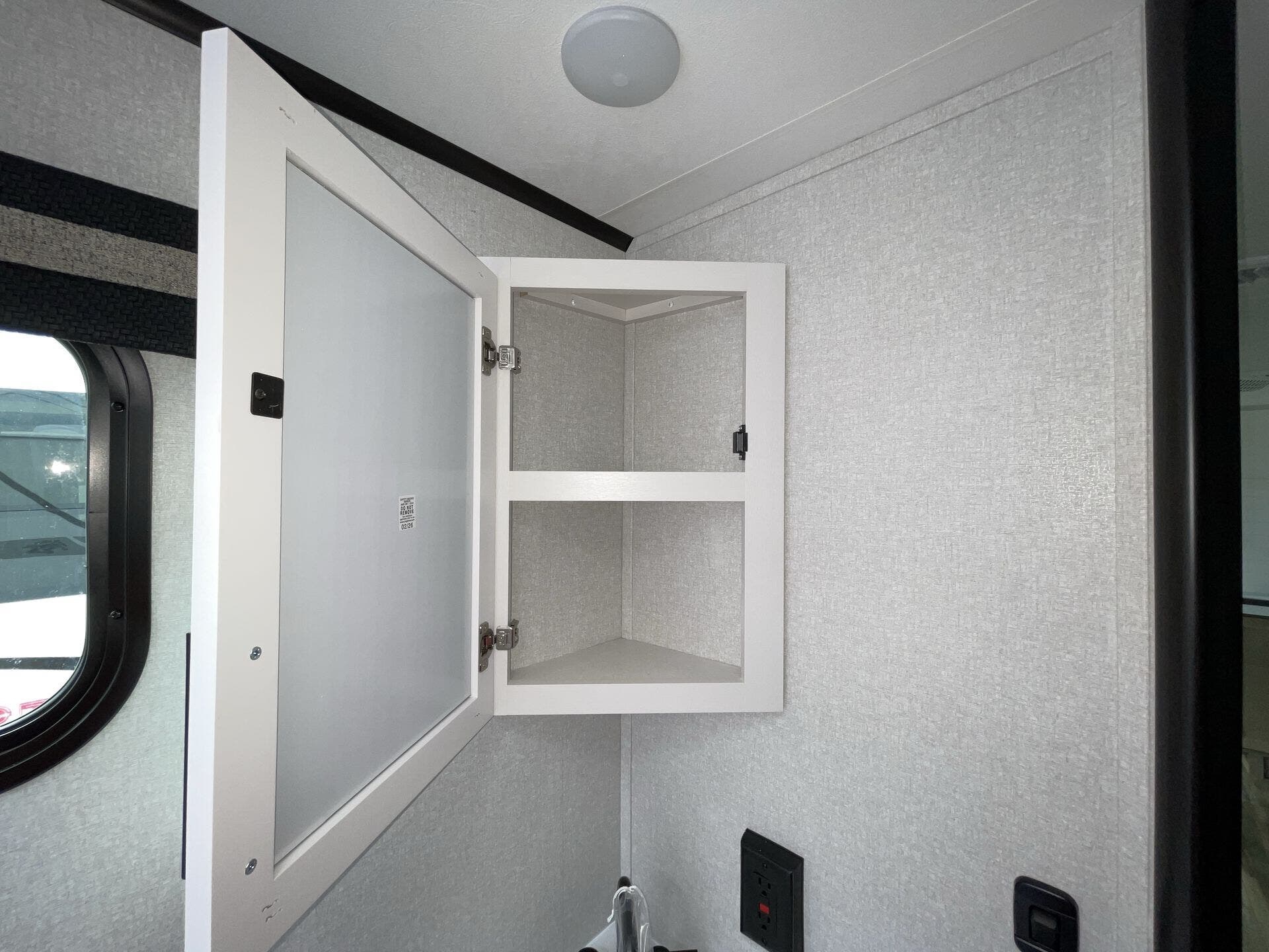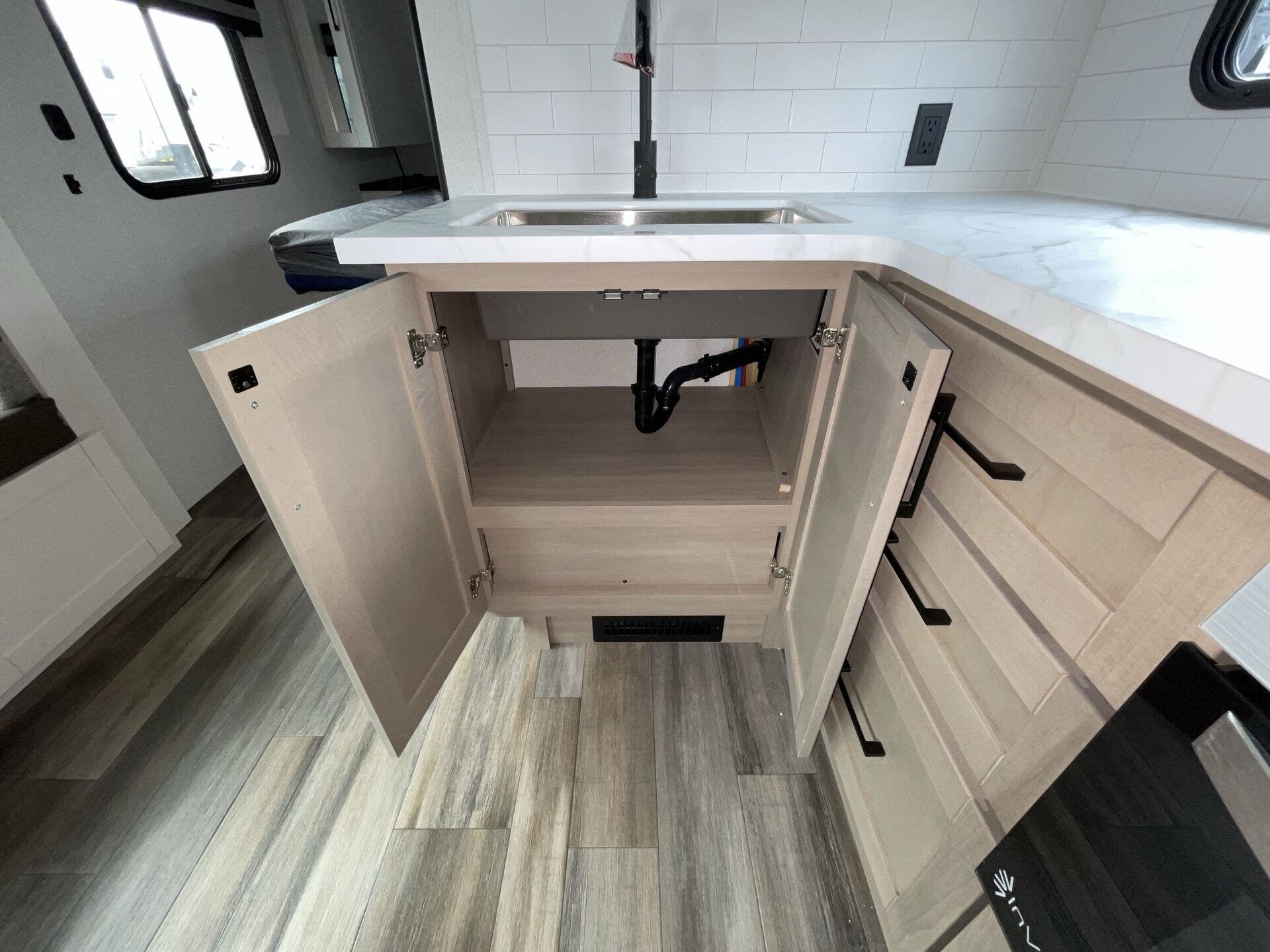 The kitchen is fully equipped for real-world use, featuring modern appliances, ample counter space, and a large refrigerator—making it easy to cook whether you're on a weekend getaway or an extended trip. The rear bathroom adds convenience with a full shower and smart storage.
