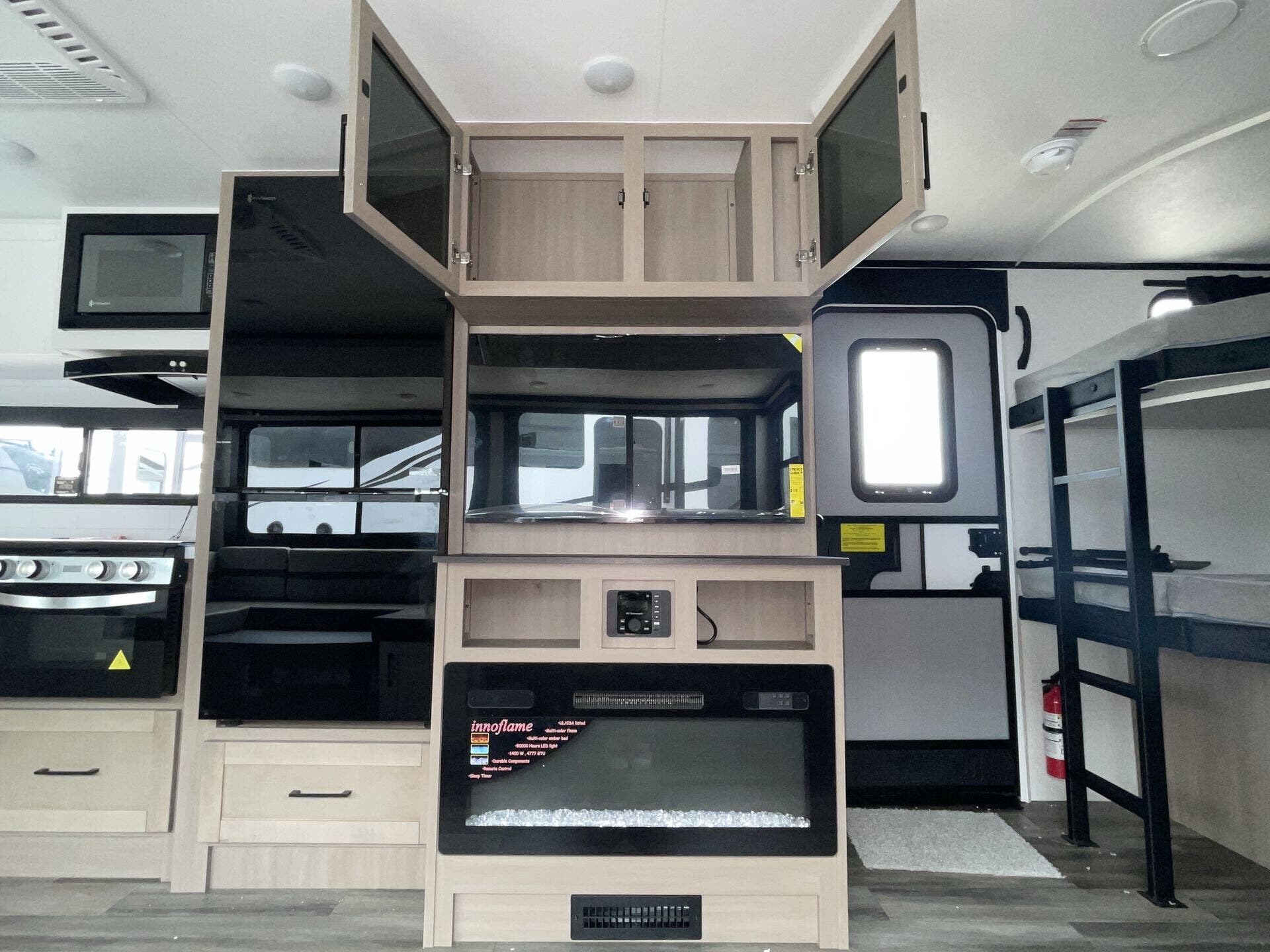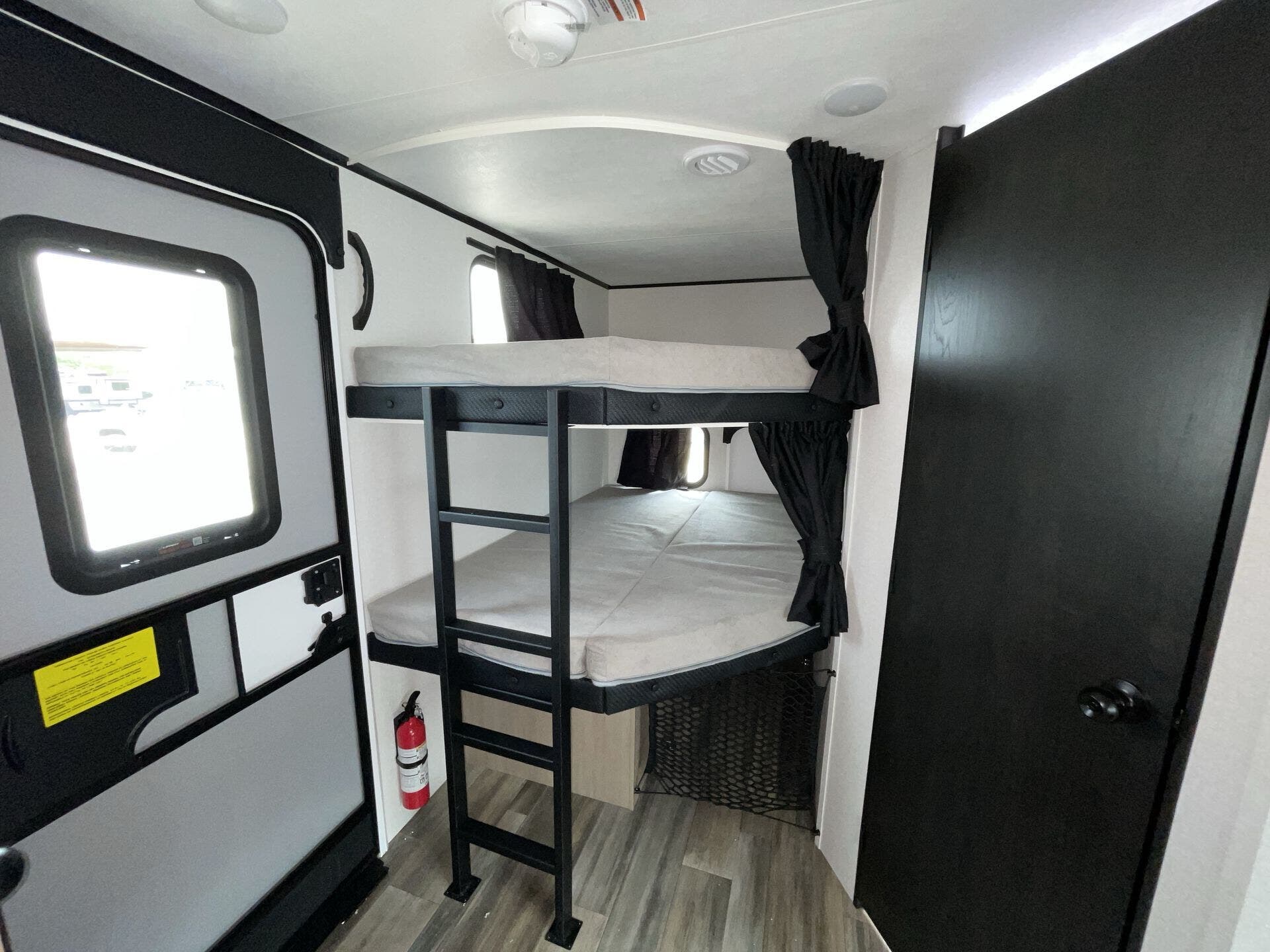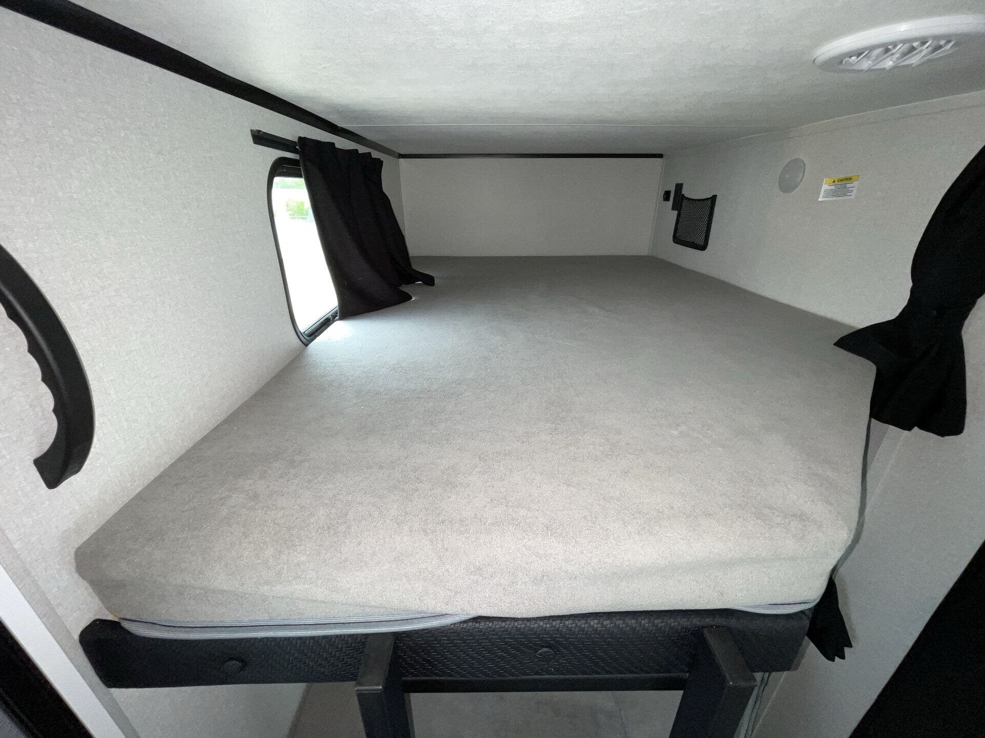 Inside, the layout is optimized for both comfort and functionality. The rear double-over-double bunks offer a dedicated space for kids or guests, while the private front bedroom provides a quiet retreat. The slide-out opens up the main living area, creating a roomy space for relaxing, dining, or entertaining.