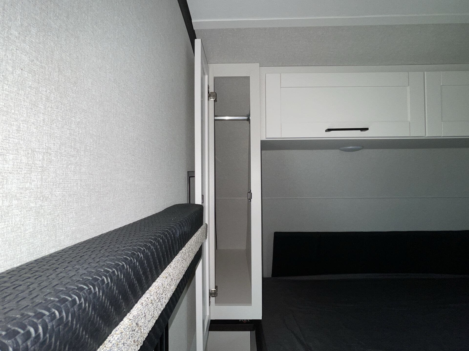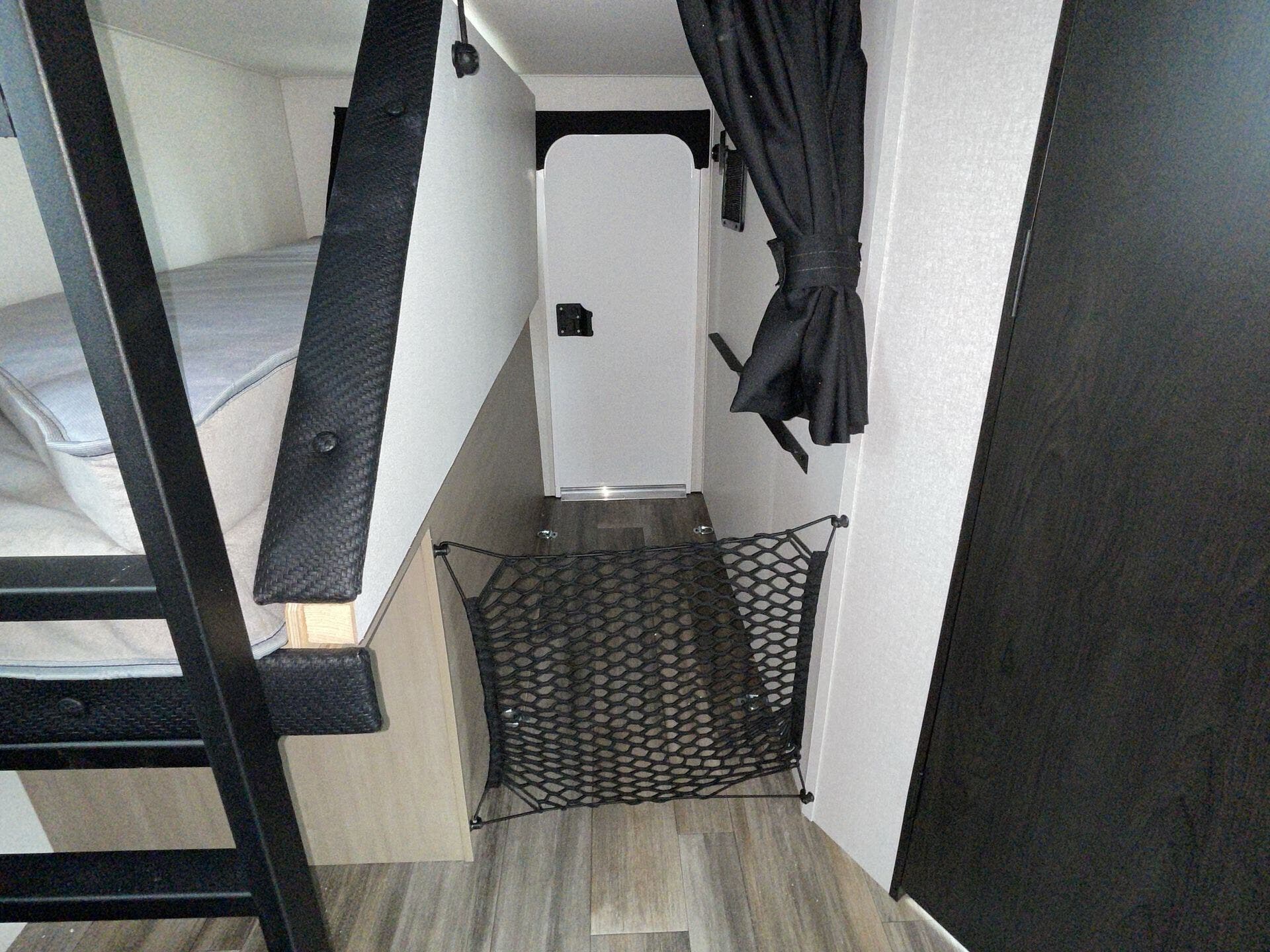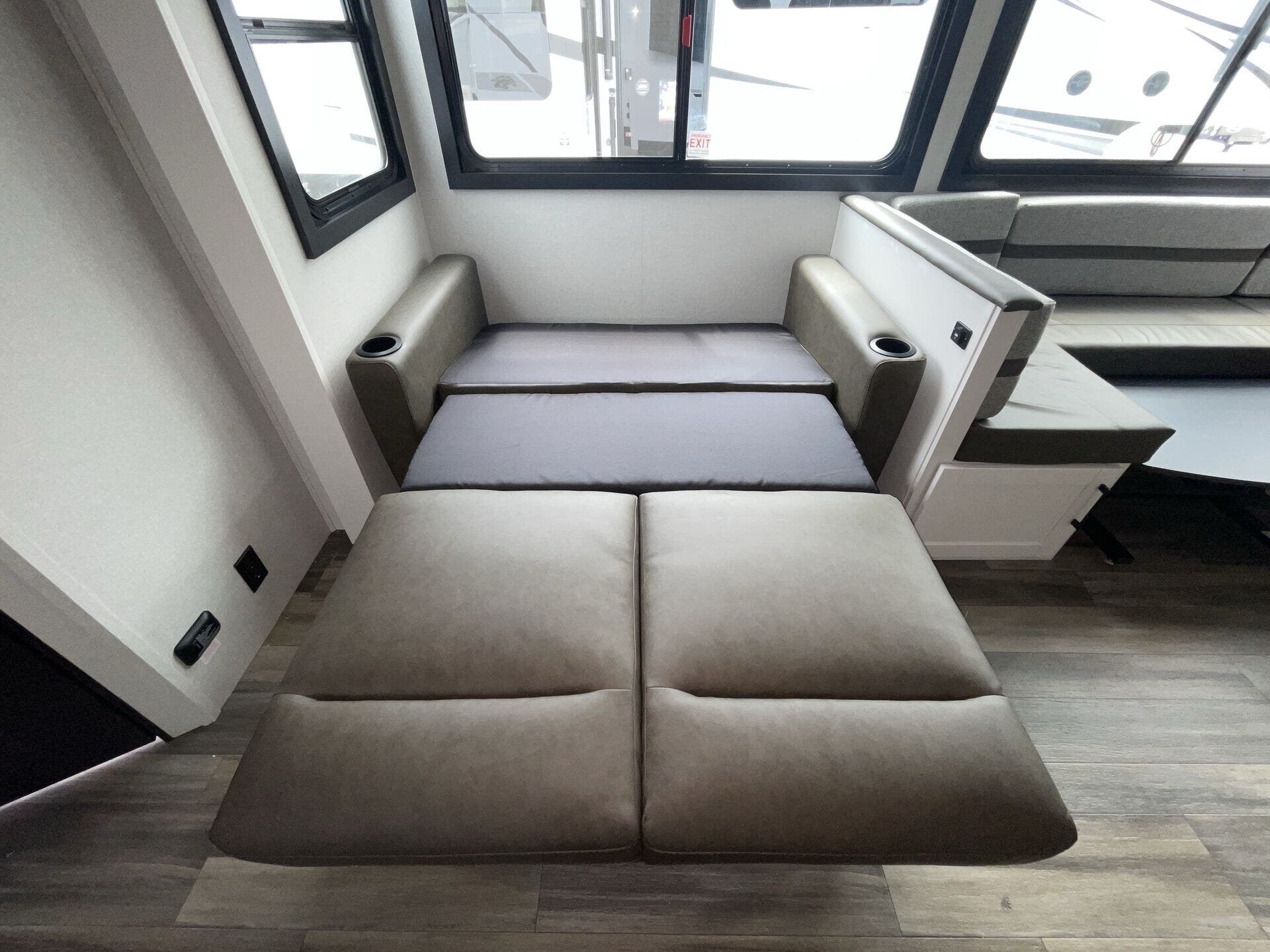 Inside, the layout is optimized for both comfort and functionality. The rear double-over-double bunks offer a dedicated space for kids or guests, while the private front bedroom provides a quiet retreat. The slide-out opens up the main living area, creating a roomy space for relaxing, dining, or entertaining.
