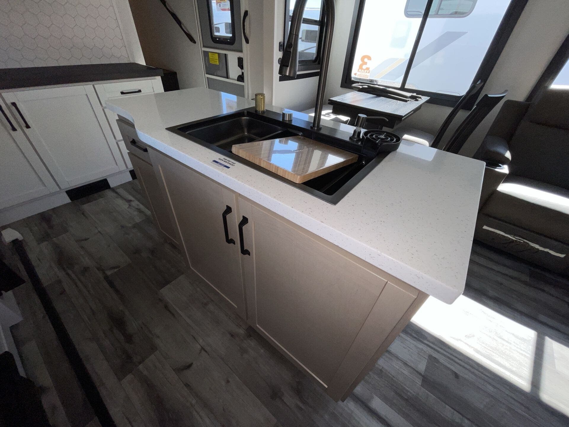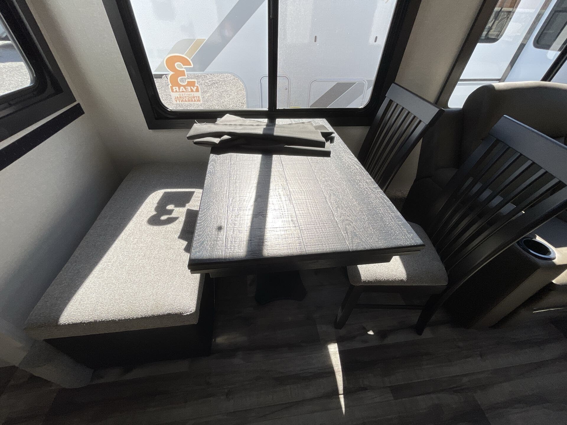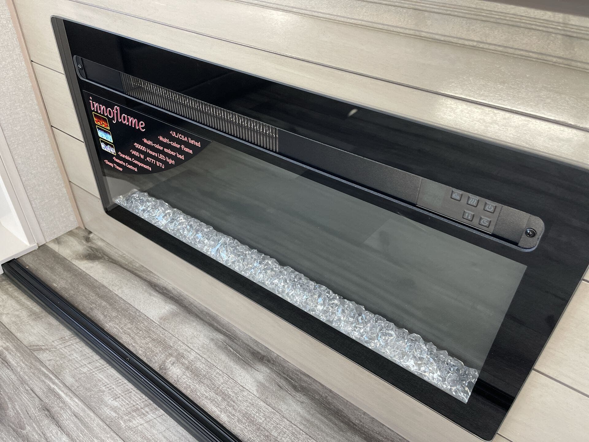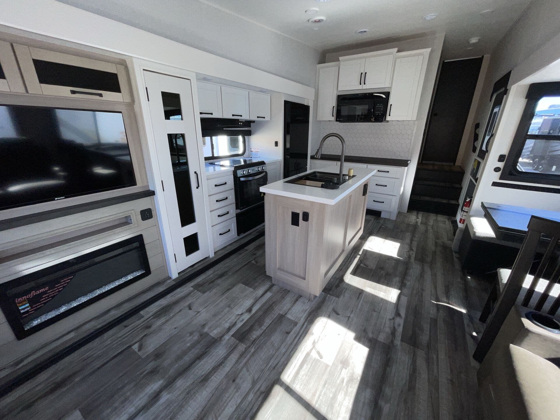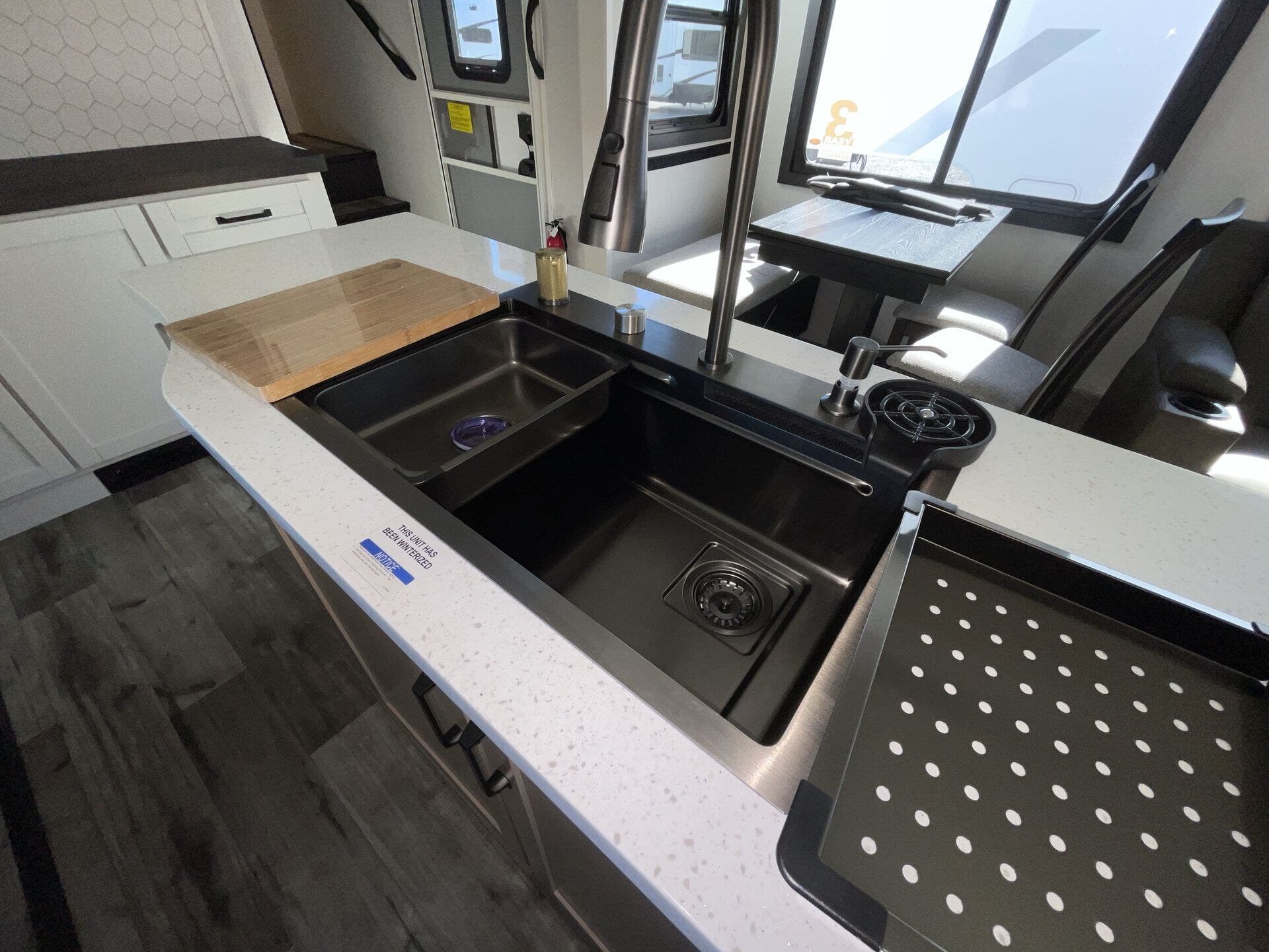 Step inside, and you’ll be greeted by a bright, open living area with opposing slides that create a true residential feel. The rear lounge features plush theater seating and a tri-fold sofa facing a large entertainment center with a fireplace, ideal for relaxing after a day outdoors. The kitchen is equally impressive, offering solid-surface countertops, a deep stainless steel sink, a full suite of stainless appliances, and ample pantry space—making cooking on the road a delight. The freestanding dinette provides a cozy spot for meals or game nights with family and friends.
