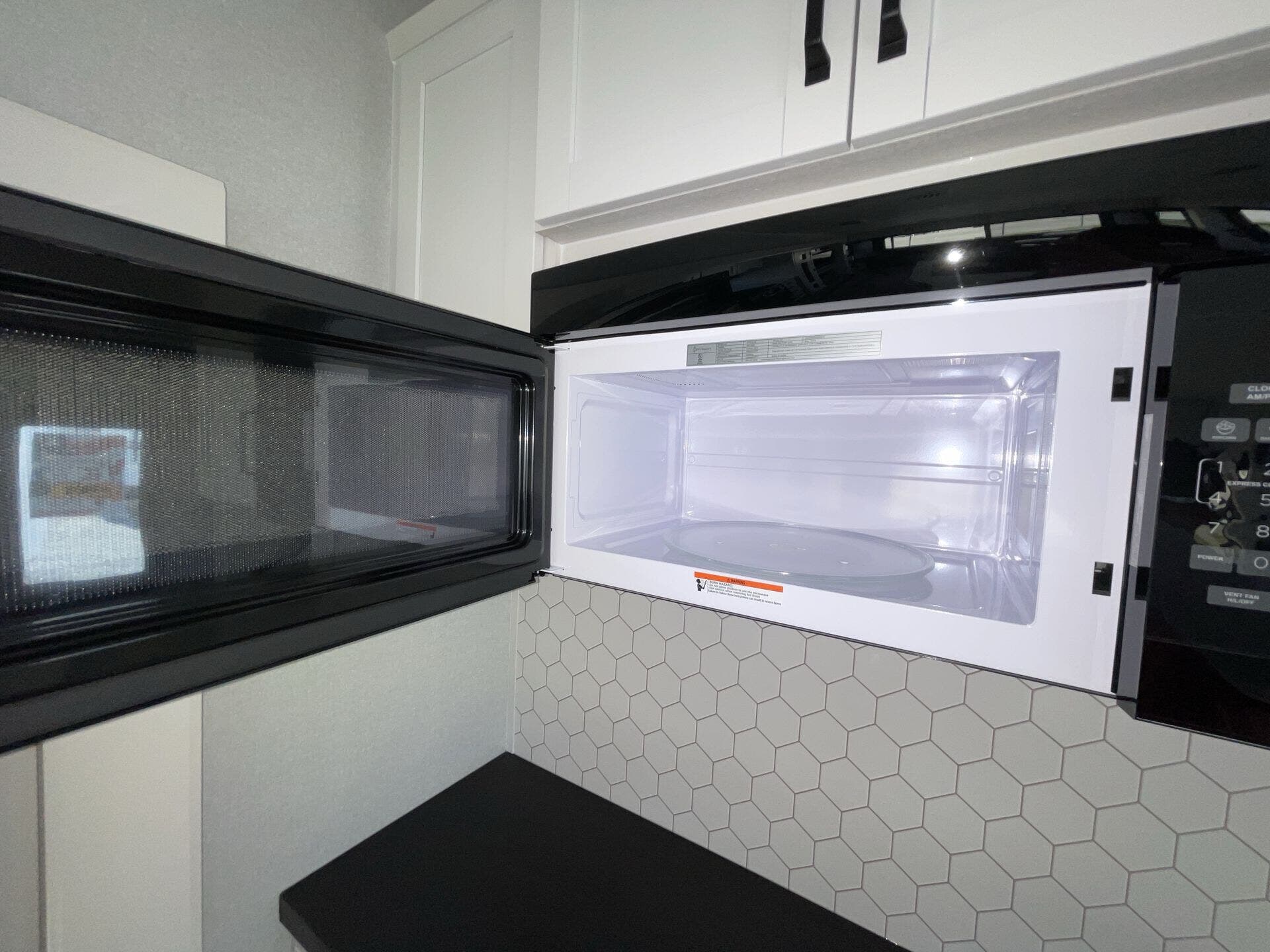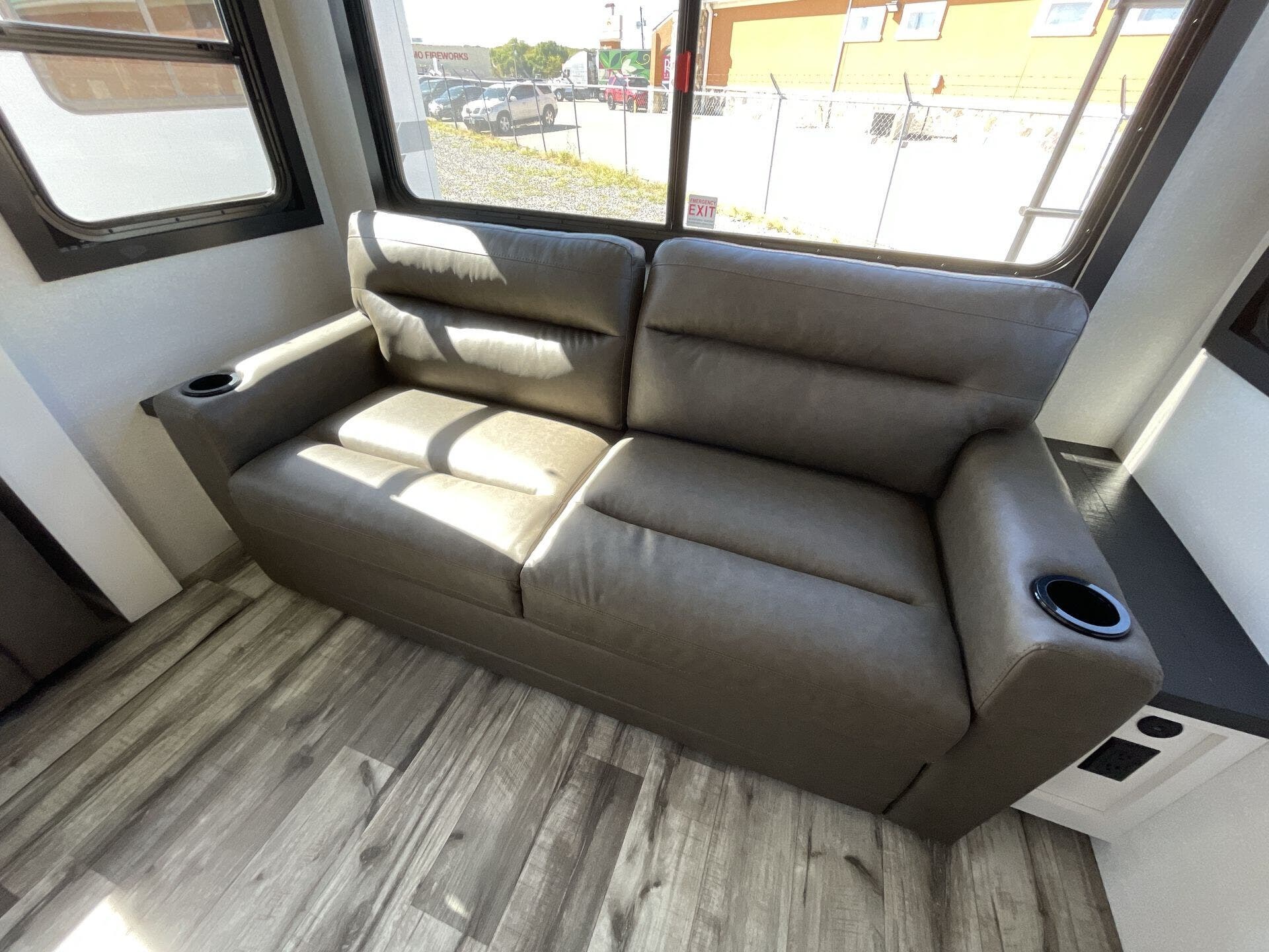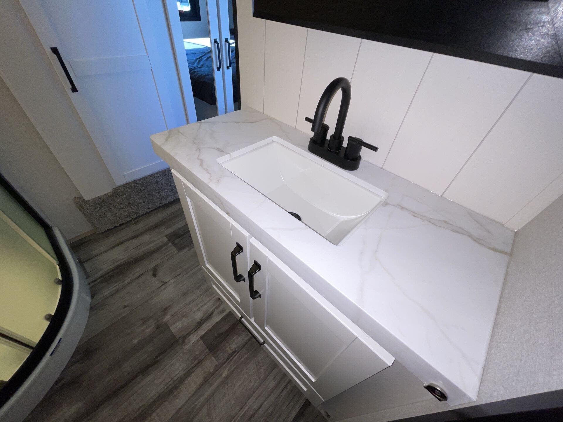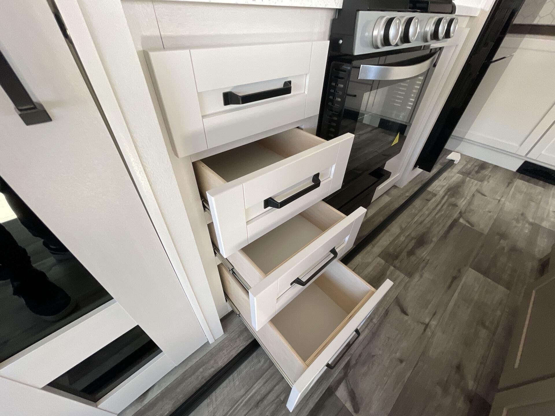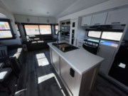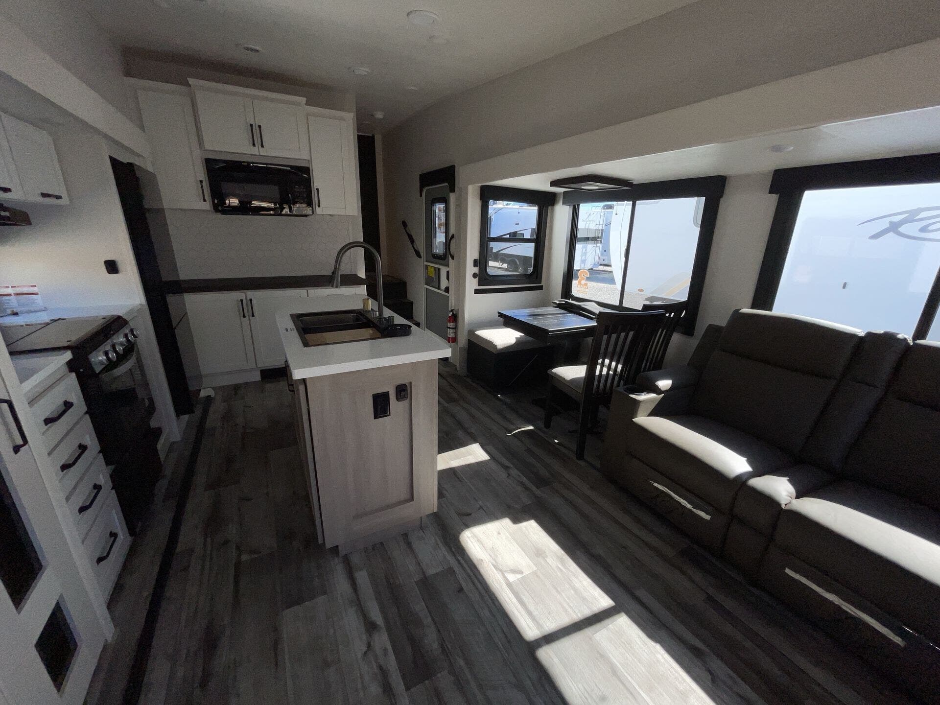 Step inside, and you’ll be greeted by a bright, open living area with opposing slides that create a true residential feel. The rear lounge features plush theater seating and a tri-fold sofa facing a large entertainment center with a fireplace, ideal for relaxing after a day outdoors. The kitchen is equally impressive, offering solid-surface countertops, a deep stainless steel sink, a full suite of stainless appliances, and ample pantry space—making cooking on the road a delight. The freestanding dinette provides a cozy spot for meals or game nights with family and friends.