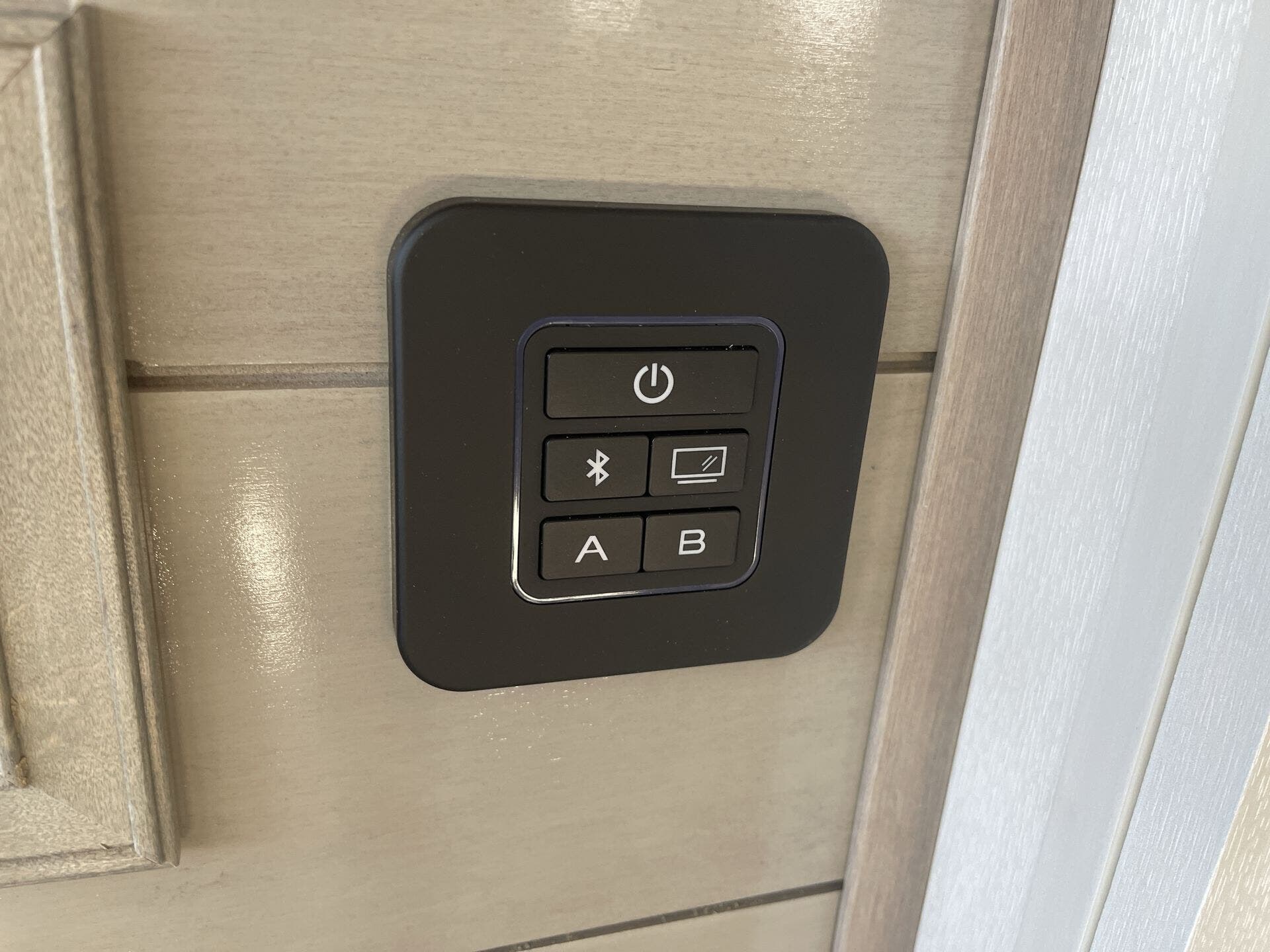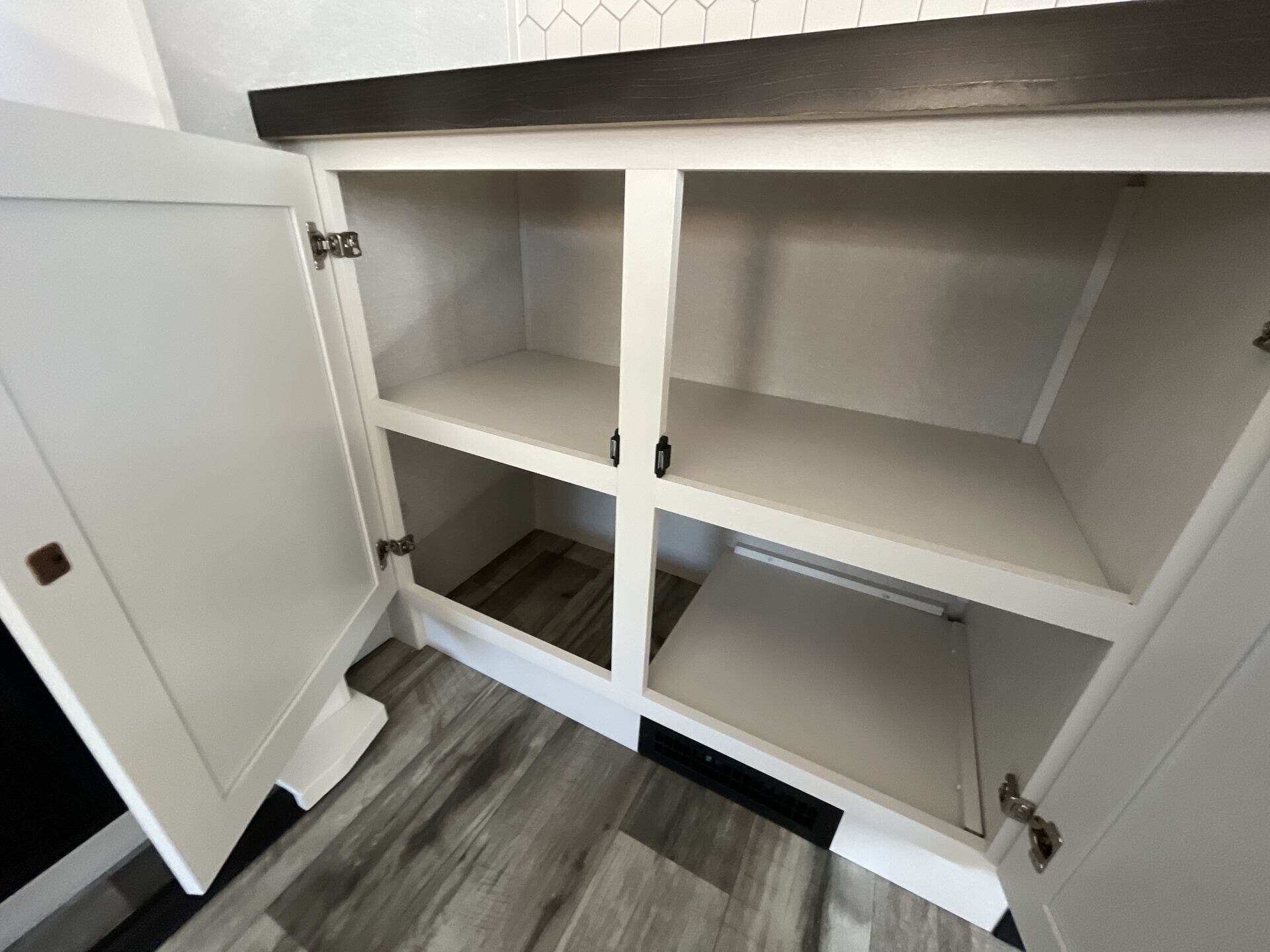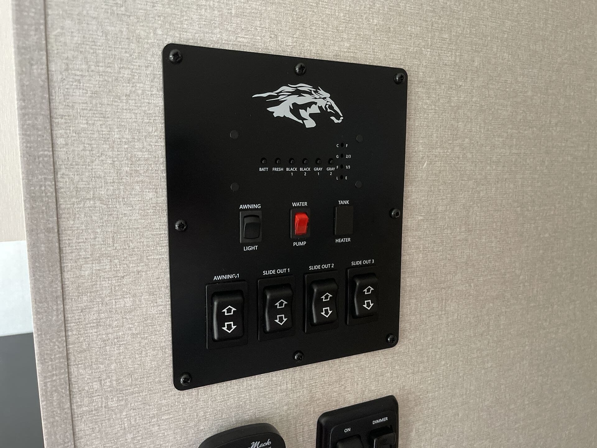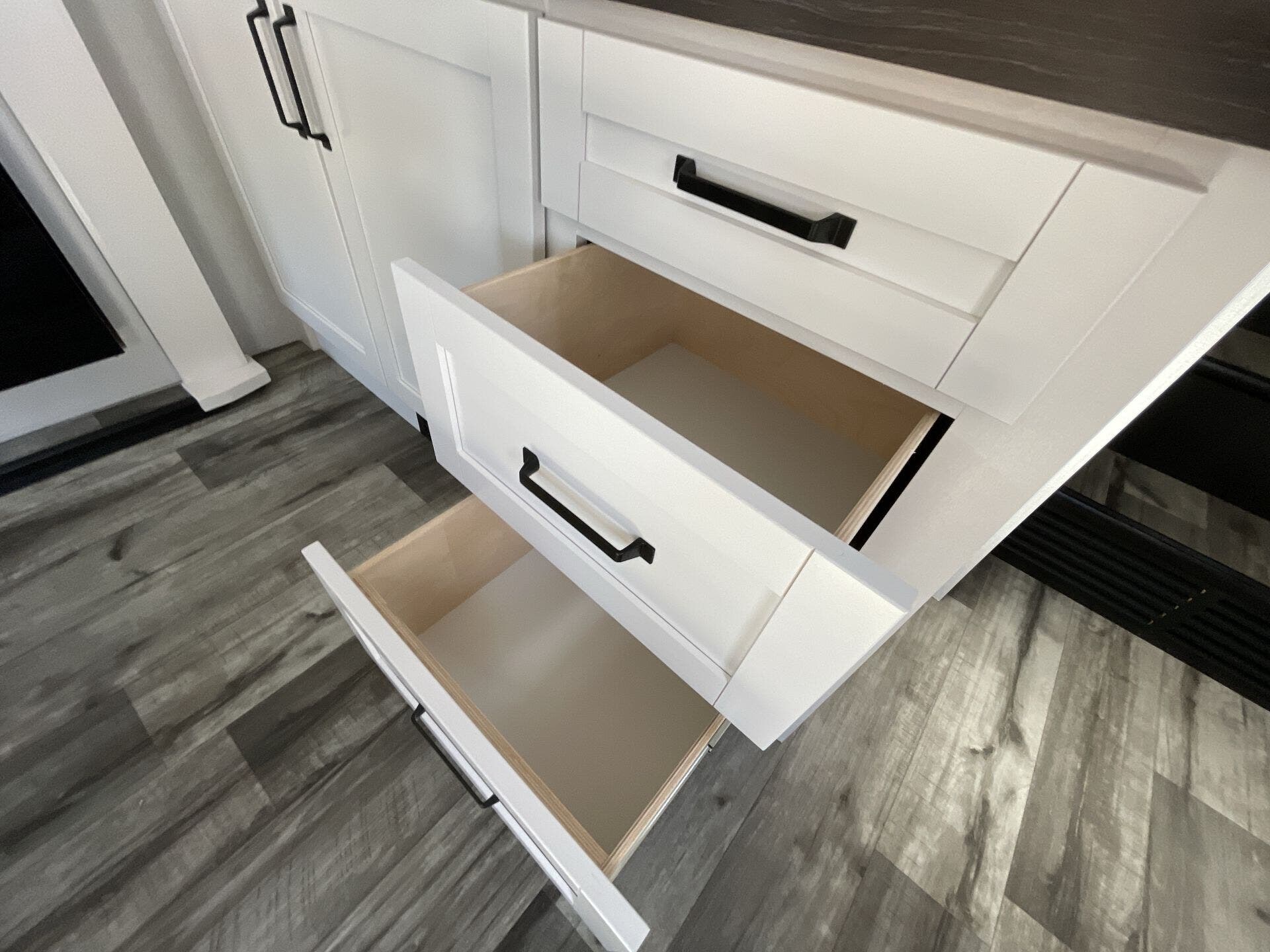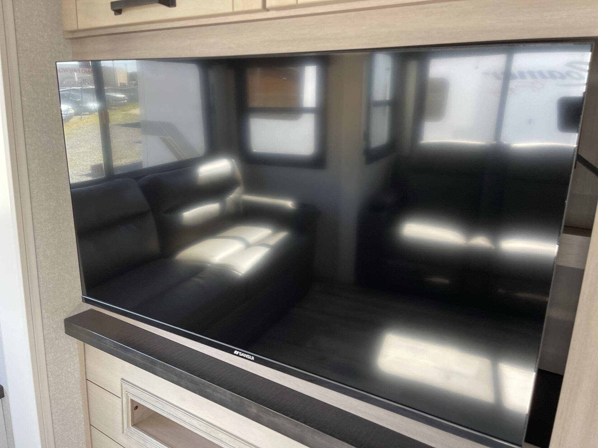 Step inside, and you’ll be greeted by a bright, open living area with opposing slides that create a true residential feel. The rear lounge features plush theater seating and a tri-fold sofa facing a large entertainment center with a fireplace, ideal for relaxing after a day outdoors. The kitchen is equally impressive, offering solid-surface countertops, a deep stainless steel sink, a full suite of stainless appliances, and ample pantry space—making cooking on the road a delight. The freestanding dinette provides a cozy spot for meals or game nights with family and friends.