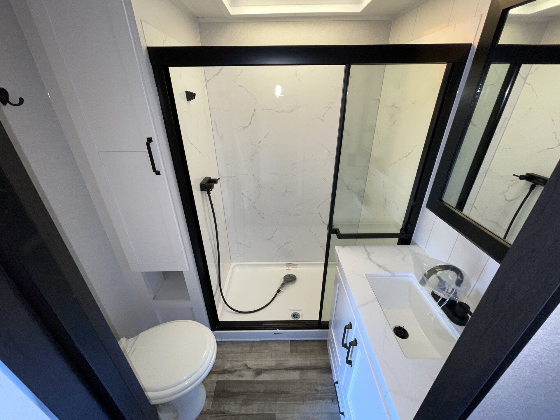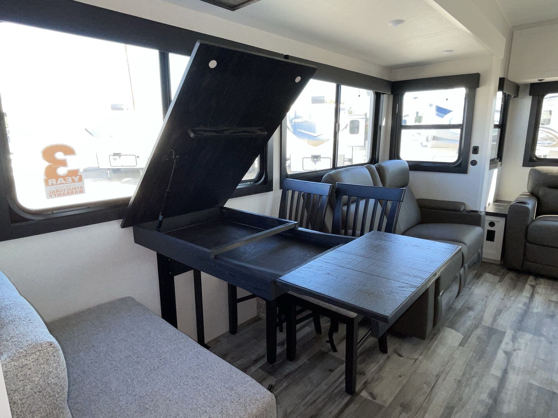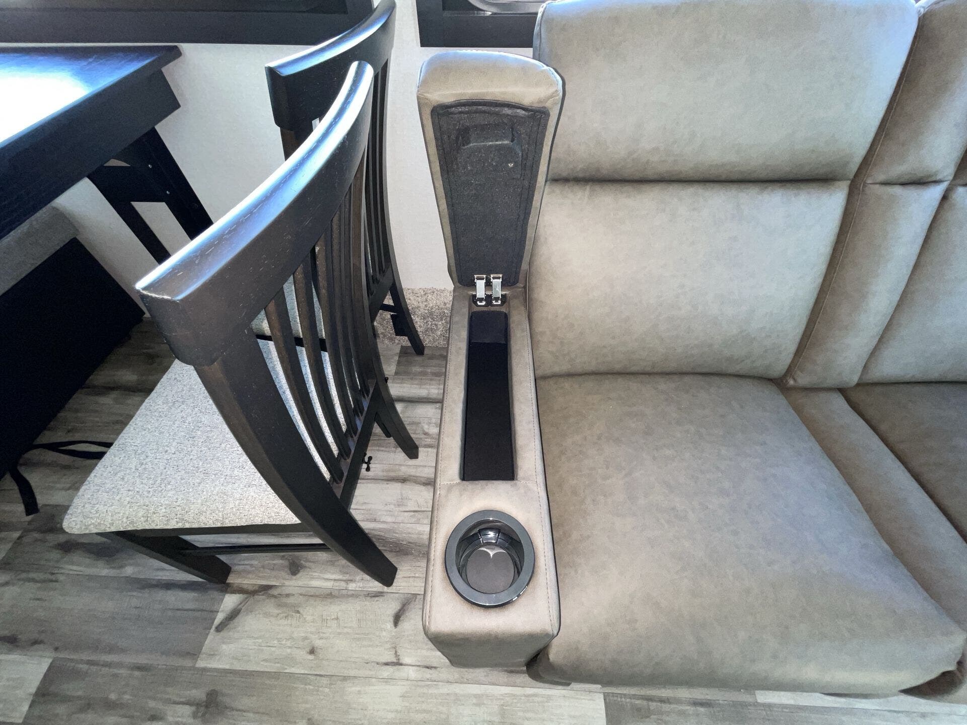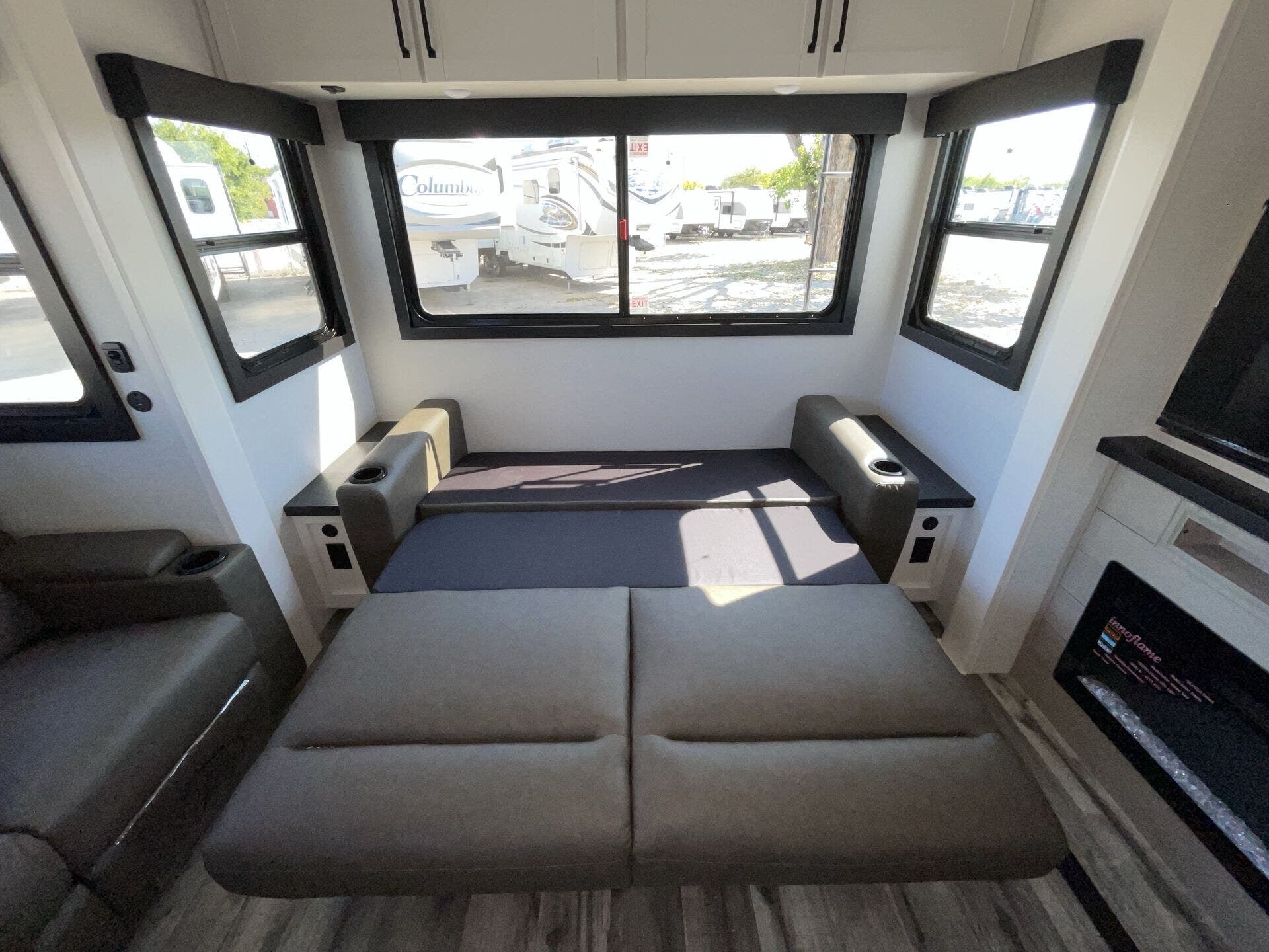 Fireplace, Free Standing Dinette w/Chairs, Island Kitchen, Kitchen Sink, Medicine Cabinet, Overhead Cabinetry, Pantry, Queen Bed, Roof Vents, Shower, Sofa Bed, Theater Seating, Toilet, Wardrobe(s)