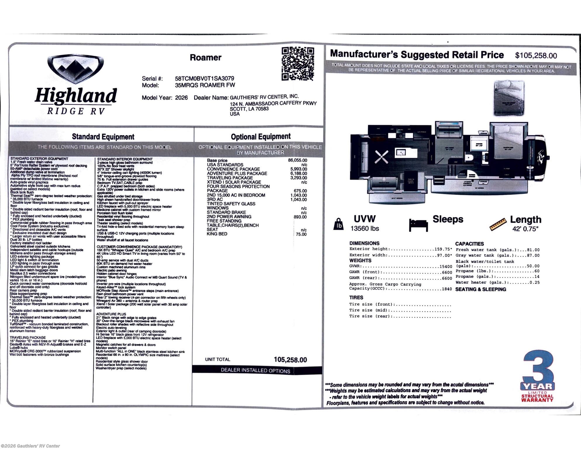 - Year: 2026 • Brand: Highland Ridge • Model: Roamer • Type: Fifth Wheel