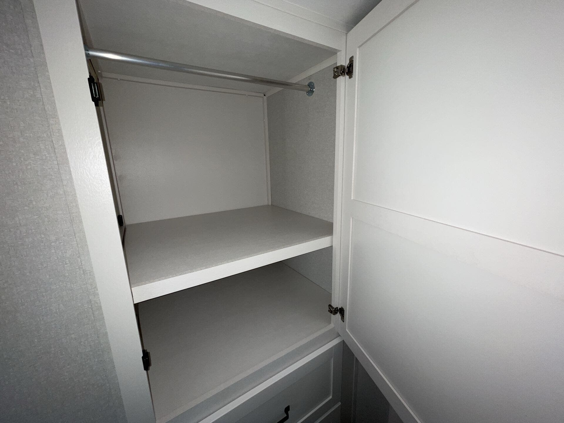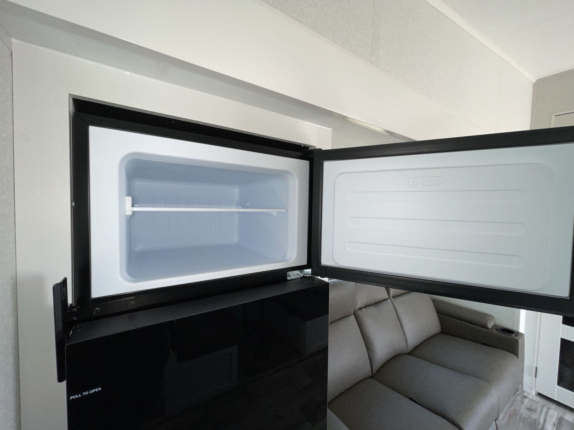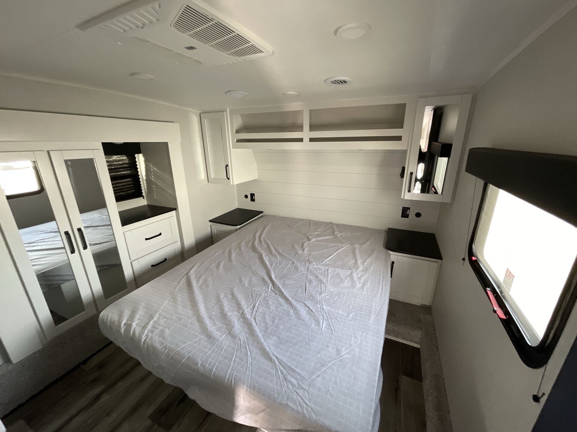 The Open Range Roamer is equipped to stay comfortable during extended trips. Inside, you’ll find essential appliances such as a furnace, microwave, oven, refrigerator, stove, and a dedicated stove top burner, ensuring full functionality for daily cooking and heating needs. The generous living area, coupled with two slide-outs, creates an open, inviting space to relax after a day on the road. A cozy queen bed in the front bedroom ensures restful nights, while a practical mid bath keeps morning routines smooth and private.