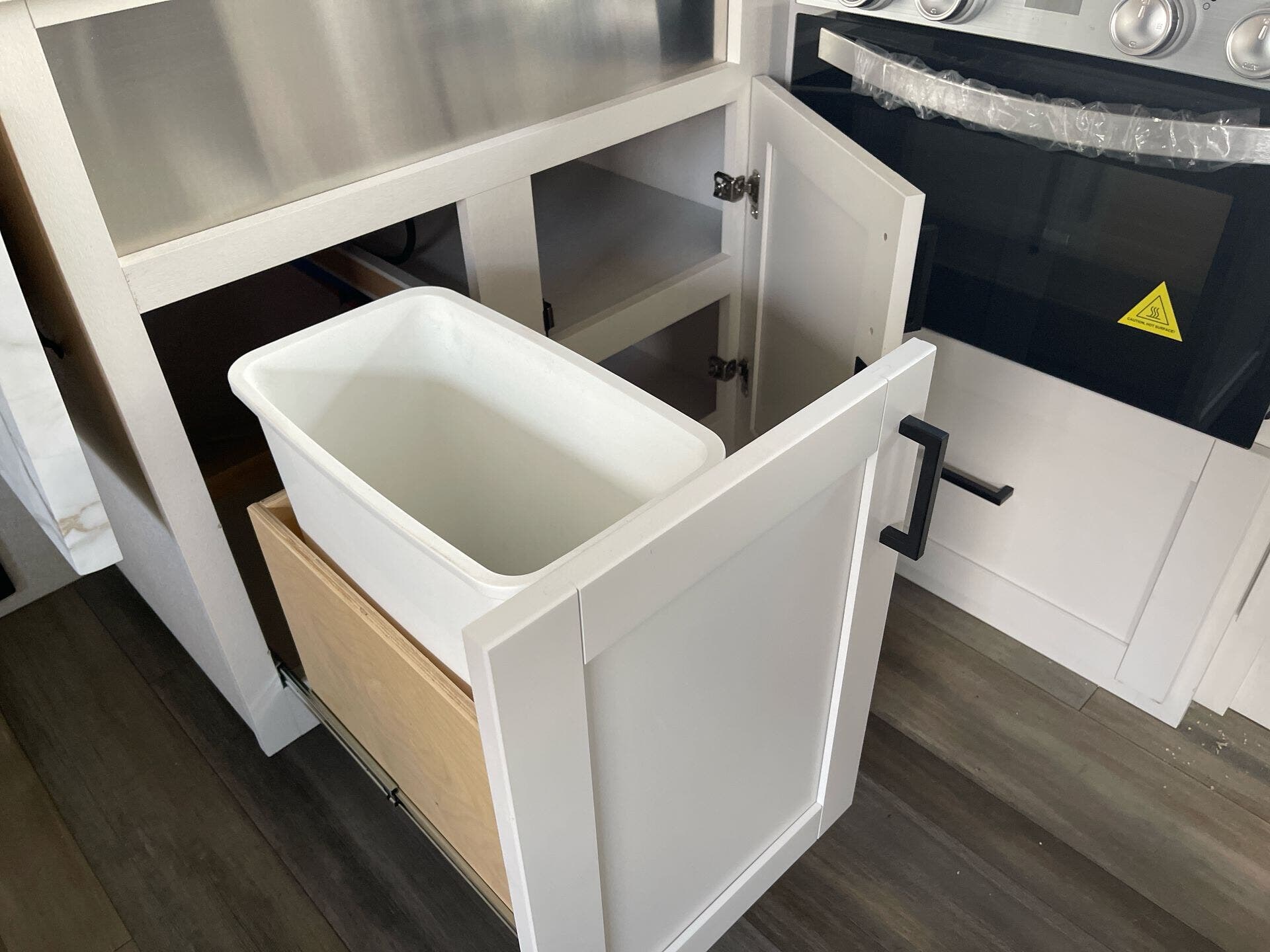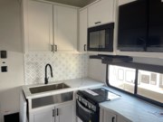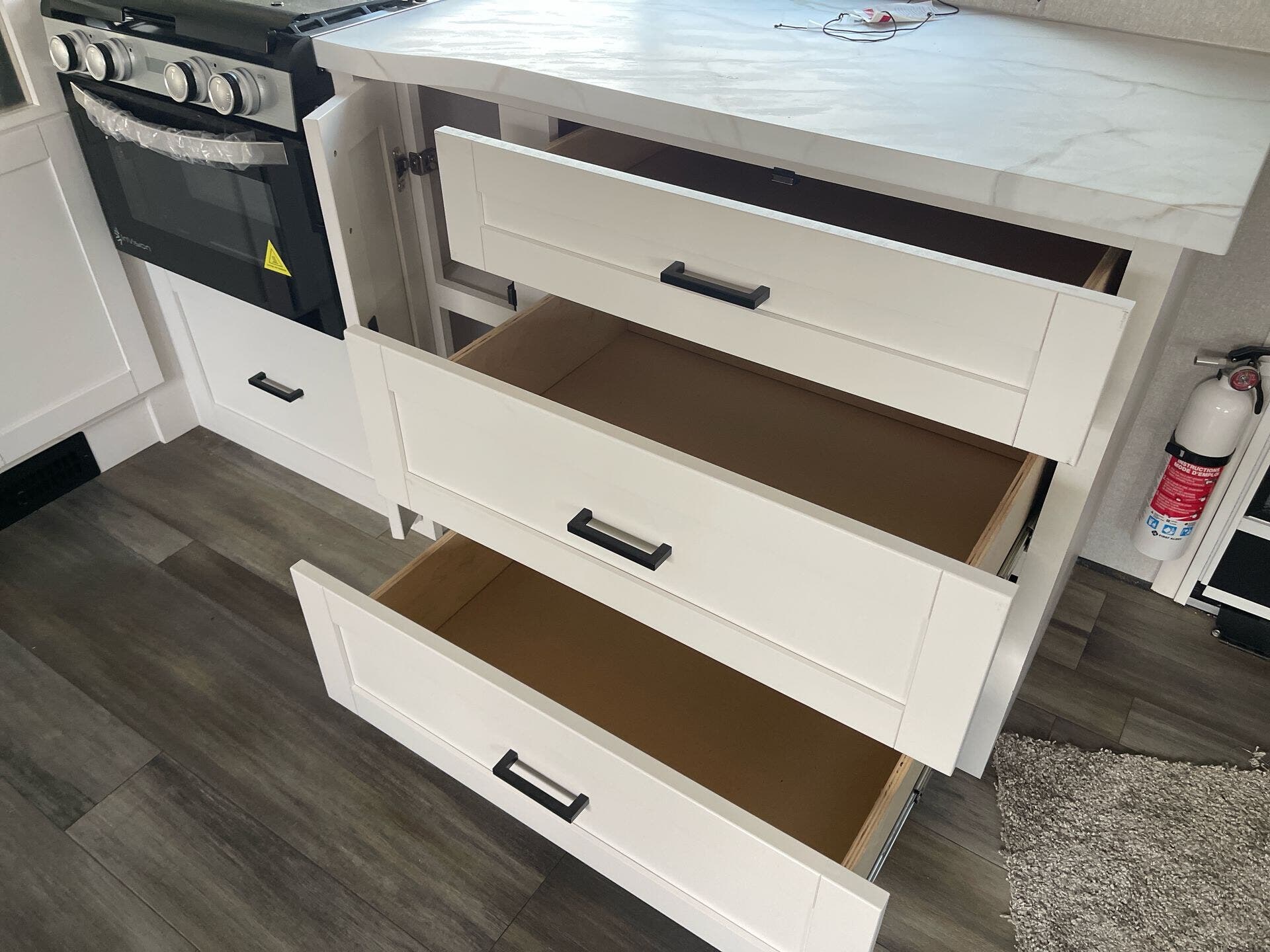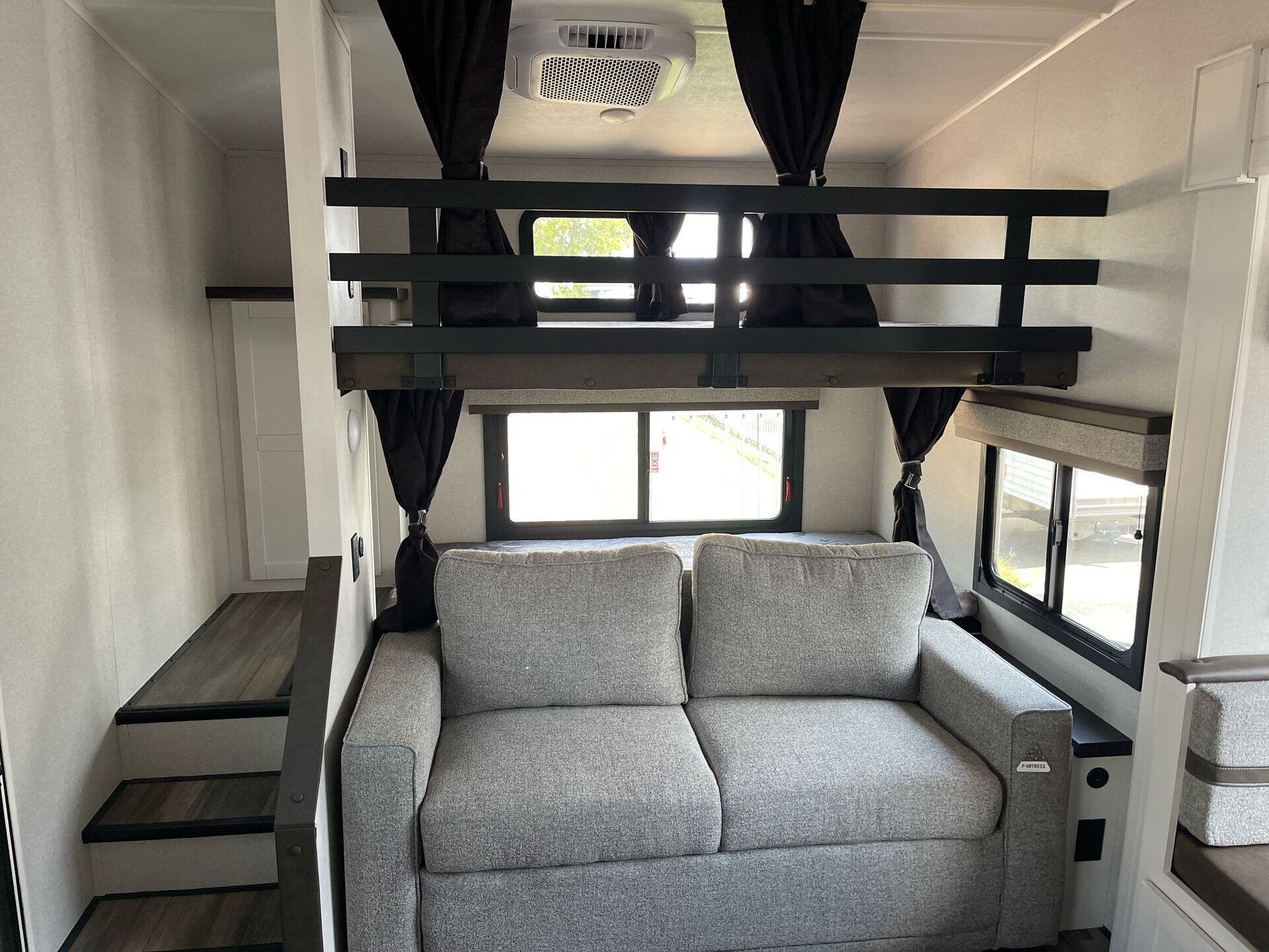 Inside, the rear bunkhouse boasts twin bunk beds with under-storage and nearby entertainment—ideal for kids or overflow guests. Forward, the main living area expands via a single ACCU-SLIDE™ living slide featuring a power theatre seat, tri-fold sofa, and free-standing dinette. Across, a full kitchen impresses with solid-surface countertops, a three-burner cooktop with oven, microwave, 10 cu ft refrigerator, and ample pantry space.