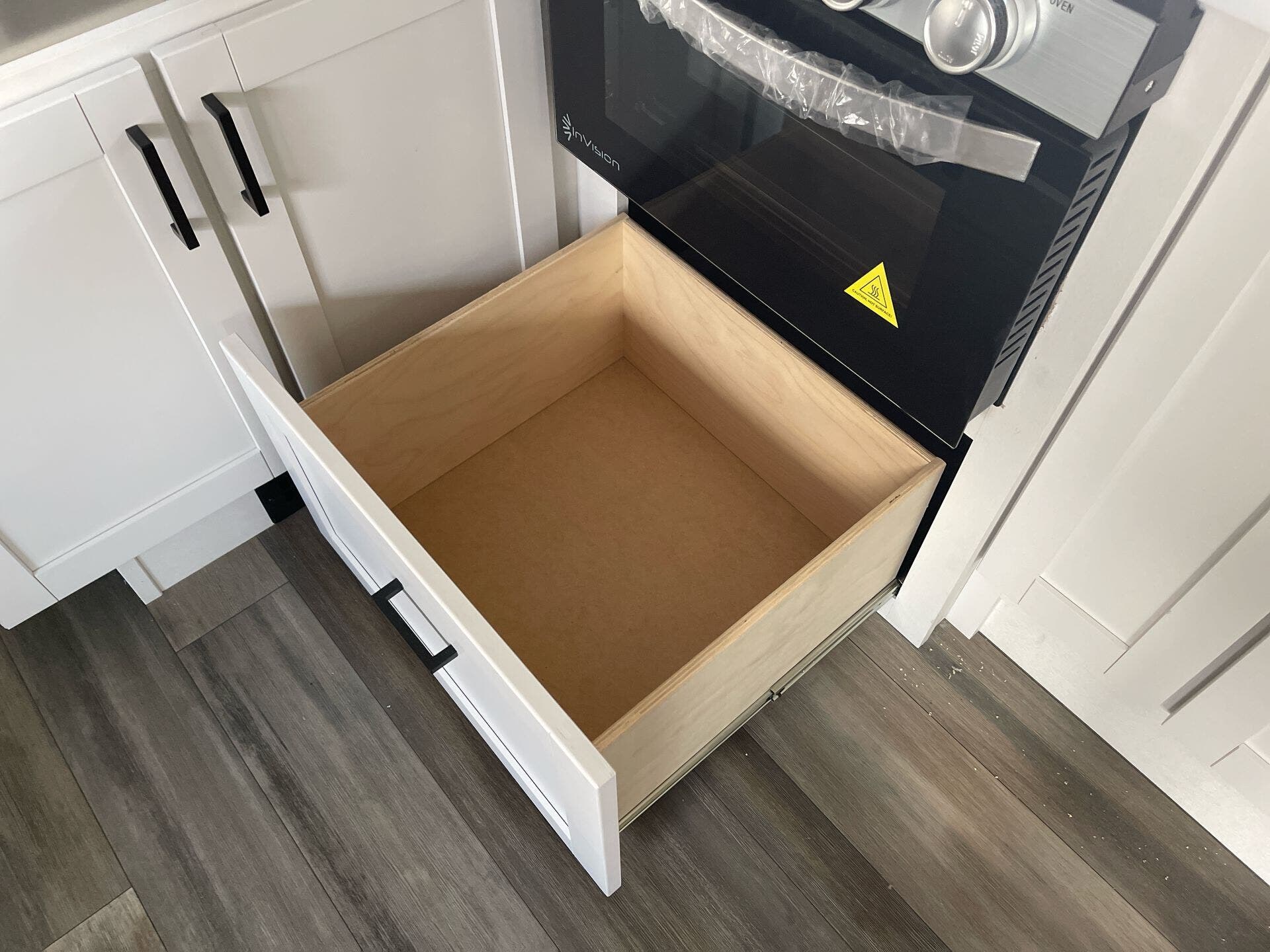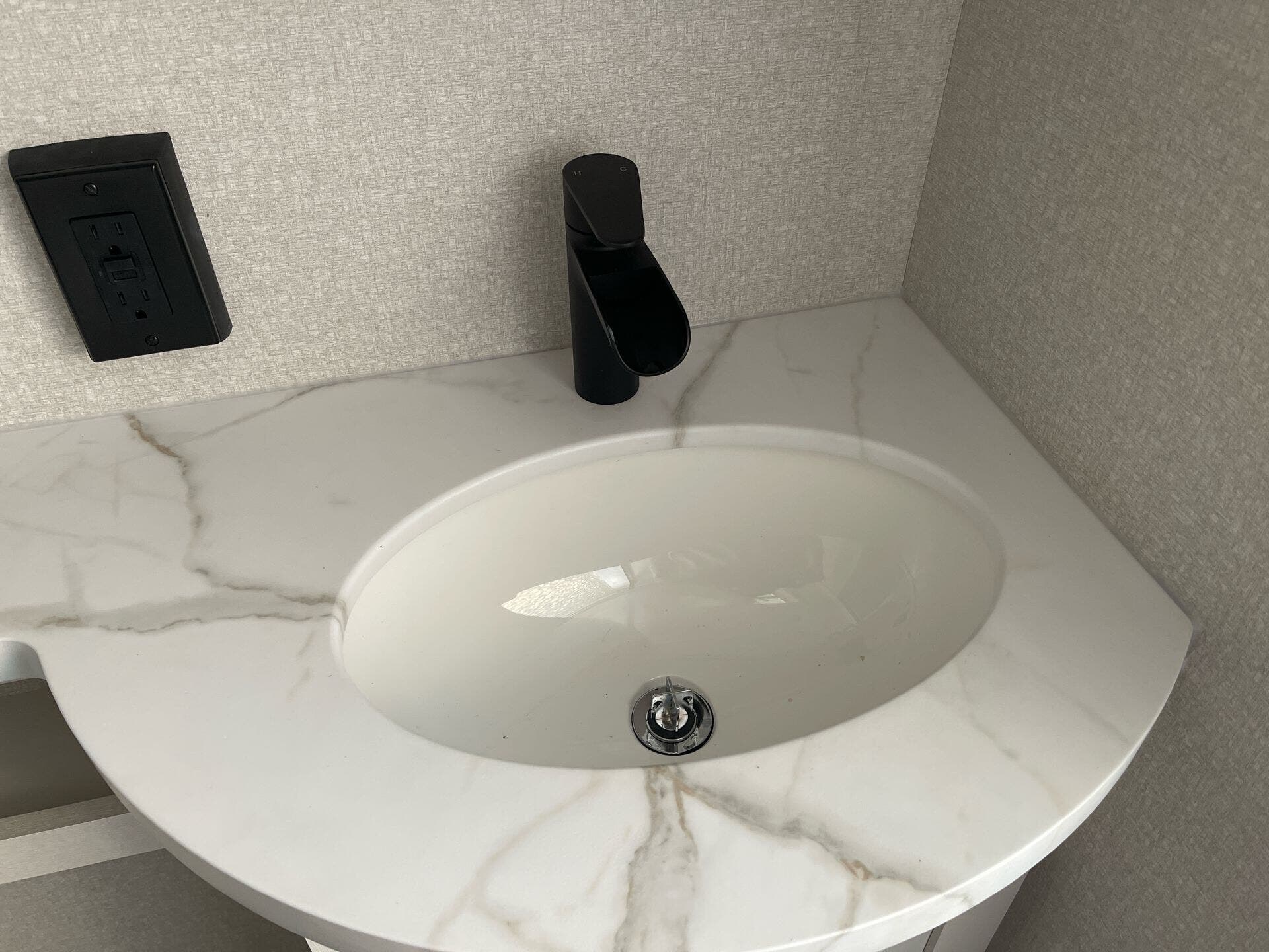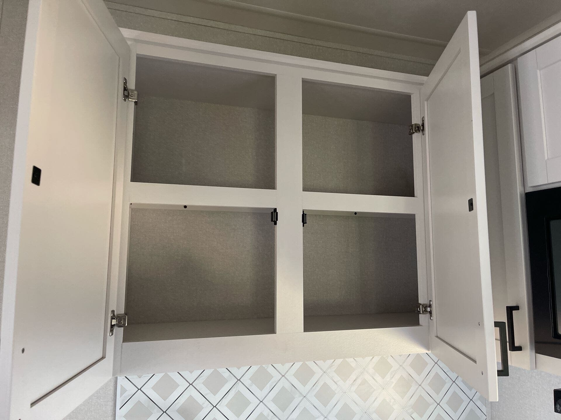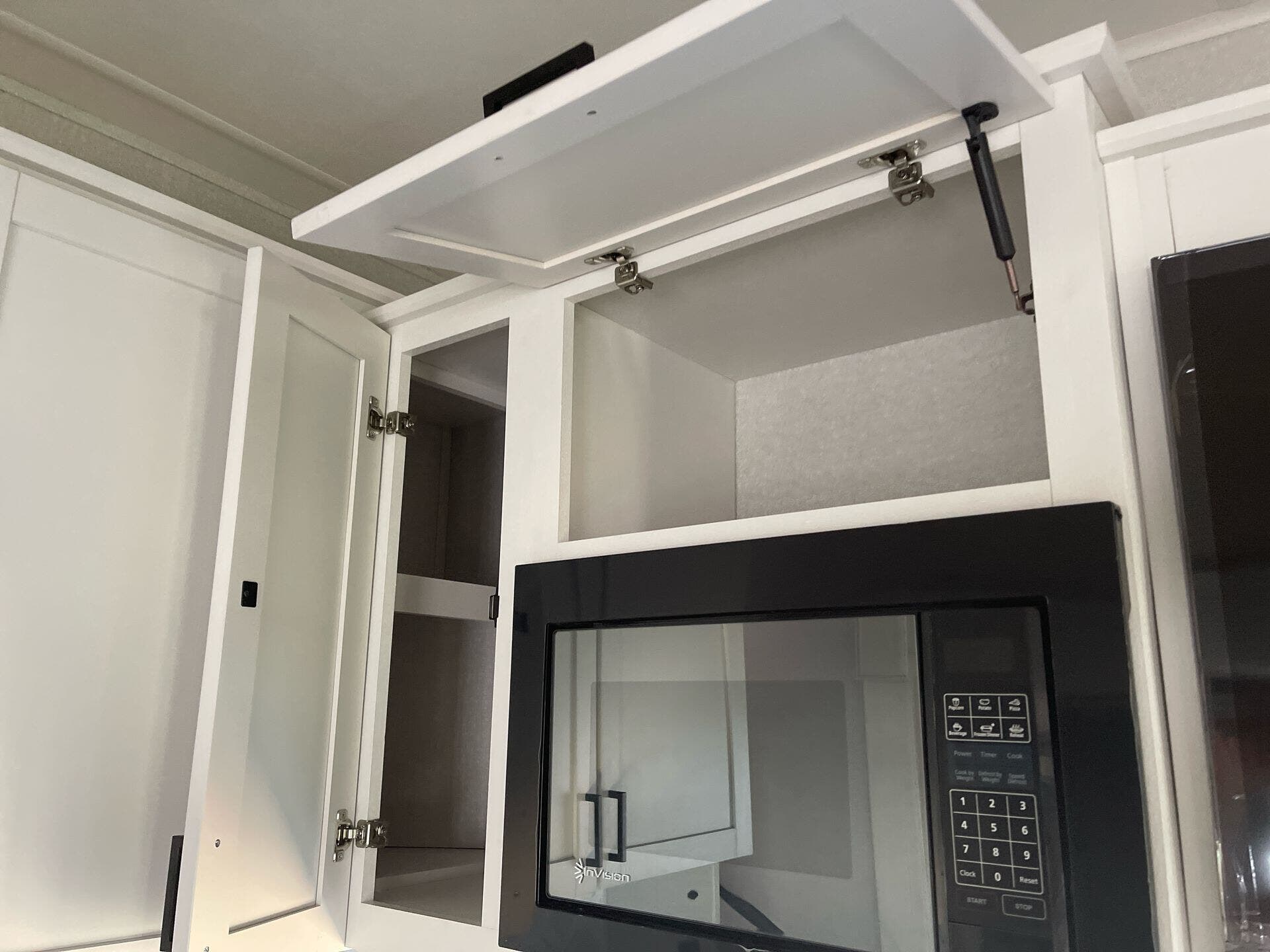 Inside, the rear bunkhouse boasts twin bunk beds with under-storage and nearby entertainment—ideal for kids or overflow guests. Forward, the main living area expands via a single ACCU-SLIDE™ living slide featuring a power theatre seat, tri-fold sofa, and free-standing dinette. Across, a full kitchen impresses with solid-surface countertops, a three-burner cooktop with oven, microwave, 10 cu ft refrigerator, and ample pantry space.
