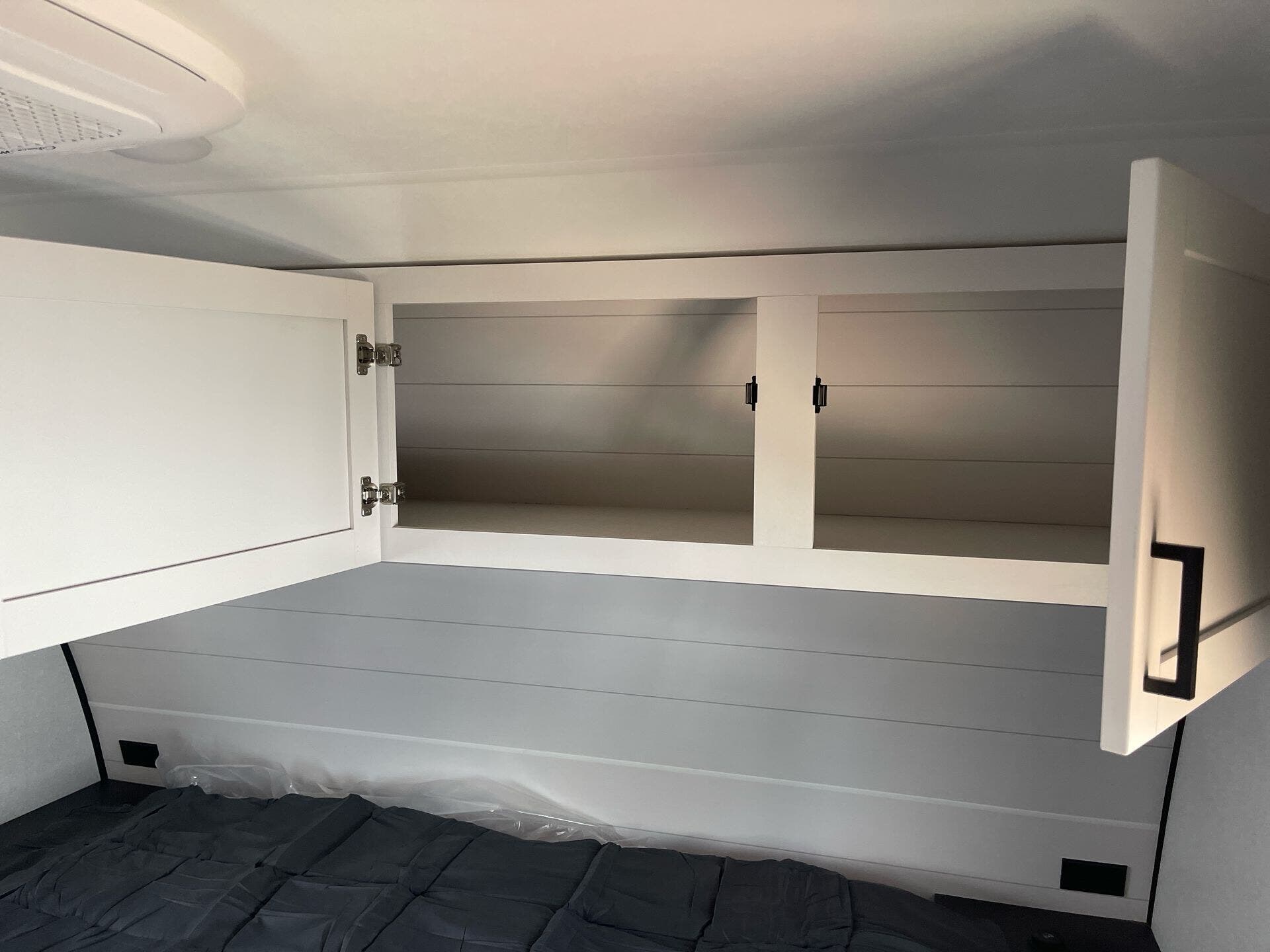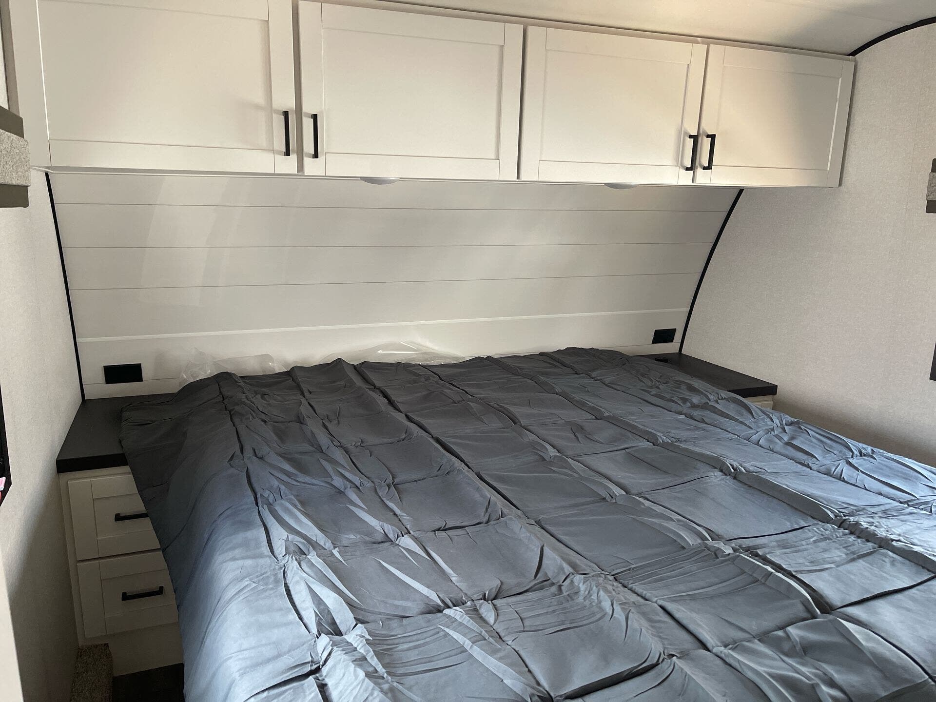 The front owner’s retreat includes a quiet private bedroom with queen bed, wardrobe storage, and direct bathroom access. A well-appointed bathroom with shower completes the interior flow.