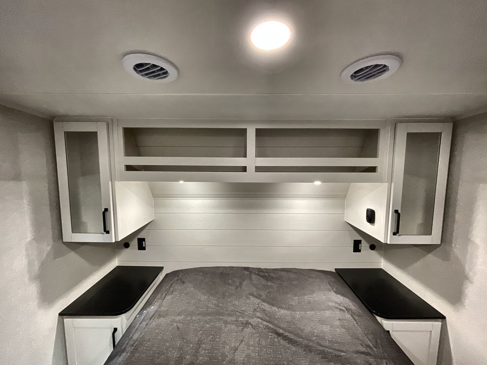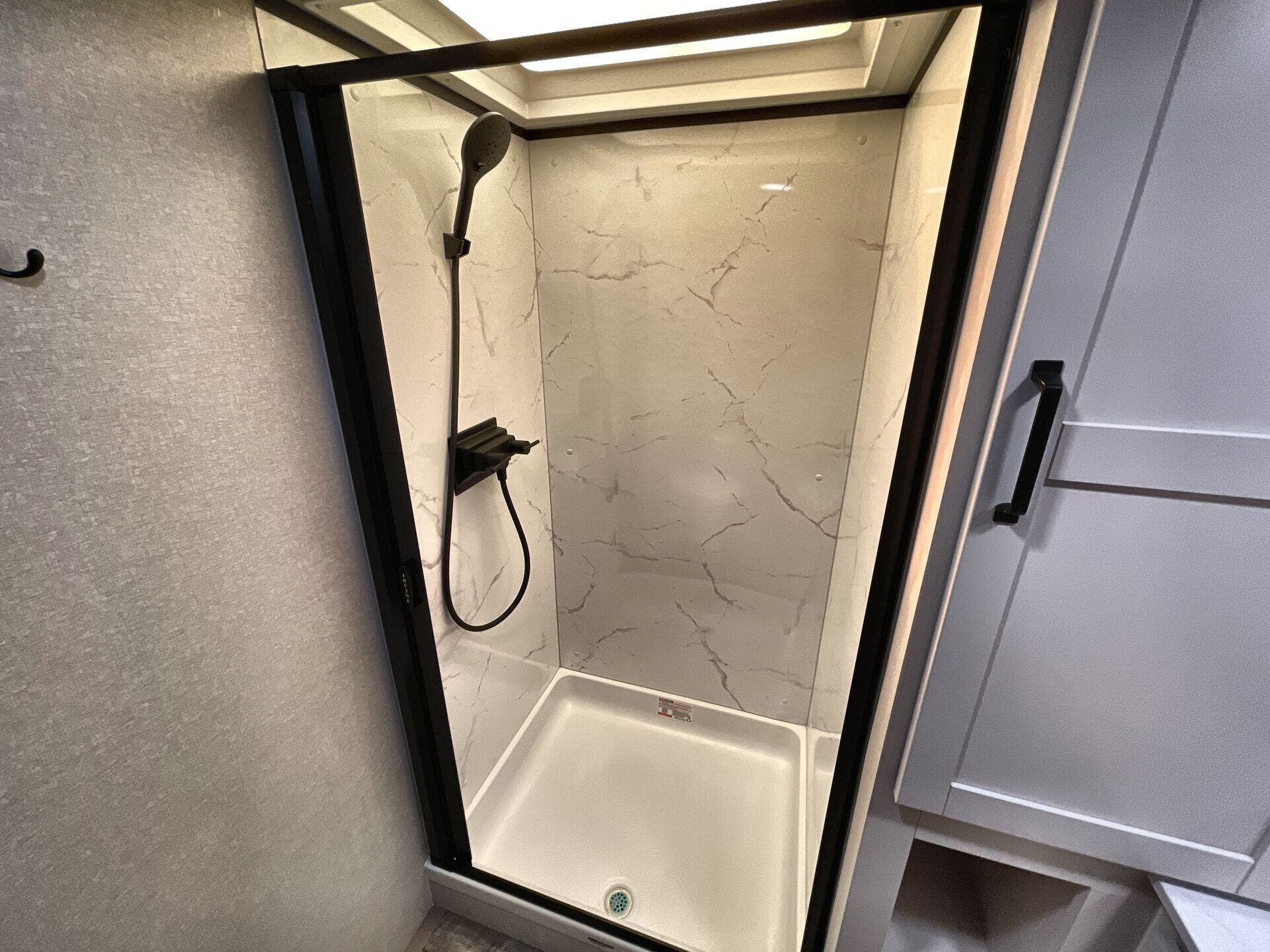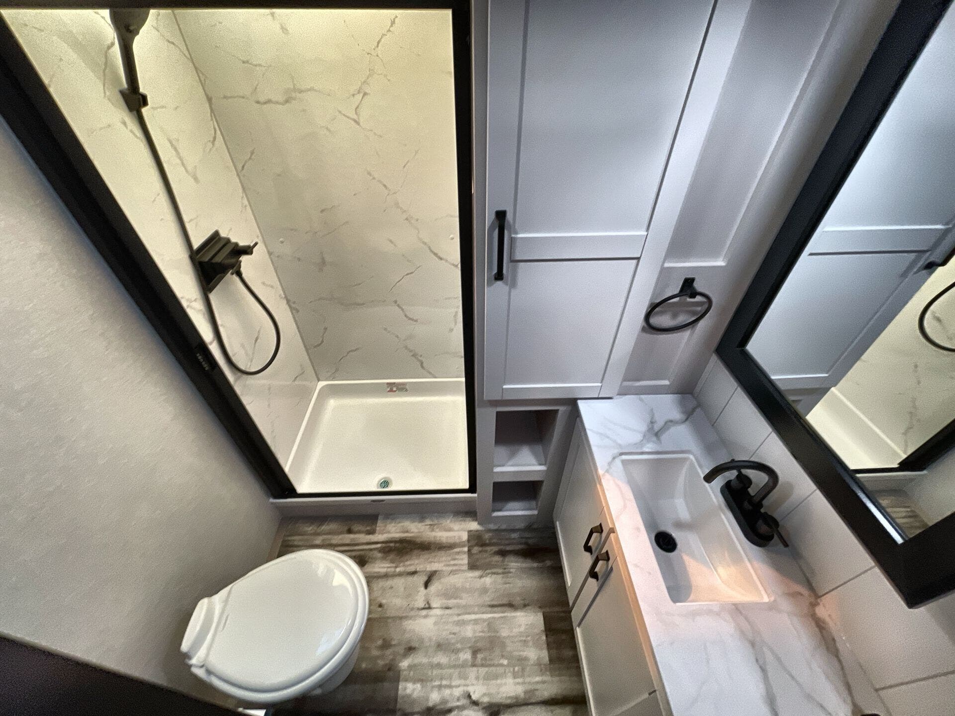 - Overhead Cabinetry, Kitchen Sink, Shower, and Toilet for everyday convenience