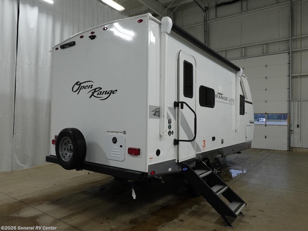 2026 Highland Open Range Lite 212FB highlights: Queen Bed Sofa Rear Bath At the front of the trailer, you’ll find a private queen bedroom featuring a residential 60" x 80" queen bed, overhead cabinetry, and dual wardrobe closets, providing excellent storage and a comfortable retreat at the end of the day. The main living area is open and inviting, highlighted by a full-length sofa positioned beneath a large window, creating a bright and comfortable space to relax, watch TV, or entertain guests. Across from the sofa is the entertainment center, perfectly placed for easy viewing. The kitchen is centrally located and efficiently designed, featuring a refrigerator, microwave, cooktop, pantry, and overhead cabinetry. This layout provides everything you need to prepare meals while keeping the living area open and uncluttered. At the rear of the trailer, the full bathroom includes a corner shower, toilet, sink with medicine cabinet, and linen storage, offering convenience and privacy. Additional highlights include ample interior storage, exterior storage compartments, and a 12-foot power awning, making outdoor relaxation just as enjoyable as the interior living space. With its open floorplan, comfortable seating, and lightweight construction, the Range Lite 212FB is an excellent choice for campers looking for a well-balanced travel trailer that’s easy to tow and packed with everyday comforts.