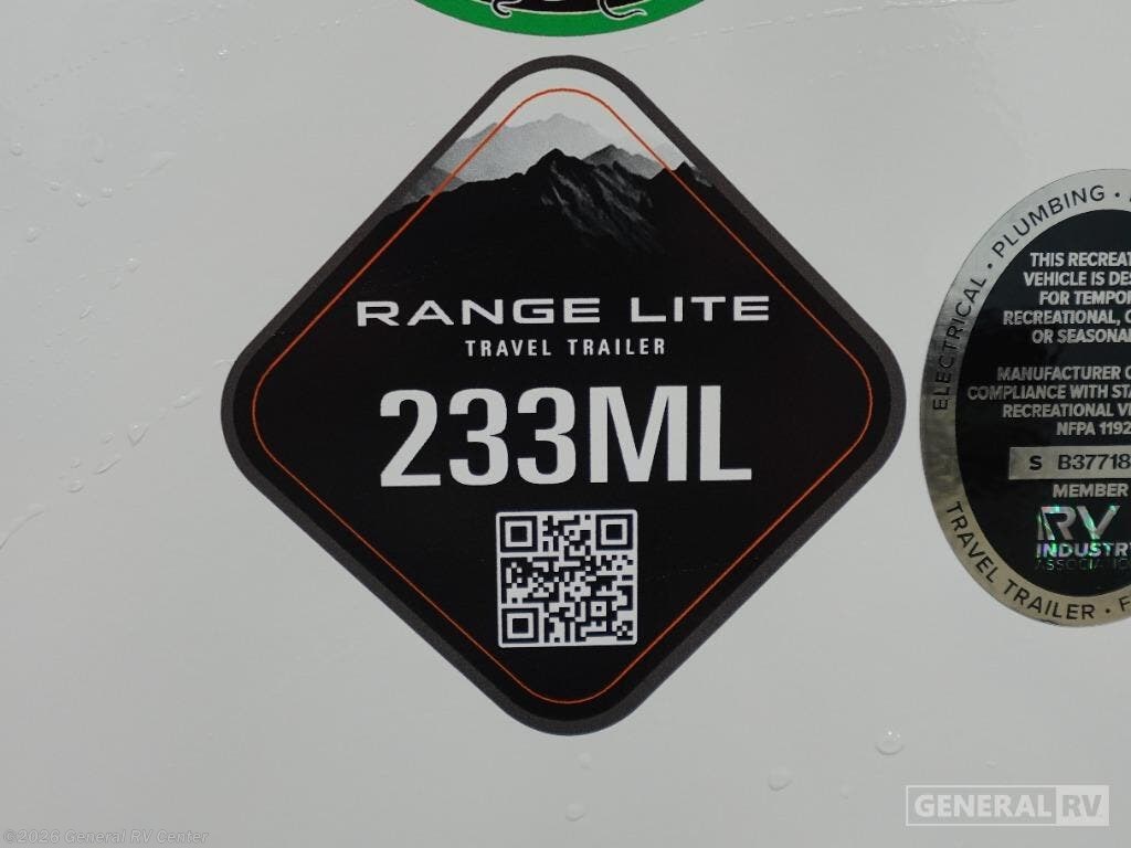 **Highland Ride RV Range Lite travel trailer 233ML highlights:** * Rear Kitchen * Front Bedroom * Dual Entry Doors * Outside Storage * Docking Station It is easy to enter and exit this travel trailer with the dual entry doors! One of the entrances leads directly into the front private bedroom which has a queen bed with wardrobes on either side, and the other entrance leads into the rear kitchen where you can prepare your best home cooked meals. Enjoy your meals at the booth dinette then play a card game or relax on the tri-fold sofa. Rinse the sand out of your hair with the shower in the full bathroom and keep your towel close by with the linen closet. Enjoy your beautiful scenery rain or shine as you relax in a chair underneath the 21' power awning! Each one of these Highland Ridge RV Range Lite travel trailers maximize their interior space while staying lightweight thanks to the TuffShell fiberglass walls! The residential floor slides create more interior space, and the residential vinyl flooring throughout makes them kid and pet friendly. A few construction features you will appreciate include a fully-walkable roof, a thermal seal which means the underbelly is enclosed, heated, and insulated, and a fully insulated roof with a PVC roofing membrane. Plus, there is an exterior grill hookup quick connect port, self-adjusting electric brakes to help you safely arrive, and an oversized pass-through storage area with motion lighting. Each model also includes the Xtend Solar I Package with a 200 watt solar panel with a 30 amp solar controller so boondocking is easier than ever.