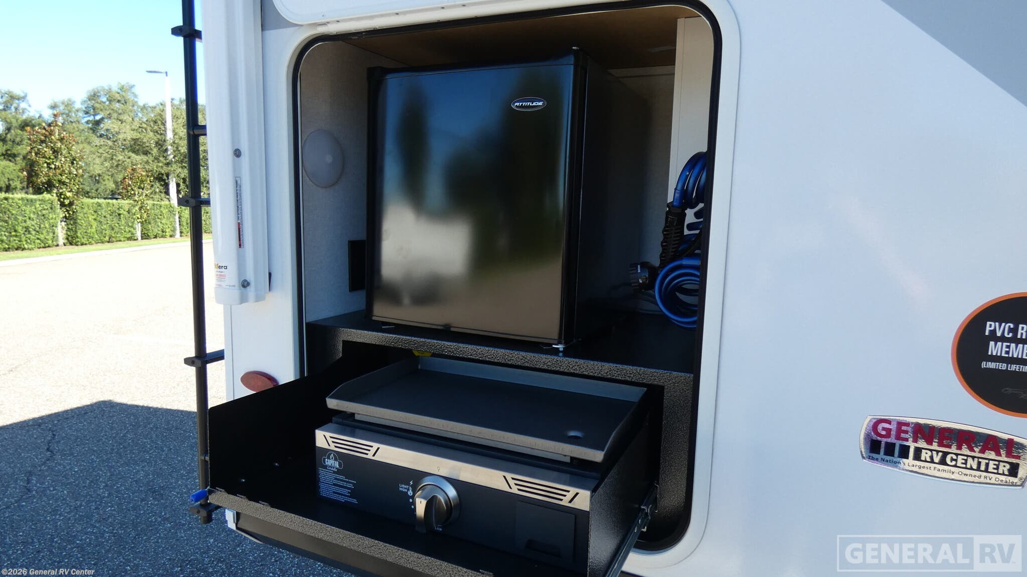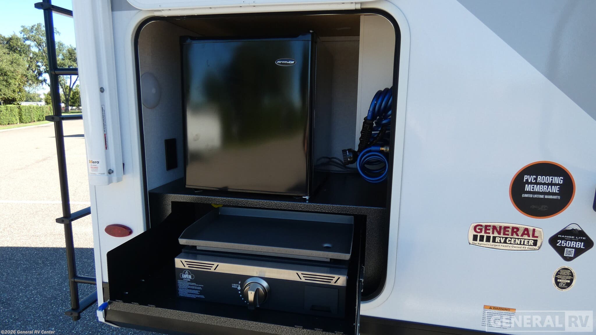 Embrace the open road with the 2026 Highland Ridge Range Lite 250RBL, a perfect blend of style and functionality. This RV is designed to comfortably accommodate up to six people, making it an ideal choice for family adventures or getaways with friends. At 30 feet in length, its spacious interior features a cozy queen bed flanked by convenient nightstands, ensuring restful nights after a day of exploration. The single slide-out expands your living space, revealing a welcoming area complete with a tri-fold sofa and a dinette, perfect for dining or relaxing by the entertainment center with a charming fireplace. The Range Lite 250RBL is equipped with a well-appointed kitchen, featuring a refrigerator and microwave, and an impressive walk-in pantry to store all your culinary essentials. For those who love outdoor cooking, the exterior kitchen with a pull-out griddle and fridge is a delightful addition, all under a large 19-foot awning that provides ample shade. The bathroom is thoughtfully designed with a 30” x 36” shower, ensuring comfort and convenience. Built on a robust American-made Norco Z-frame chassis, this RV promises durability and a smooth ride. Visit your nearest General RV dealership to discover more about this exceptional travel companion.