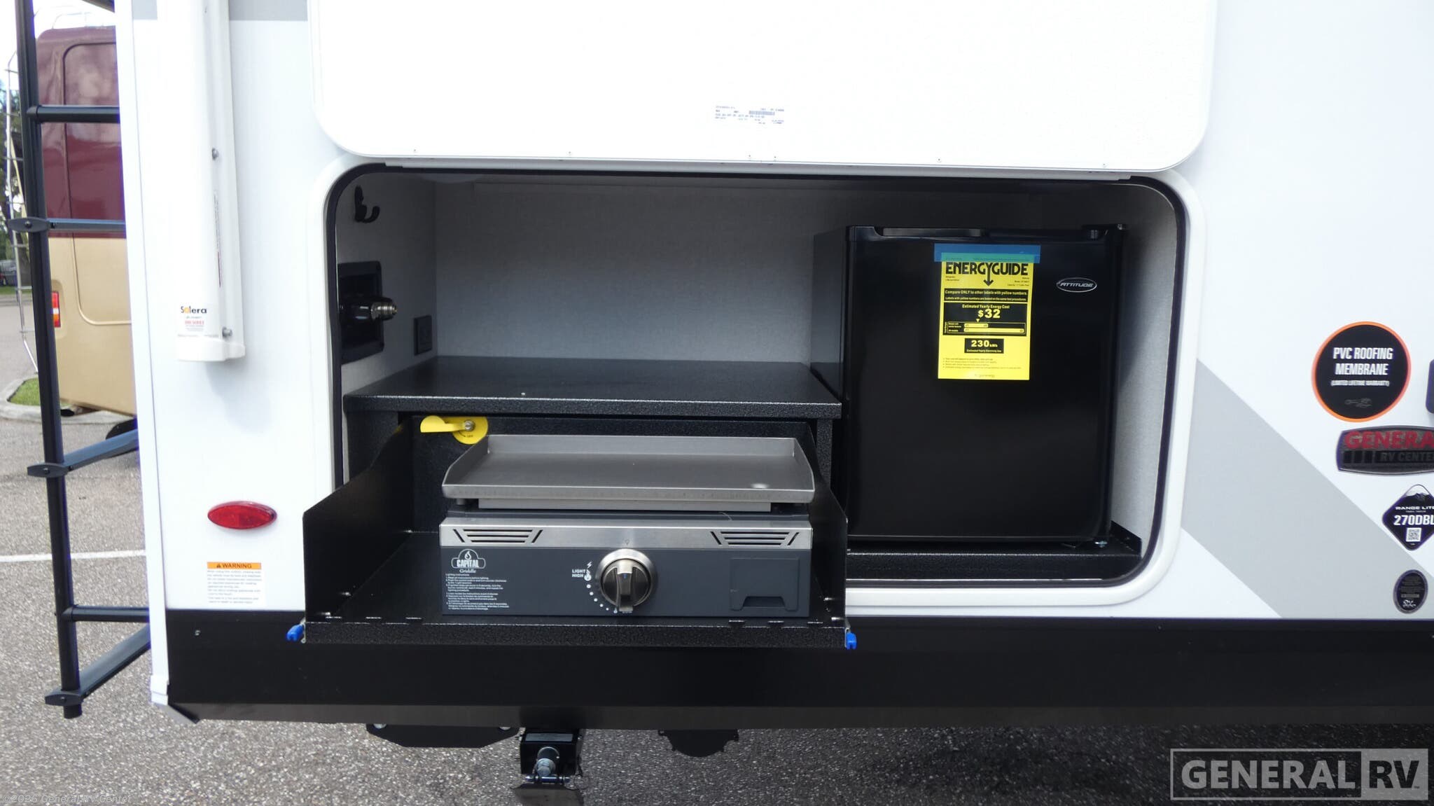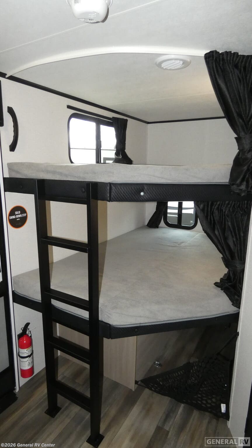 Discover the 2026 Highland Ridge Range Lite 270DBL, a travel trailer that combines comfort and functionality with a touch of elegance. With its spacious layout, this RV is perfect for families or groups, offering sleeping accommodations for up to 10 people. The double bunks with flip-up storage and the inviting queen bed ensure everyone has a cozy spot to rest. The tri-fold sofa and U-dinette create a welcoming space for relaxation and dining, while the entertainment center with a fireplace adds a warm ambiance to your evenings. The Range Lite 270DBL is designed for both adventure and convenience. An outdoor kitchen, complete with a pull-out griddle and fridge, allows you to enjoy al fresco dining under the 20-foot awning. Inside, a walk-in pantry provides ample storage for your culinary essentials. The RV's robust build, featuring an American-made Norco Z-frame chassis, ensures a smooth and reliable journey. With a generous fresh water capacity of 55 gallons and ample gray and black water storage, this trailer is ready for extended trips. For more information or to experience this model in person, visit your nearest General RV dealership.