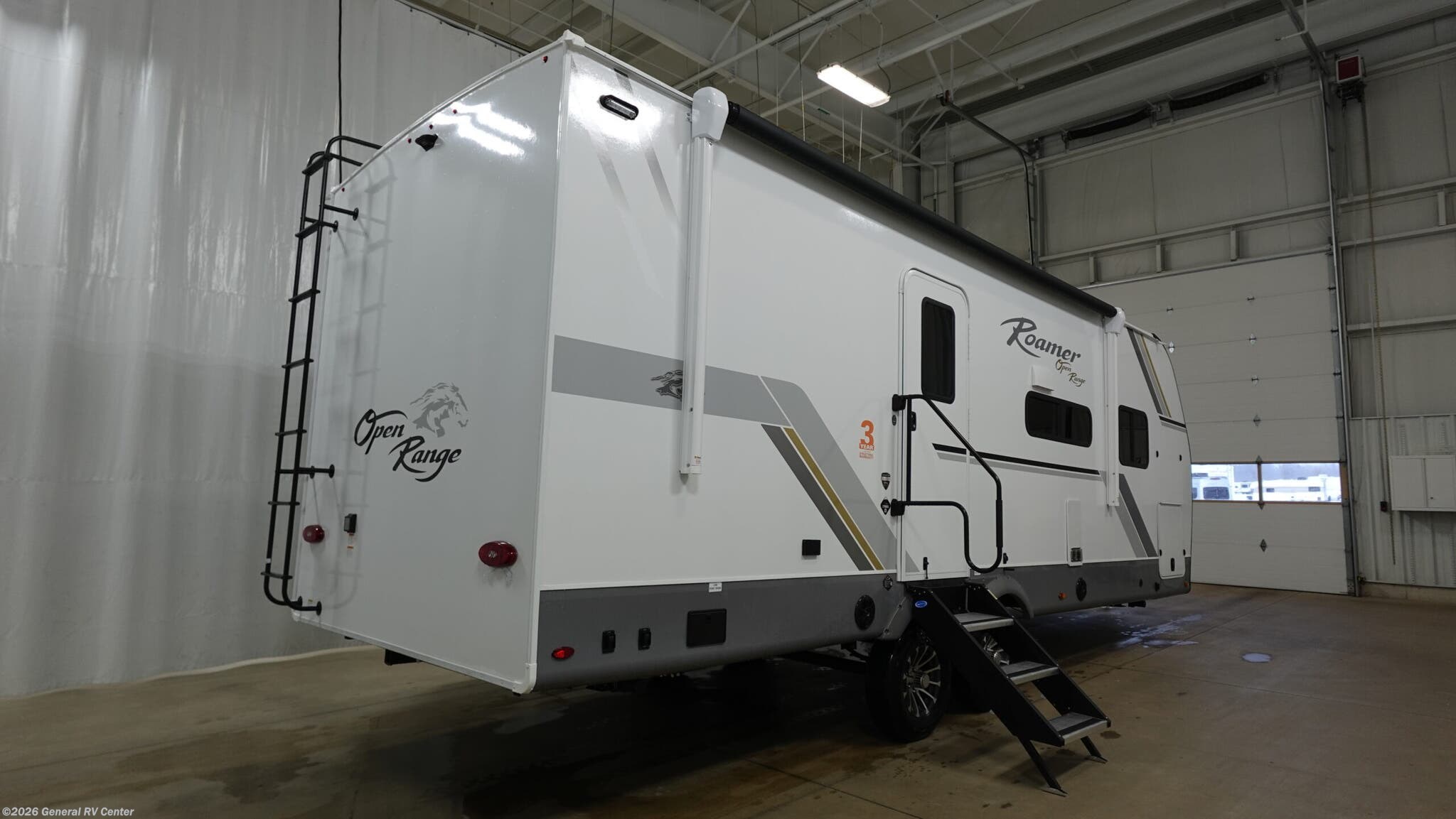 Open Range RV Roamer Light Duty travel trailer 27RBOS highlights: Large Slide Out Full Rear Bath Olympic Queen Bed 12V Refrigerator Walk-in Pantry behind TV You'll love camping in this spacious travel trailer with a full rear bath and a front private bedroom. There is generous counter space in the bathroom, along with a 30" x 48" shower with a skylight for more standing space. An Olympic queen bed is found in the bedroom, plus dual wardrobes for your clothes and TV prep if you want the option to watch movies in bed. If you have any guests staying over, they can sleep on the tri-fold sofa with cupholders, and in the morning you can make breakfast for everyone on the three-burner cooktop. The table and chairs with a bench will provide comfy seating spaces, or you can take your plate outdoors to sit under the 16' electric awning! With any Roamer Light Duty travel trailer or fifth wheel by Open Range RV, you will enjoy a lighter tow weight, while still enjoying at-home comforts and conveniences! The TuffShell vacuum bonded laminated construction is reinforced with heavy-duty fiberglass and welded aluminum frames, helping extend the life of your RV. You will also appreciate the Thermal Seal zero-degree tested weather protection plus the Cool Force system for outstanding protection year around. The mandatory Customer Convenience Package includes many hassle-free features, such as an on-demand water heater, a Keyed-Alike lock system, and an Xtend l Solar Package with a 200-watt solar panel and 30-amp solar controller for off-grid power when you need it. Each Roamer Light Duty also includes residential vinyl flooring throughout, USB and USB-C 12V charging ports with multiple locations throughout, 100% no floor heat vents, and 4" interior ceiling can lighting with 4000k lumen to keep your space well illuminated!