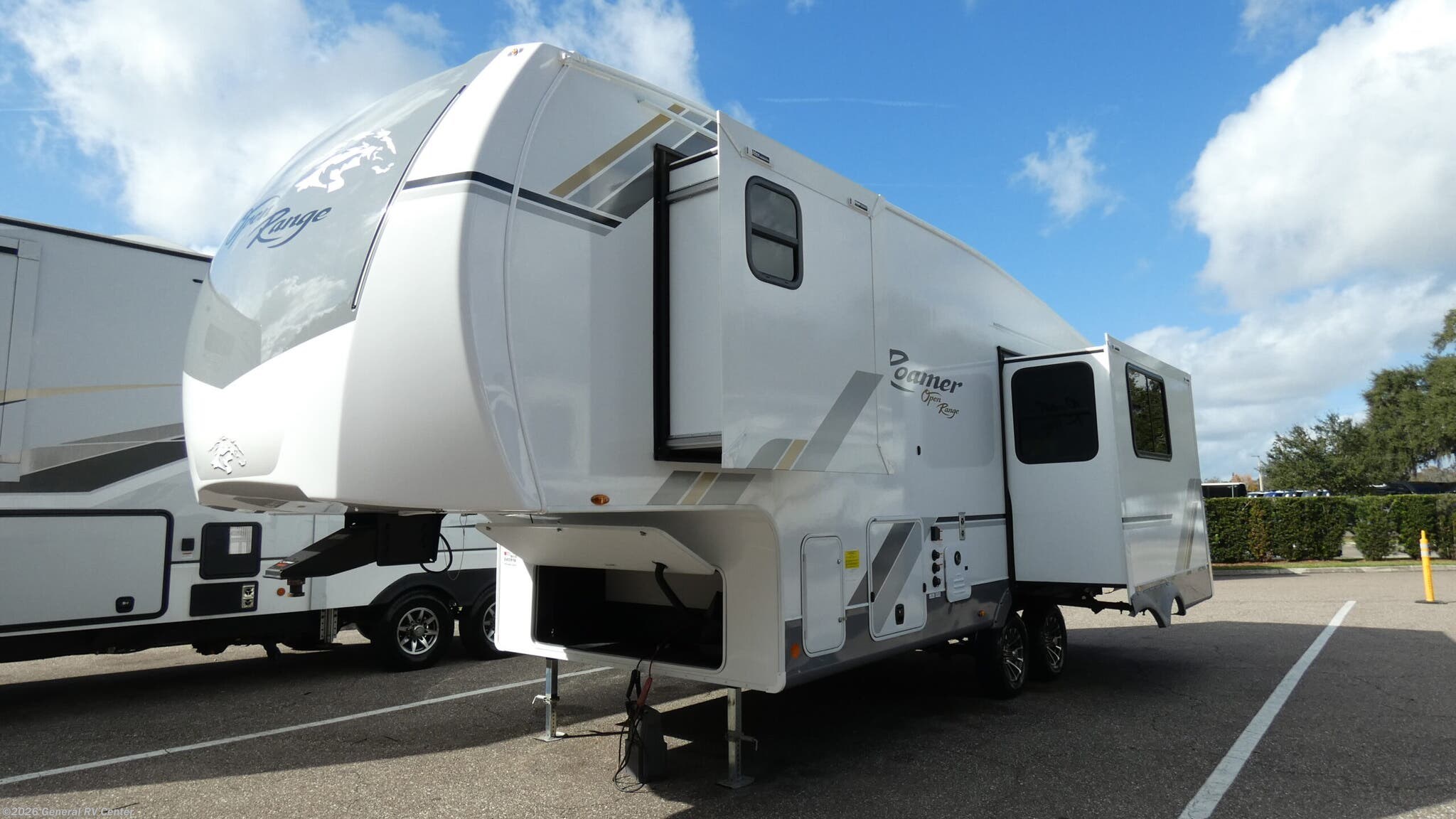 Open Range RV Roamer Light Duty fifth wheel 24MLDS highlights: Queen Bed Exterior Storage Booth Dinette Kitchen Pantry Pack your bags and head to the campground in this rear kitchen fifth wheel! There is ample counter space to prep meals, along with a range and over-the-range microwave. The booth dinette provides a place to dine together, and the tri-fold sofa will be the perfect place to relax in the evenings. There is also a Smart TV across from the sofa to make movie nights complete! The centrally located full bath includes a 30" x 36" shower with a skylight to give you more head room as you get ready each day, and the front private bedroom with a wardrobe slide gives you more space to get dressed in the morning. There is also a queen bed here, dual nightstands, TV prep, and additional storage for shoes and clothes! With any Roamer Light Duty travel trailer or fifth wheel by Open Range RV, you will enjoy a lighter tow weight, while still enjoying at-home comforts and conveniences! The TuffShell vacuum bonded laminated construction is reinforced with heavy-duty fiberglass and welded aluminum frames, helping extend the life of your RV. You will also appreciate the Thermal Seal zero-degree tested weather protection plus the Cool Force system for outstanding protection year around. The mandatory Customer Convenience Package includes many hassle-free features, such as an on-demand water heater, a Keyed-Alike lock system, and an Xtend l Solar Package with a 200-watt solar panel and 30-amp solar controller for off-grid power when you need it. Each Roamer Light Duty also includes residential vinyl flooring throughout, USB and USB-C 12V charging ports with multiple locations throughout, 100% no floor heat vents, and 4" interior ceiling can lighting with 4000k lumen to keep your space well illuminated!