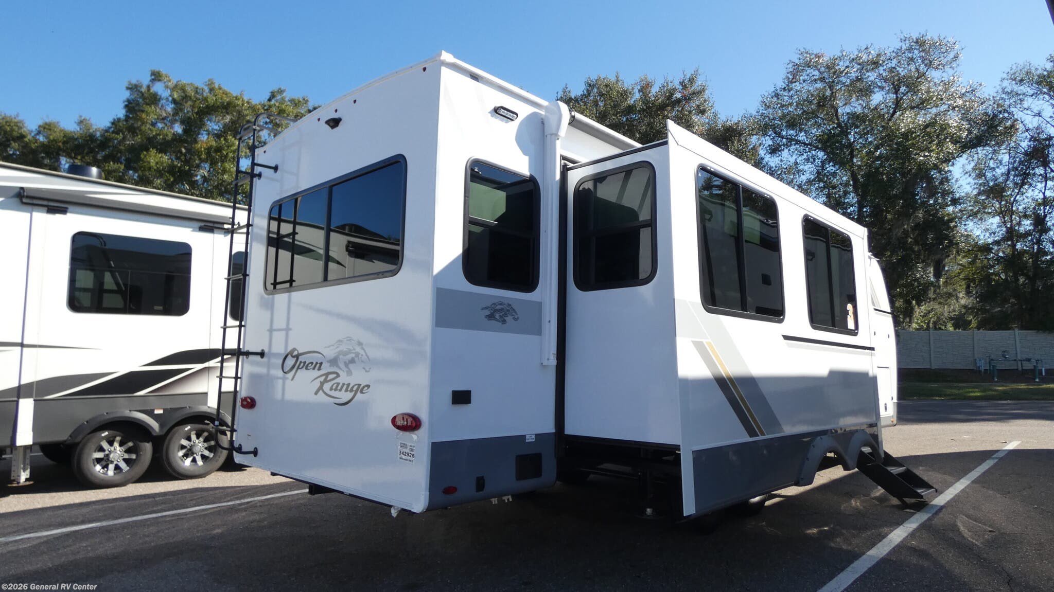 Open Range RV Roamer Light Duty travel trailer 29RLTS highlights: Kitchen Island Front Private Bedroom Dual Opposing Slides 30" x 36" Shower with a Skylight Your crew of four will love spending time at the campground in this travel trailer with a rear living area! Here, you can let your guests sleep on the tri-fold sofa, dine at the table and chairs with a bench, and relax on the theater seat, which is directly across from the entertainment center with a fireplace. The chef of your group will love the kitchen island for more prep space, plus a 12V refrigerator, pantry and hutch for extra storage. The full bath is spacious, allowing you plenty of space to freshen up each day, and the front private bedroom with an Olympic queen bed is sure to bring a great night's rest. And the bedroom includes a wardrobe with washer and dryer prep if you want to add these appliances! With any Roamer Light Duty travel trailer or fifth wheel by Open Range RV, you will enjoy a lighter tow weight, while still enjoying at-home comforts and conveniences! The TuffShell vacuum bonded laminated construction is reinforced with heavy-duty fiberglass and welded aluminum frames, helping extend the life of your RV. You will also appreciate the Thermal Seal zero-degree tested weather protection plus the Cool Force system for outstanding protection year around. The mandatory Customer Convenience Package includes many hassle-free features, such as an on-demand water heater, a Keyed-Alike lock system, and an Xtend l Solar Package with a 200-watt solar panel and 30-amp solar controller for off-grid power when you need it. Each Roamer Light Duty also includes residential vinyl flooring throughout, USB and USB-C 12V charging ports with multiple locations throughout, 100% no floor heat vents, and 4" interior ceiling can lighting with 4000k lumen to keep your space well illuminated!