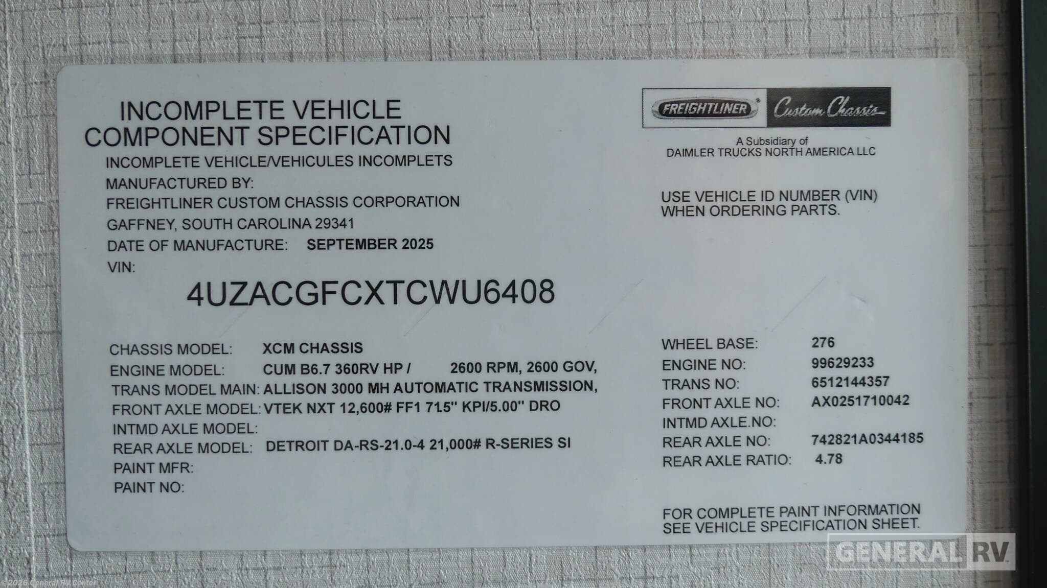 - VIN4UZACGFCXTCWU6408